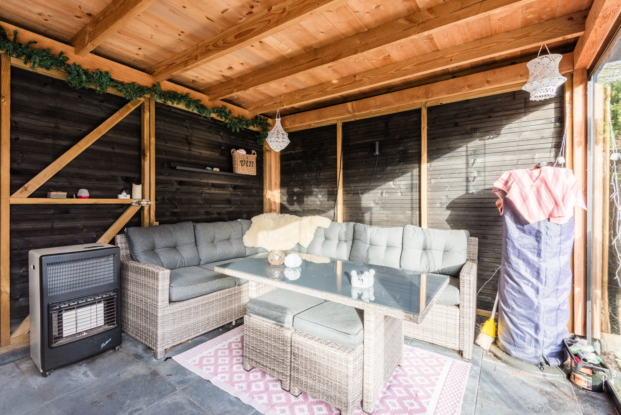 De onderhoudsvriendelijke achtertuin is netjes aangelegd met een groot betegeld terras met achterin de tuin een luxe tuinkamer met glazen schuifwanden en geschakelde houten berging welke voorzien is van elektriciteit.