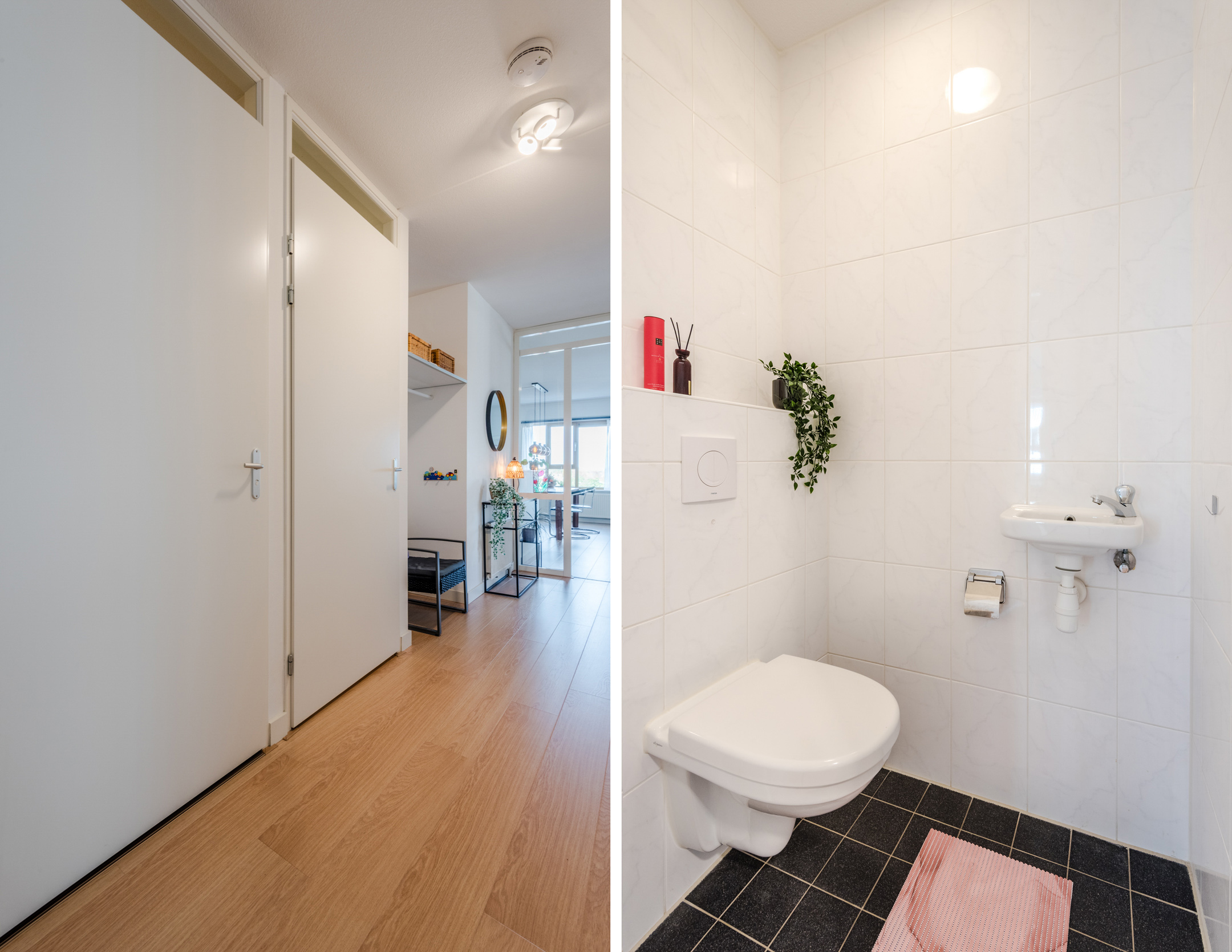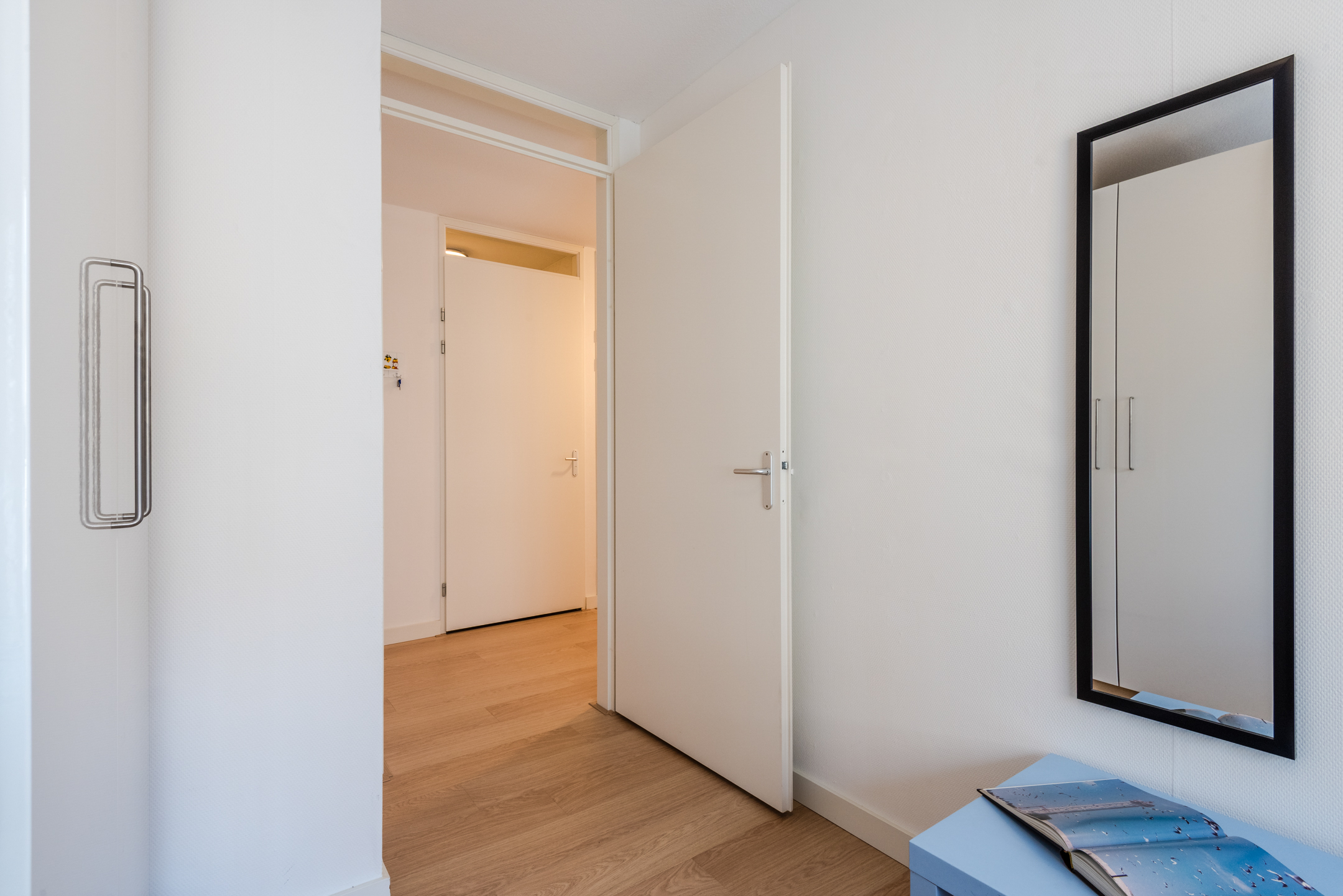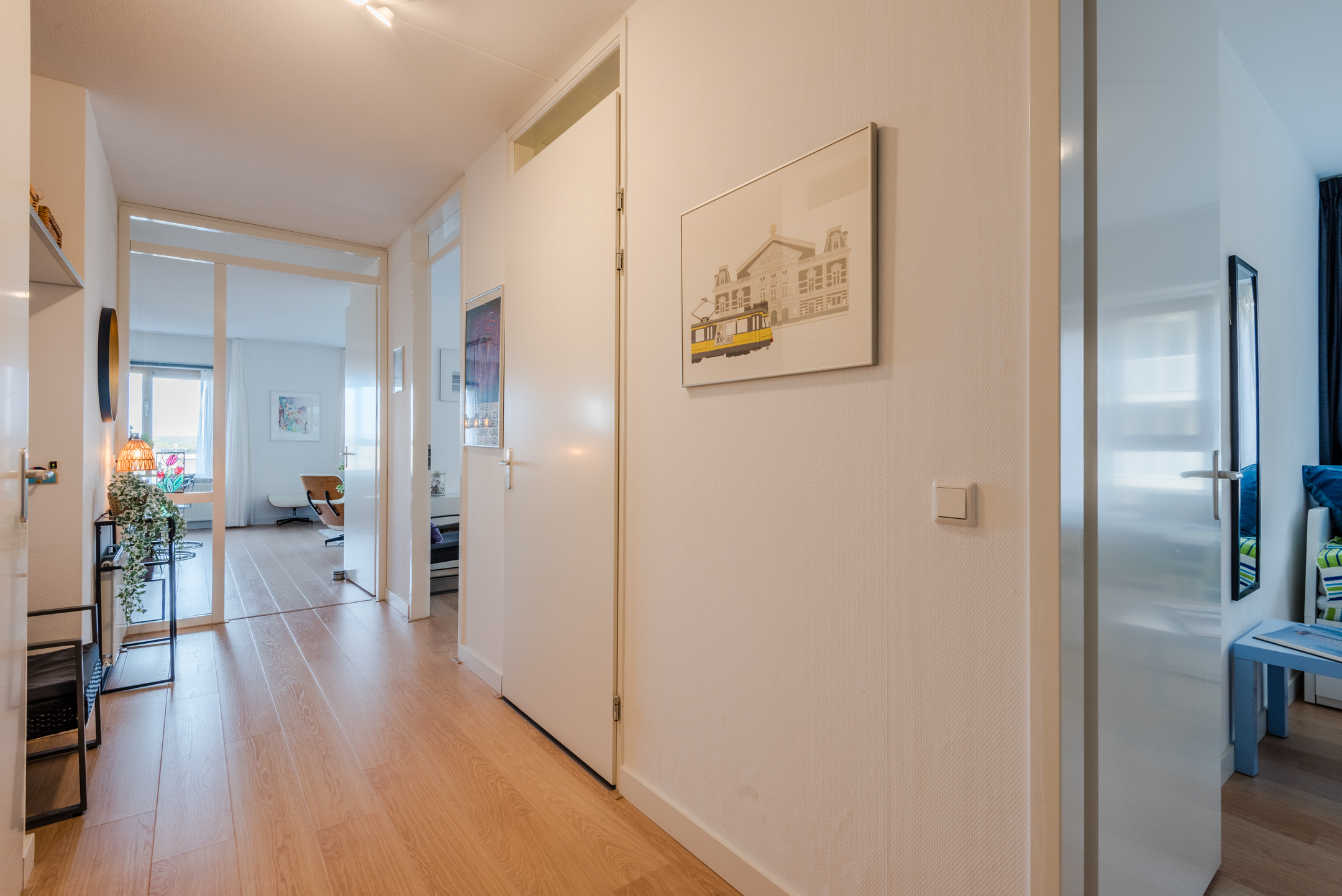 We komen binnen in de langwerpige entreehal die toegang biedt tot alle ruimtes van het appartement.