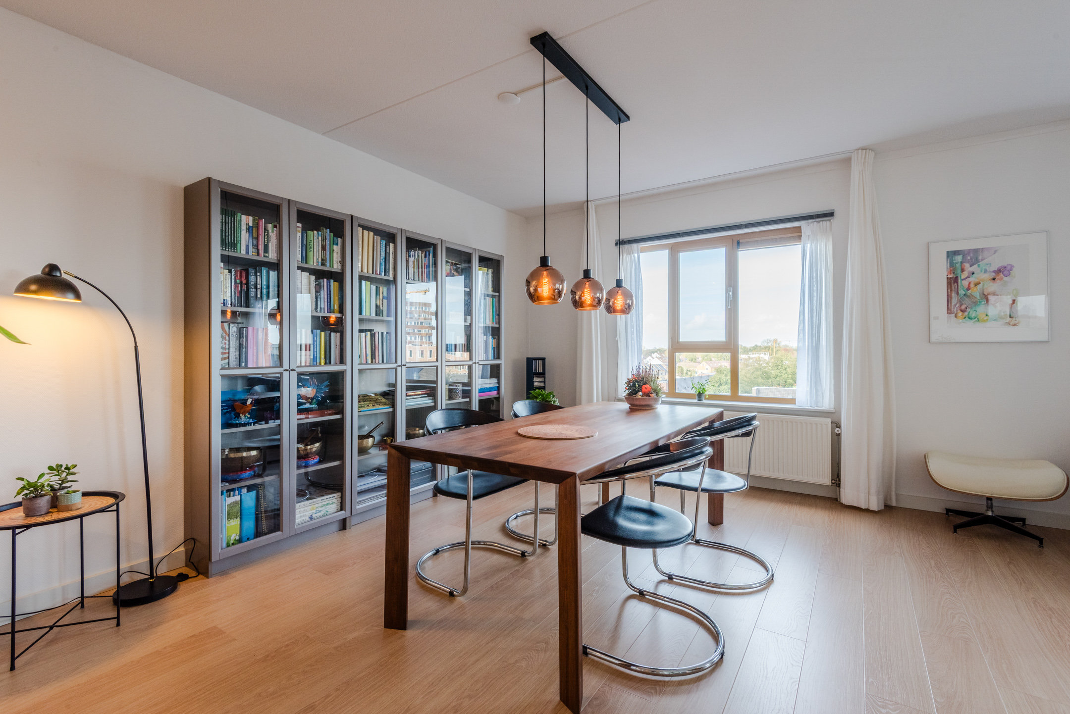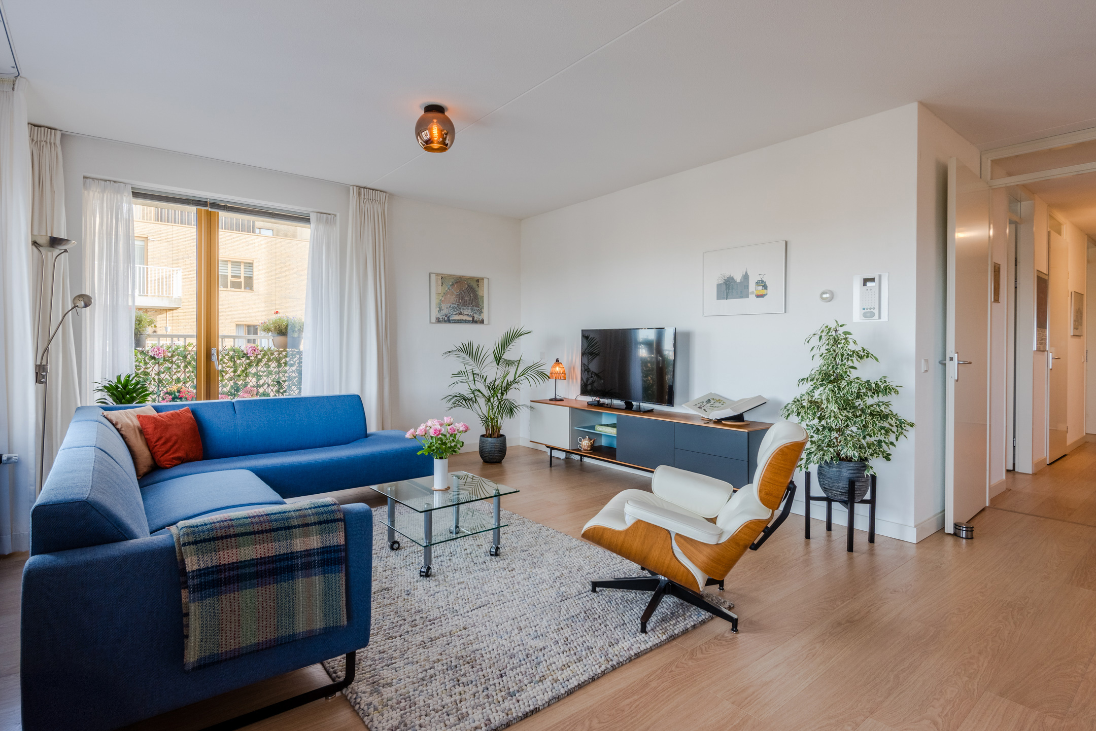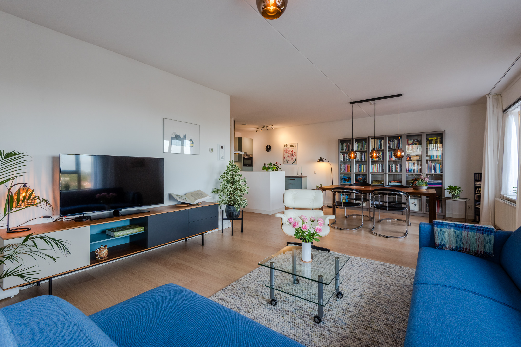 De lichte woonkamer met open keuken geniet door de aanwezigheid van veel raampartijen van een heerlijke lichtinval. Vanuit de woonkamer is er toegang tot het ruime balkon waar je optimaal van de zon kunt genieten.