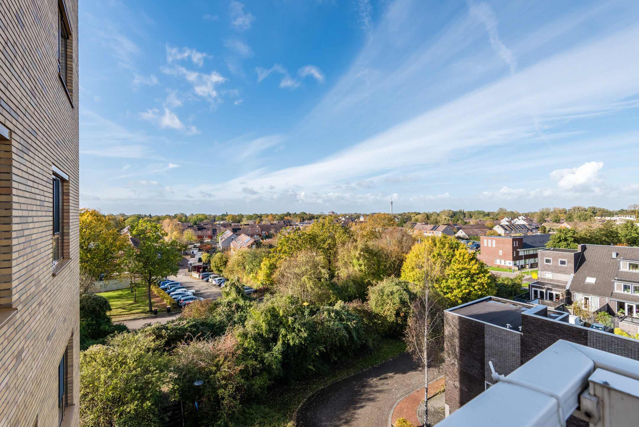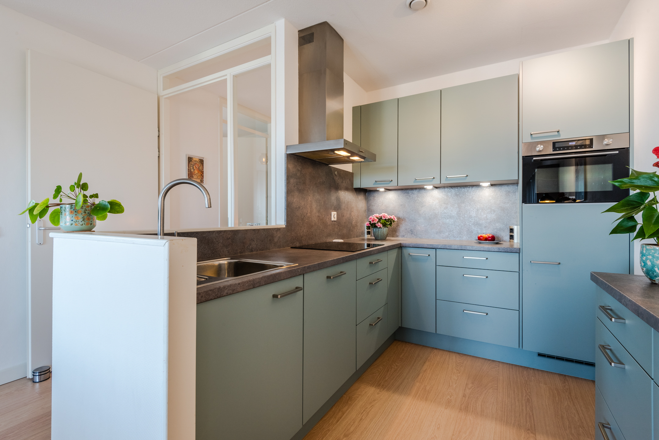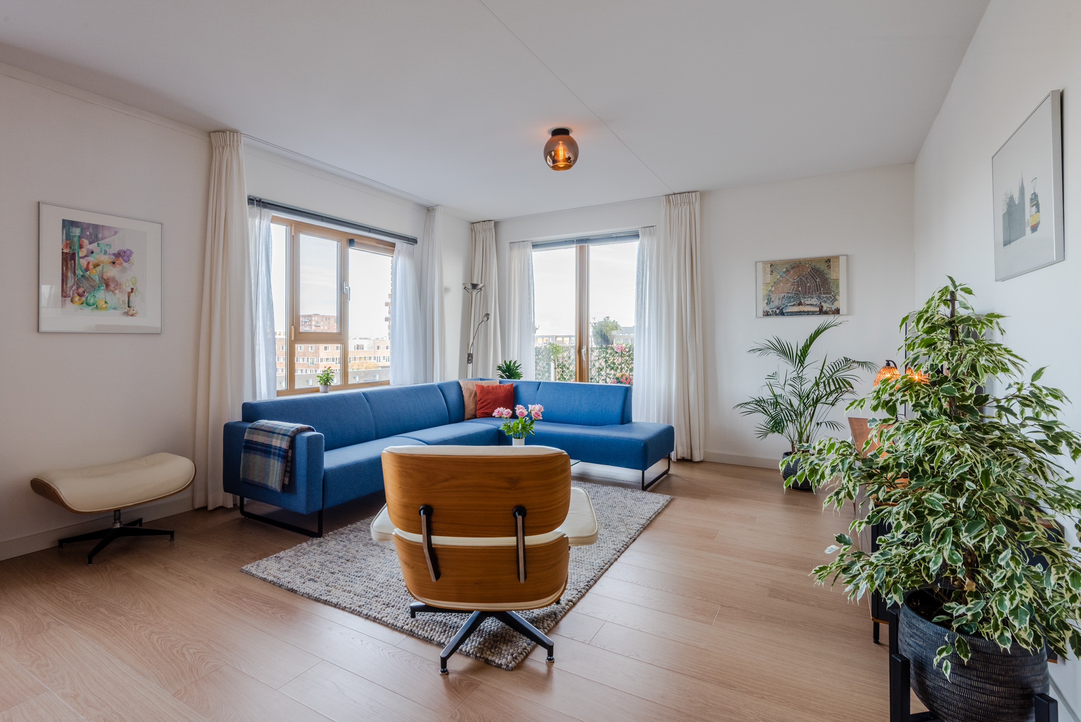 De lichte woonkamer met open keuken geniet door de aanwezigheid van veel raampartijen van een heerlijke lichtinval. Vanuit de woonkamer is er toegang tot het ruime balkon waar je optimaal van de zon kunt genieten.