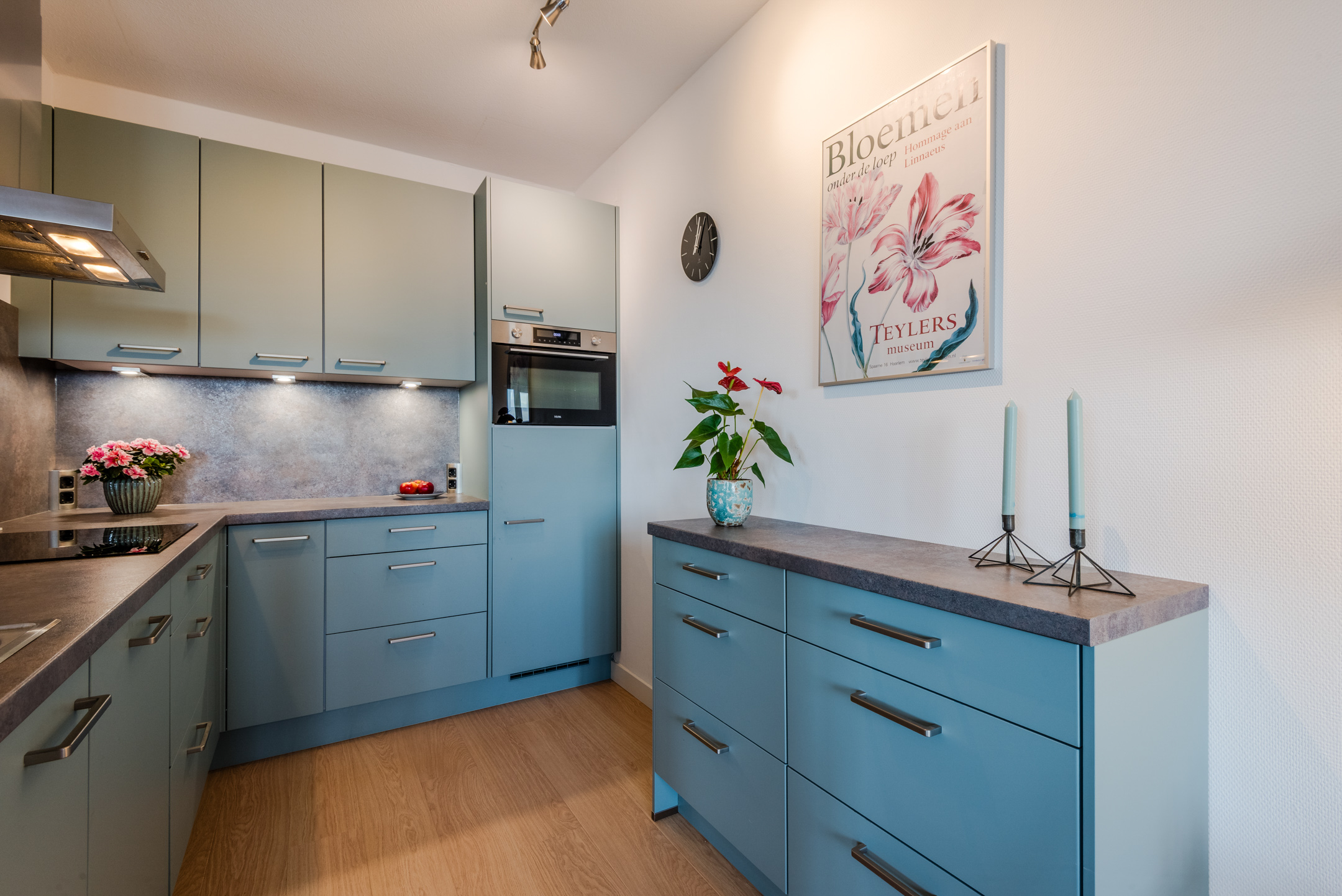 De moderne, L-vormige keuken, VIVARI soft close dec. 2022, is uitgevoerd met moderne inbouwapparatuur.