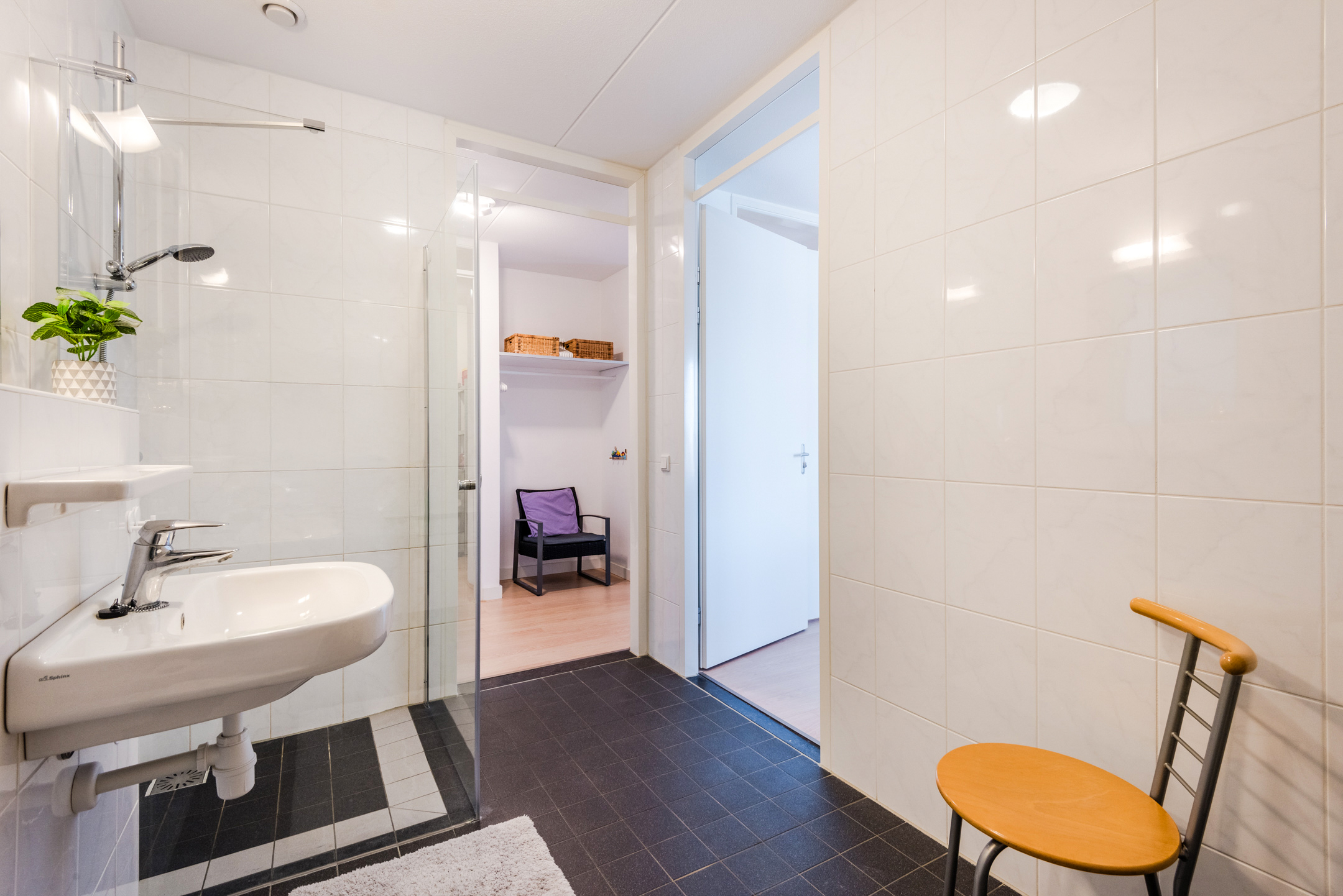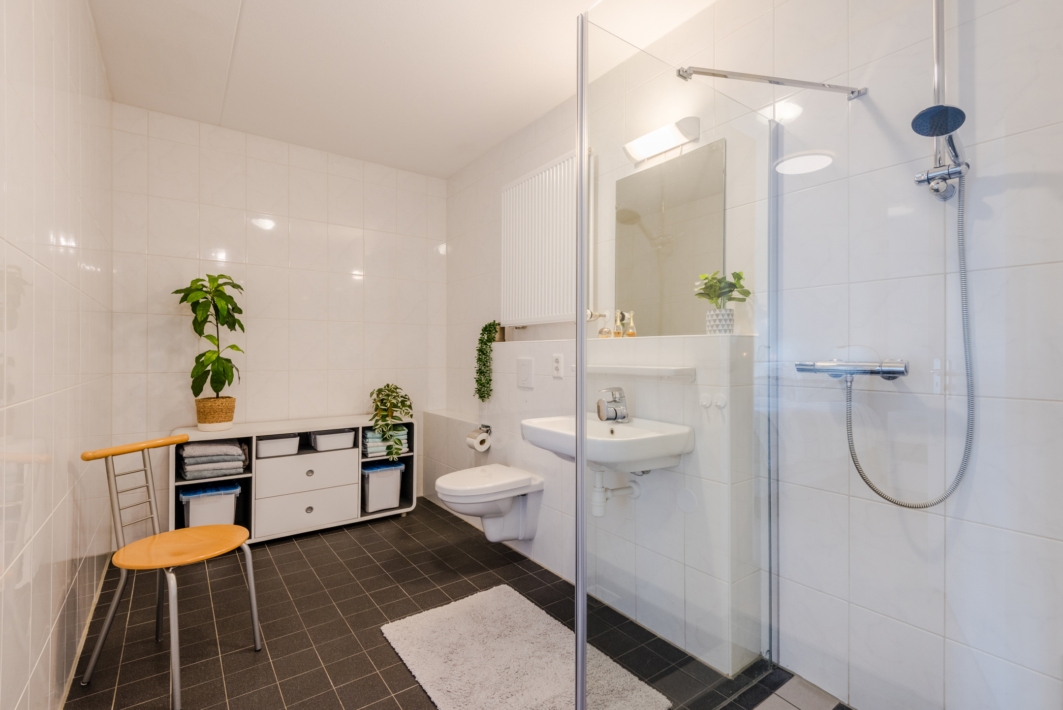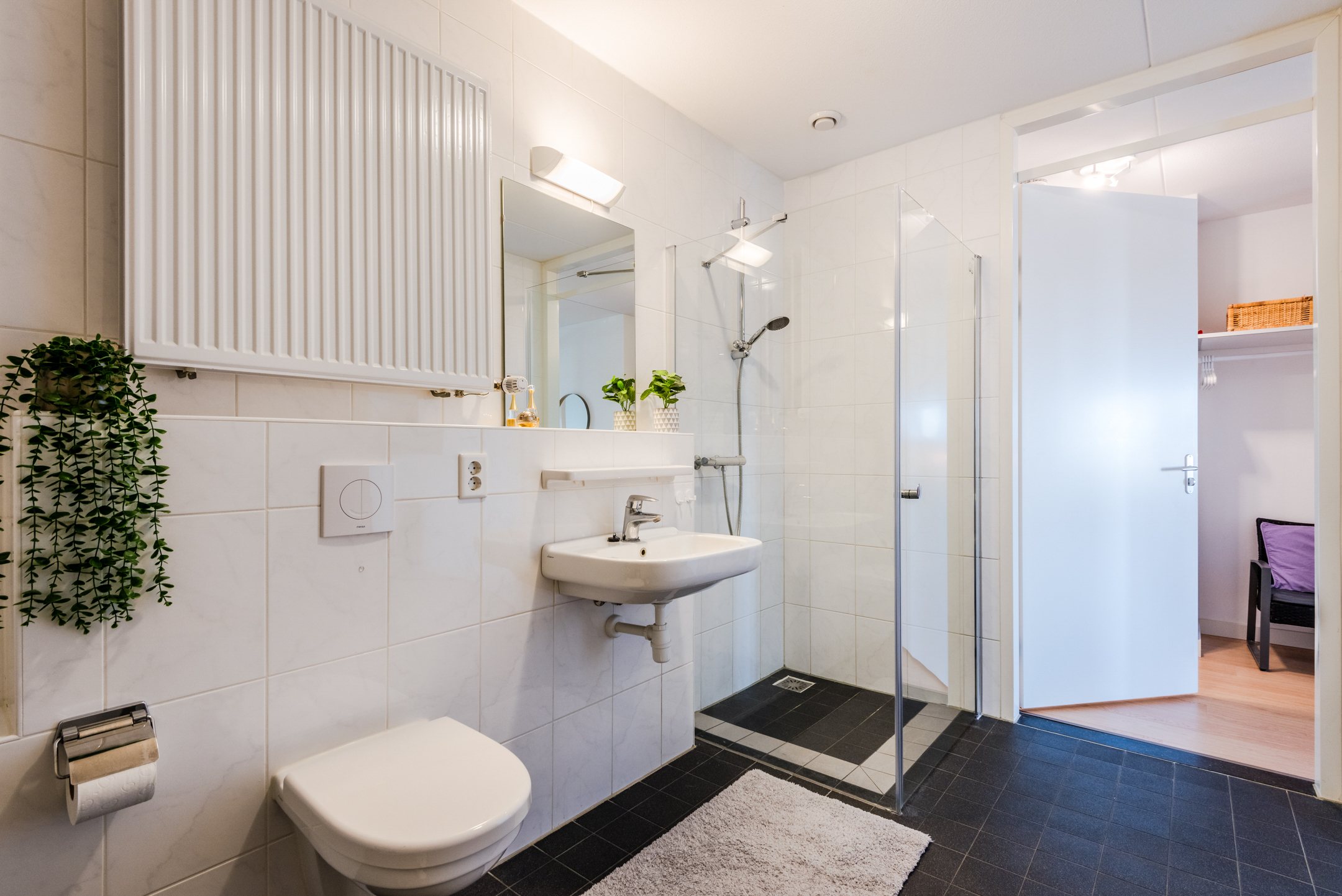 De moderne en complete badkamer beschikt over een zwevend toilet, wastafel en een inloopdouche. Tevens is er een separaat gastentoilet met fonteintje aanwezig in de woning.