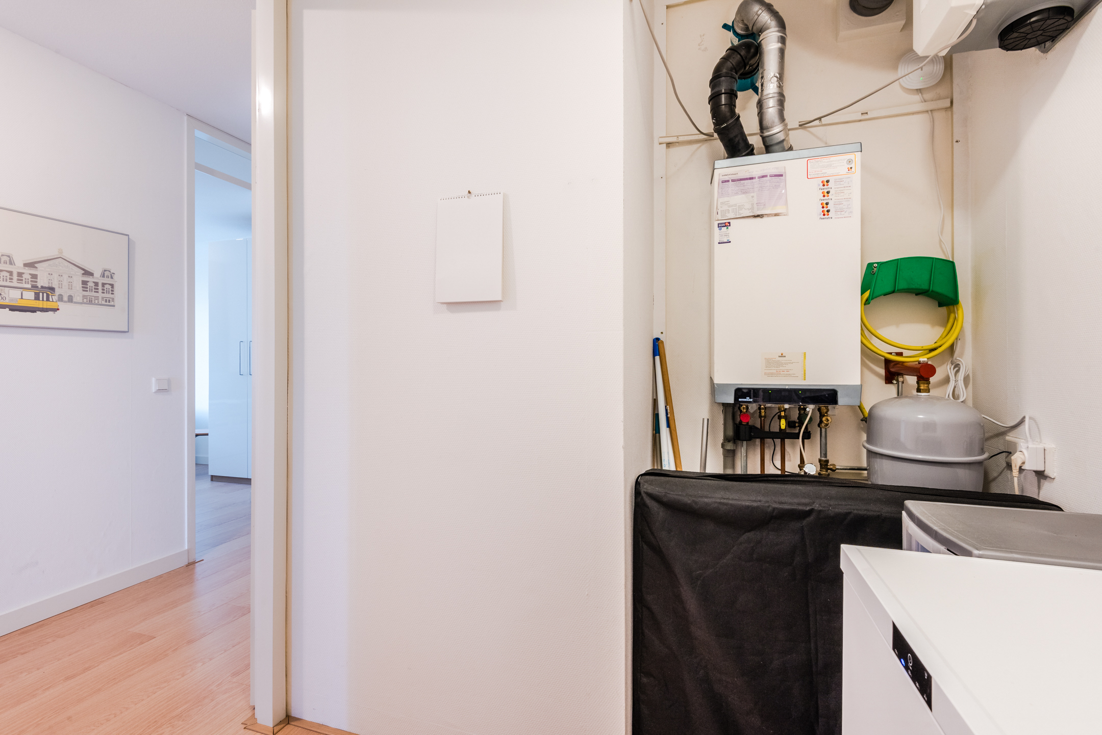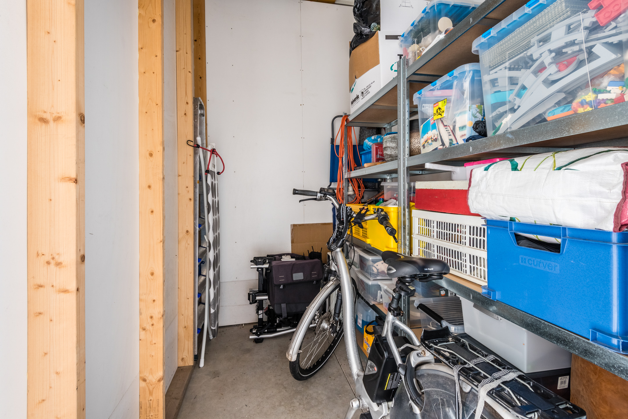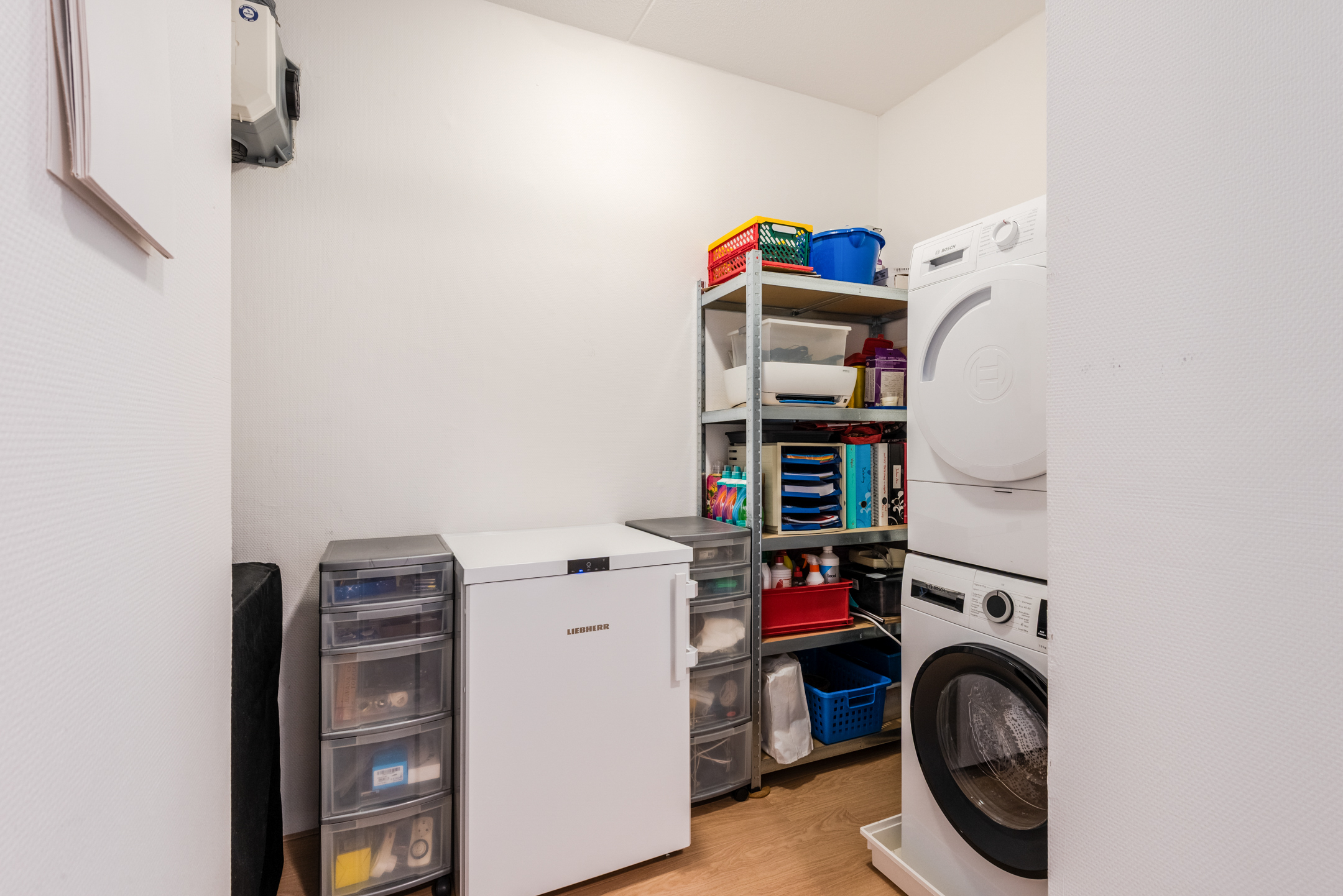 Tegenover de badkamer bevindt zich de ruime inpandige berging met opstelplaats voor de wasmachine en droger.