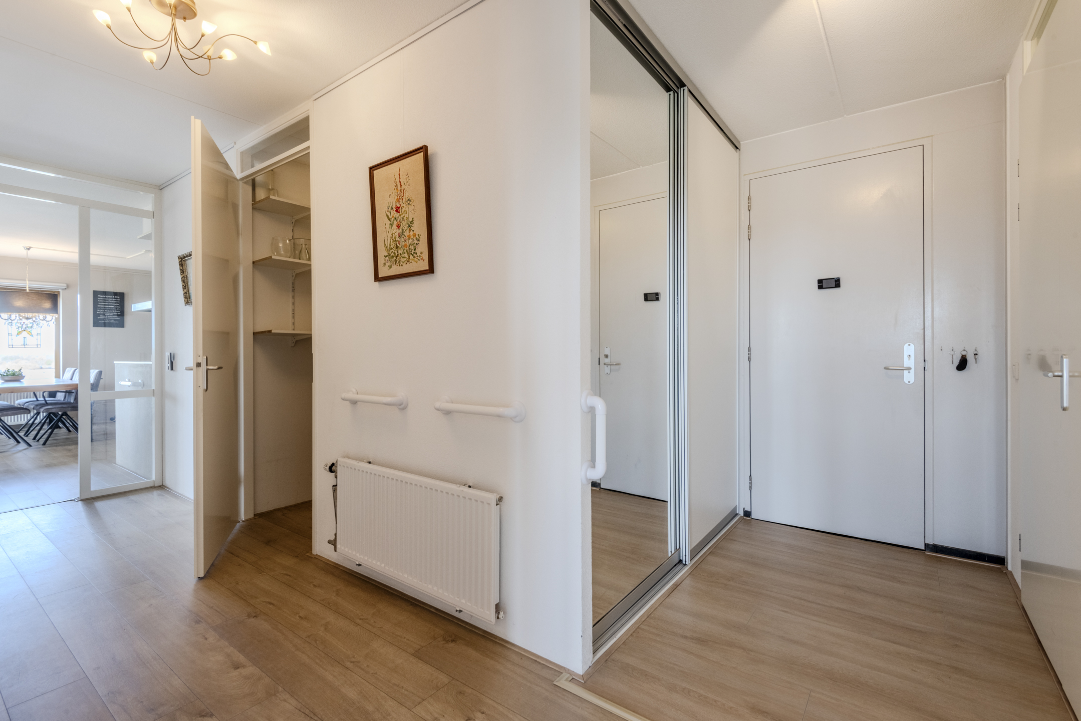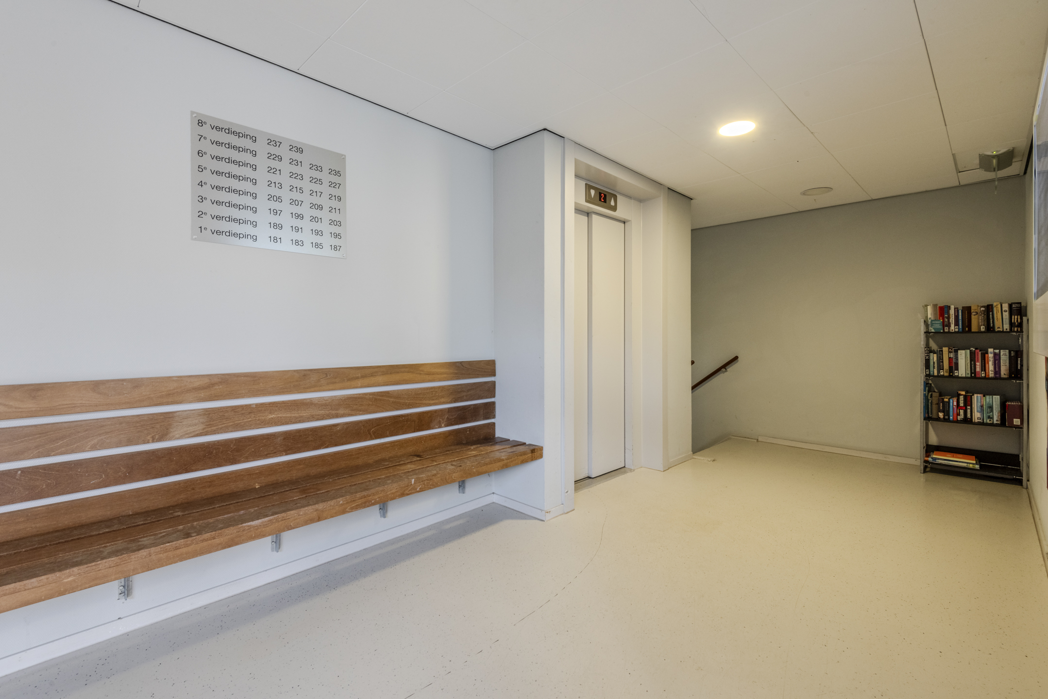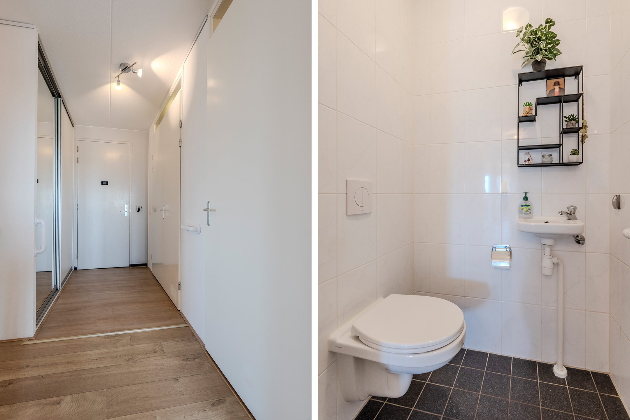 Via het gezamenlijke trappenhuis of de lift, bereiken we het appartement op de zevende etage. We komen binnen in de langwerpige entreehal die toegang biedt tot alle ruimtes van het appartement.