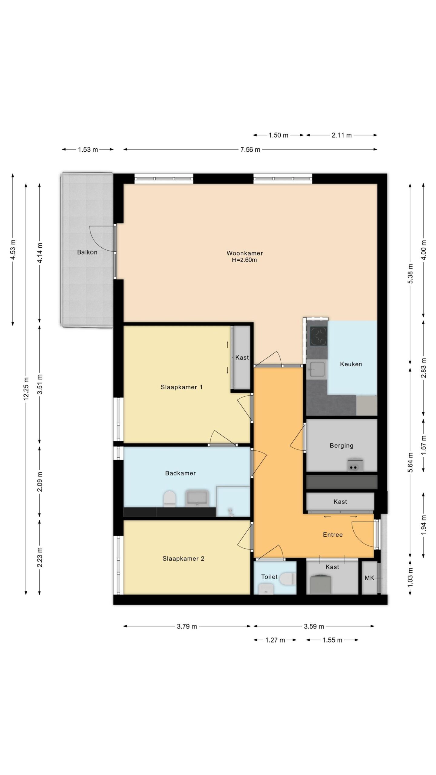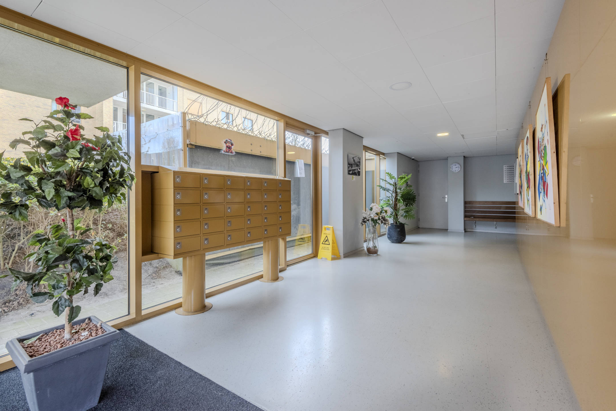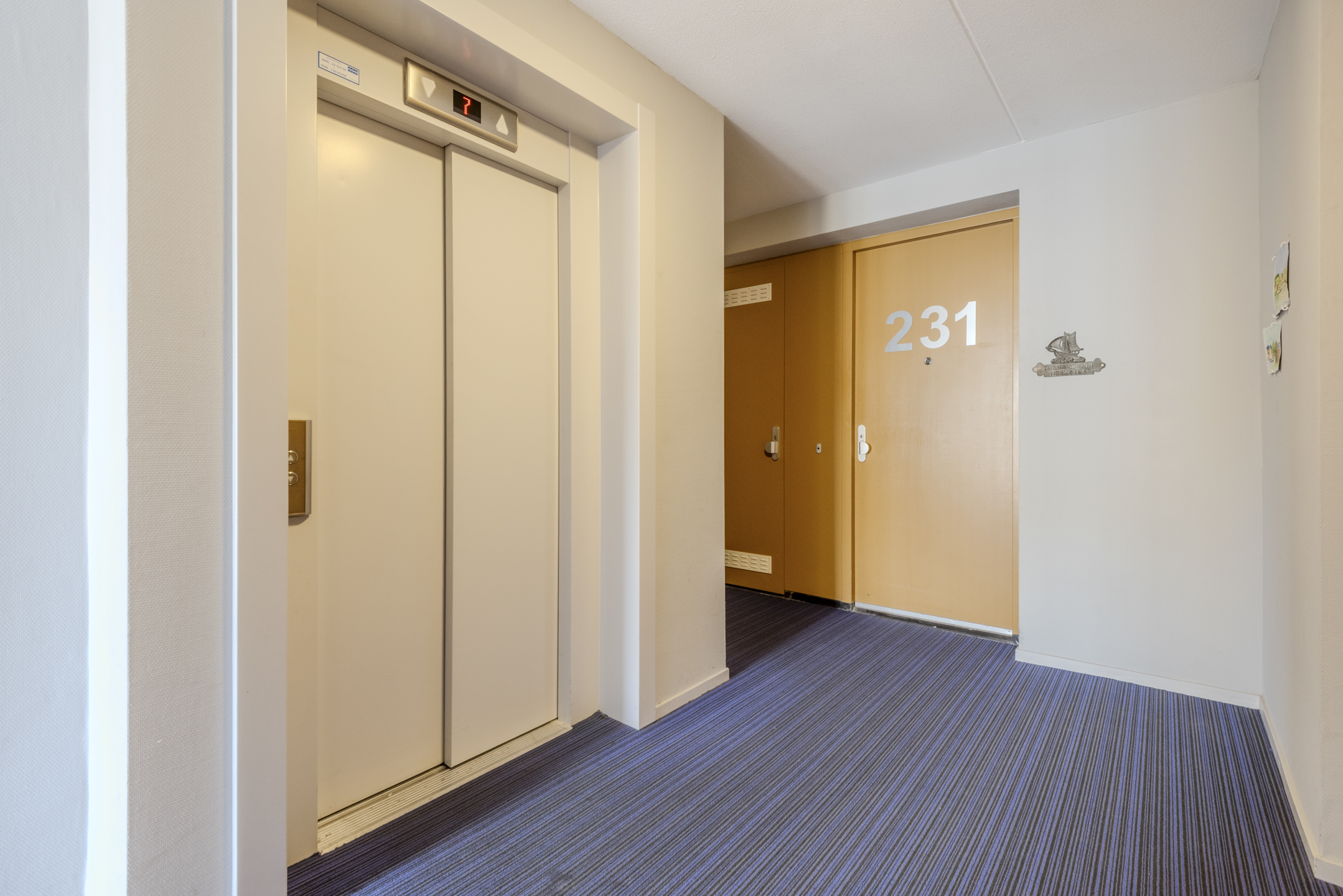 Via het gezamenlijke trappenhuis of de lift, bereiken we het appartement op de zevende etage. We komen binnen in de langwerpige entreehal die toegang biedt tot alle ruimtes van het appartement.