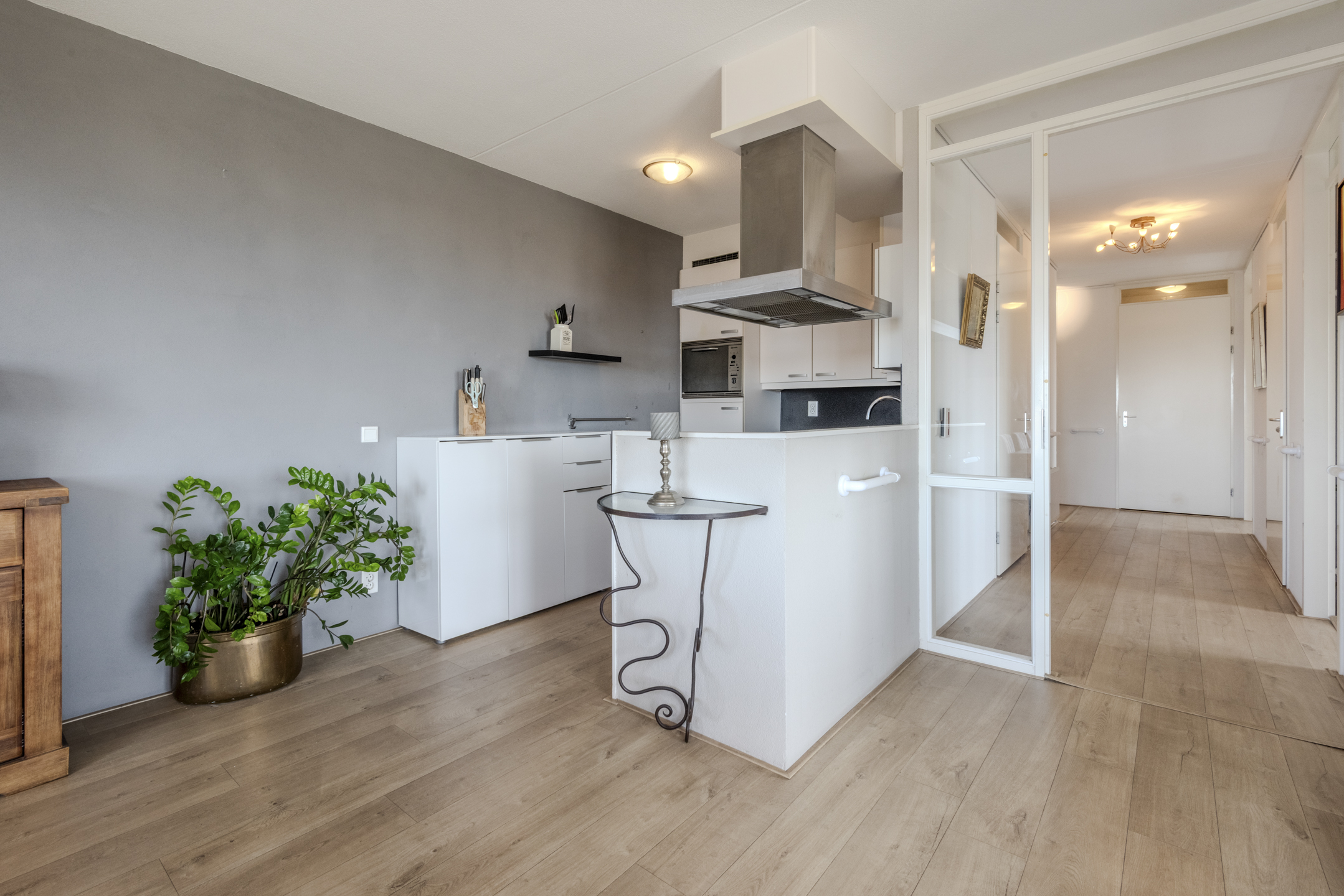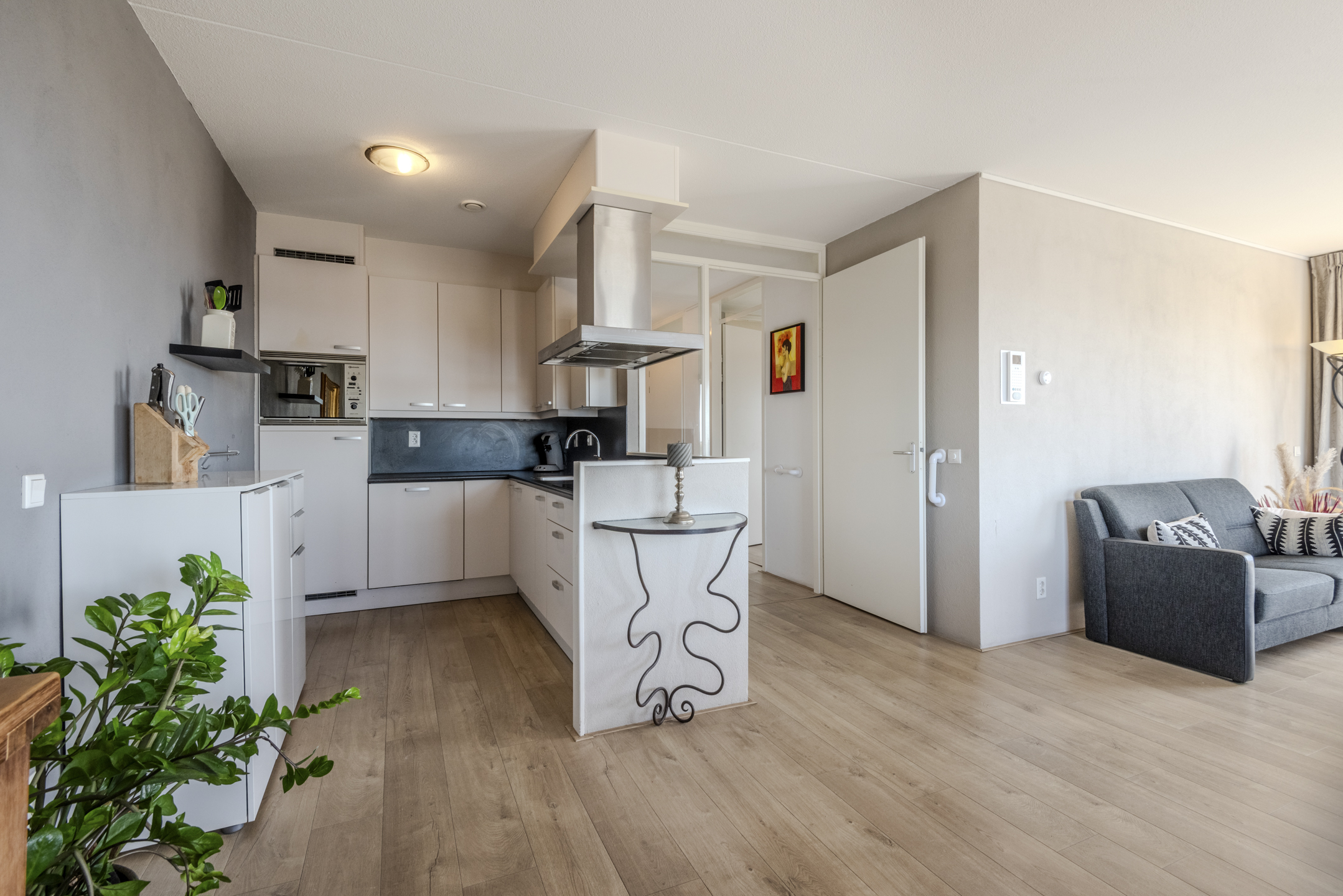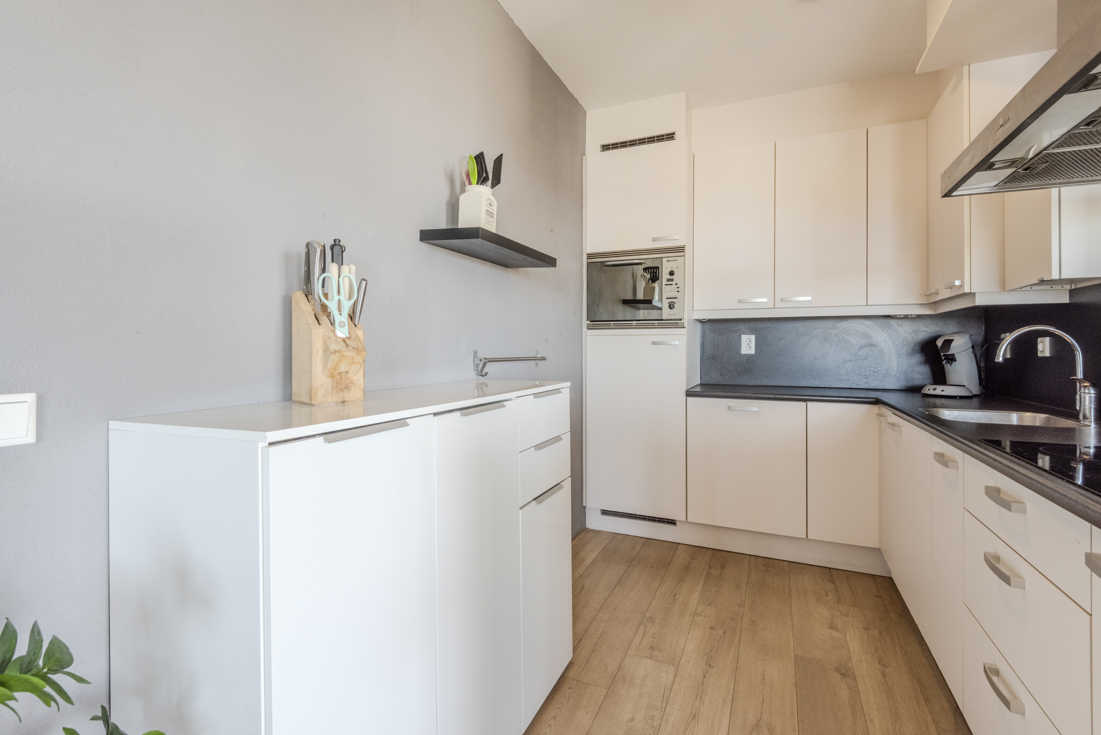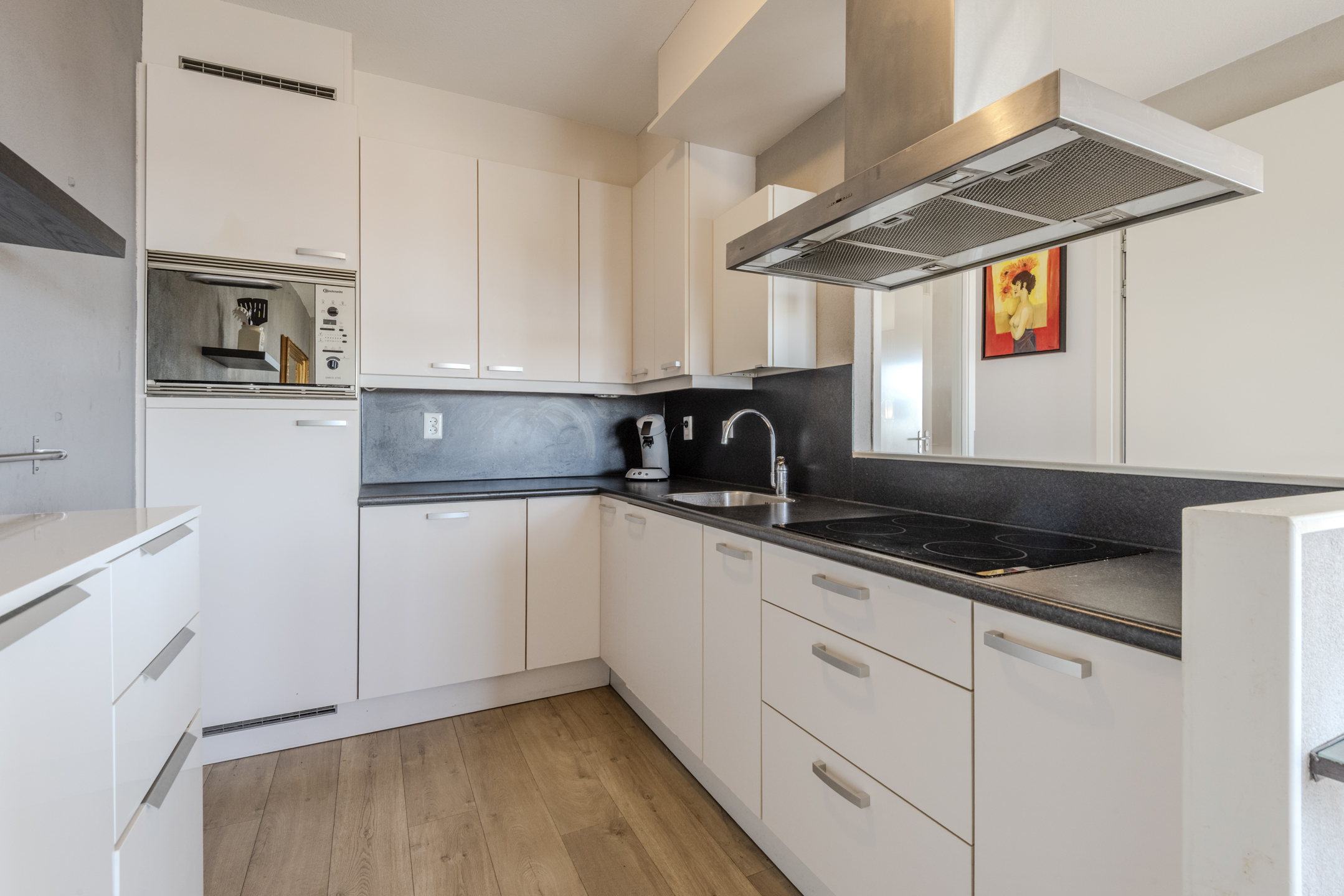 De lichte woonkamer met open keuken is fraai afgewerkt en door de aanwezigheid van grote raampartijen, is het hier heerlijk licht en sfeervol. Vanuit de woonkamer is er toegang tot het zonnige balkon op het westen dat van een mooi en vrij uitzicht geniet en voorzien is van een elektrisch zonnescherm.
