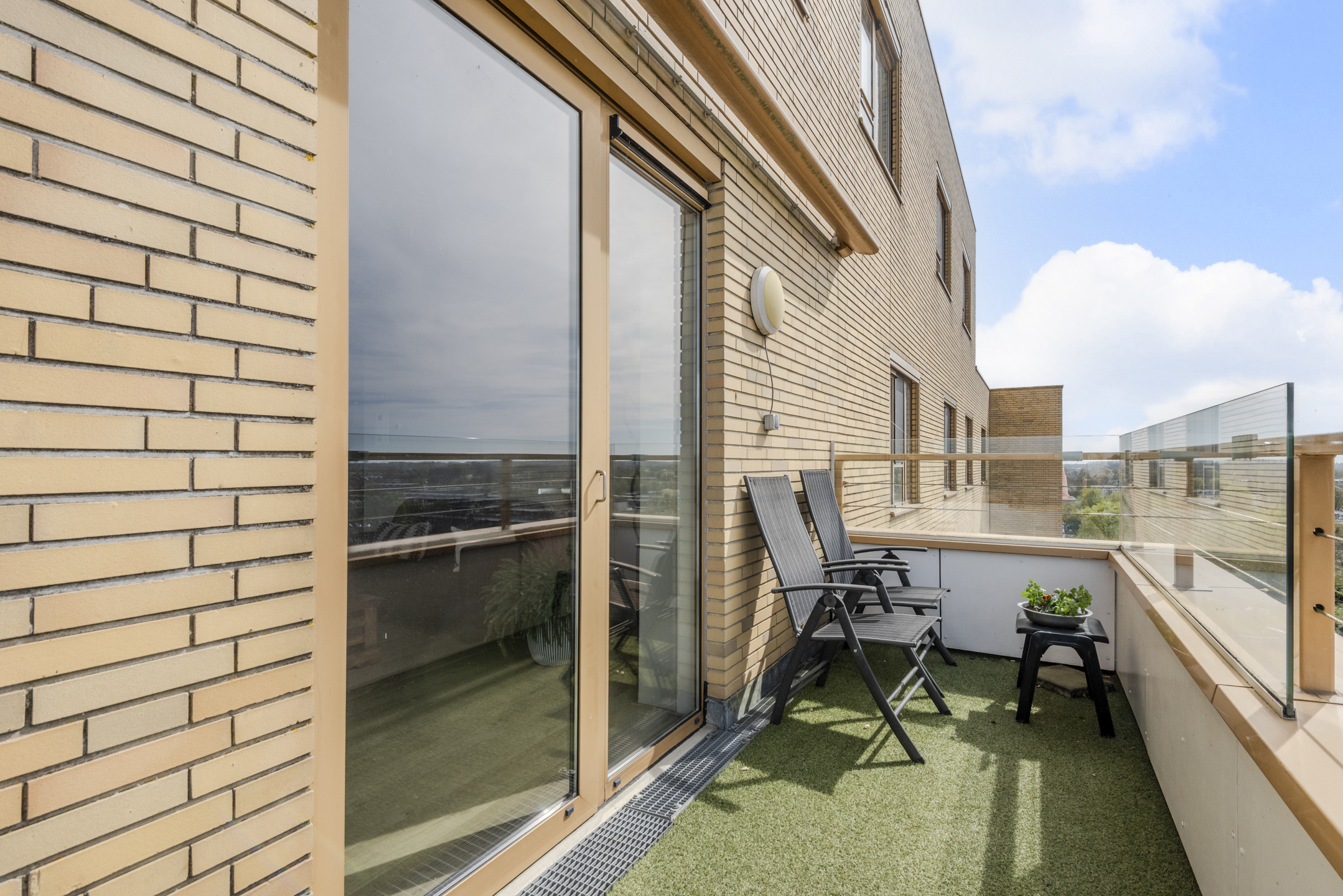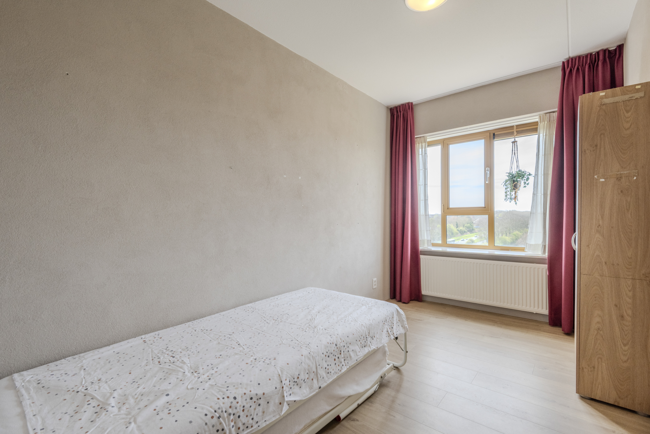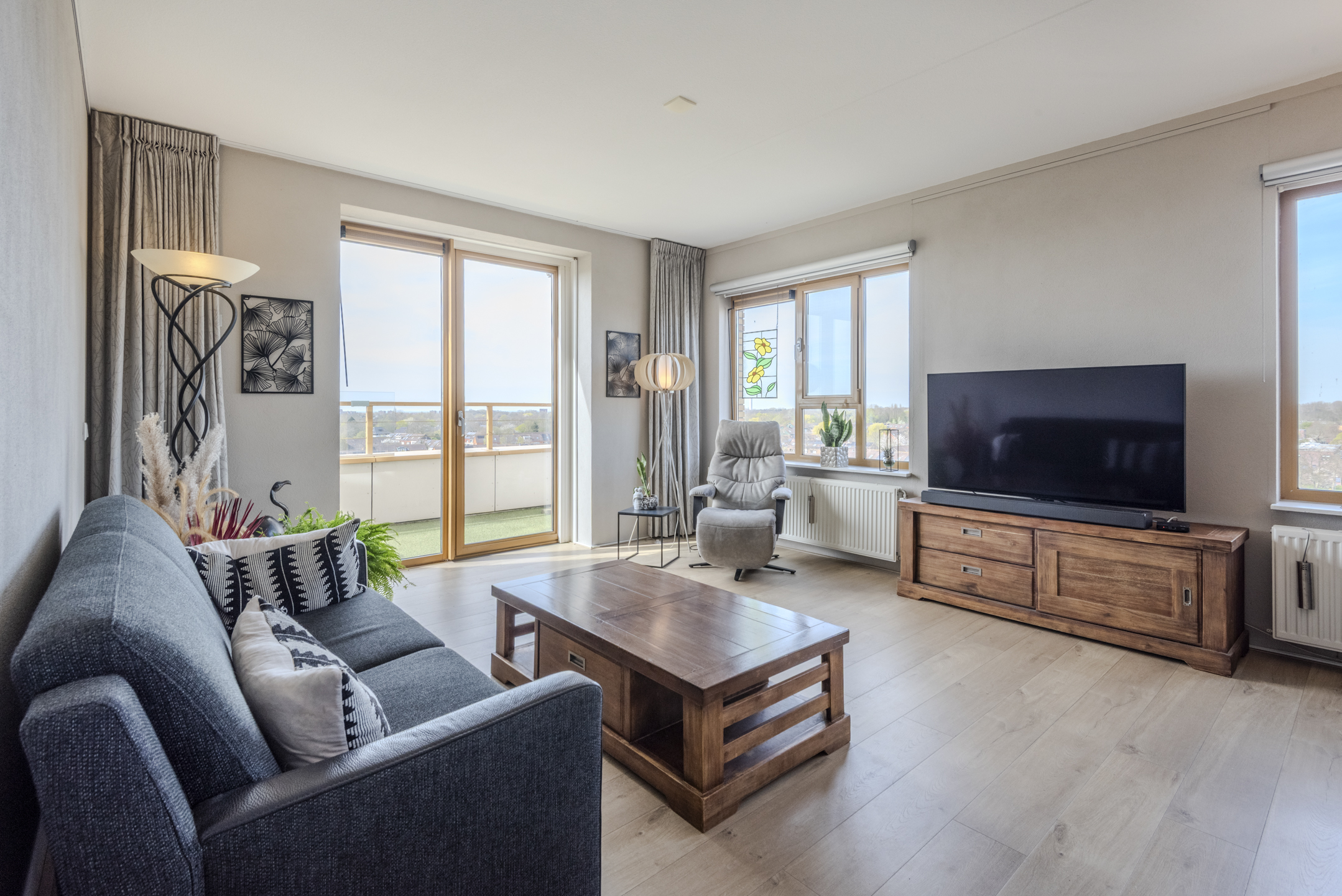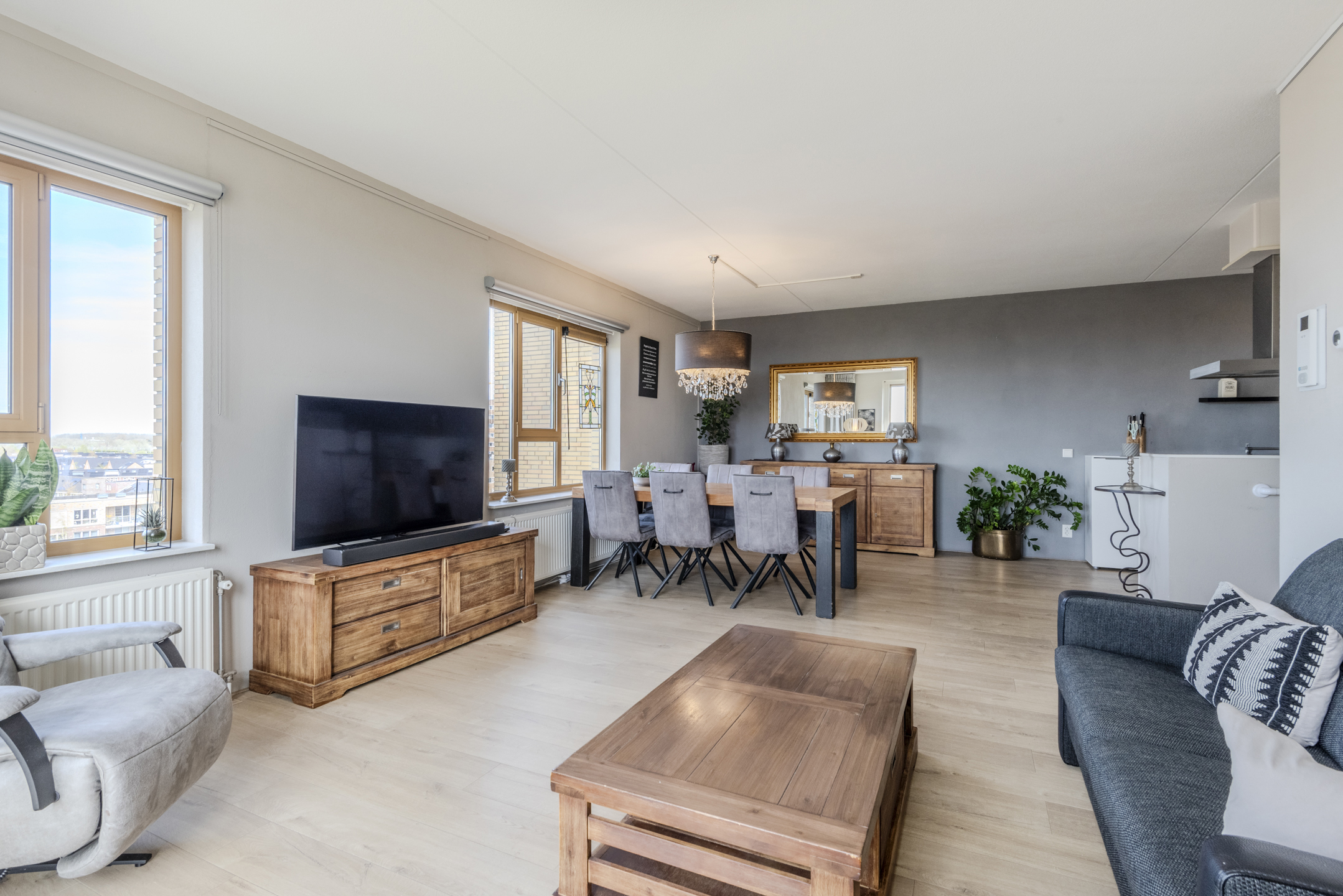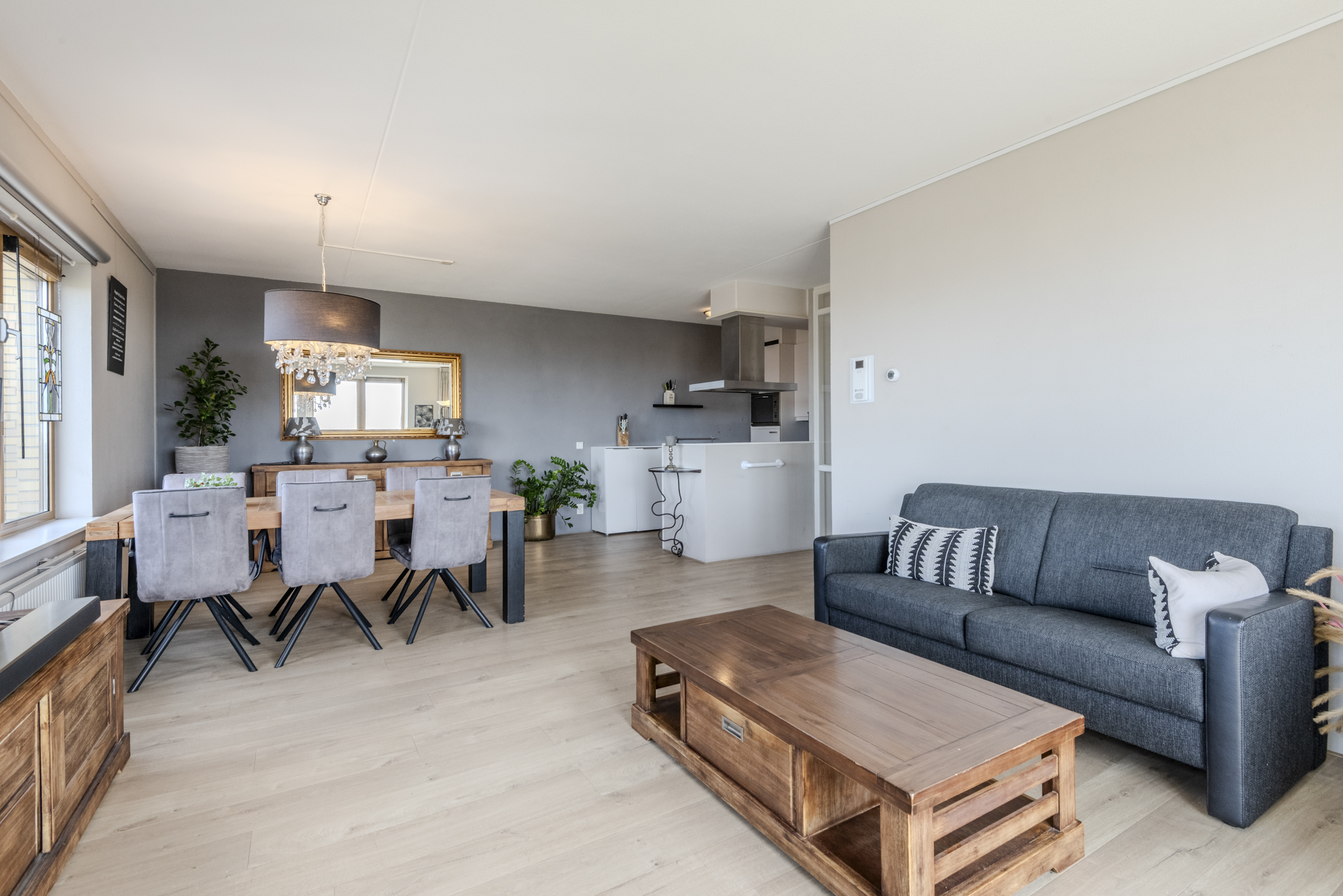 De lichte woonkamer met open keuken is fraai afgewerkt en door de aanwezigheid van grote raampartijen, is het hier heerlijk licht en sfeervol. Vanuit de woonkamer is er toegang tot het zonnige balkon op het westen dat van een mooi en vrij uitzicht geniet en voorzien is van een elektrisch zonnescherm.