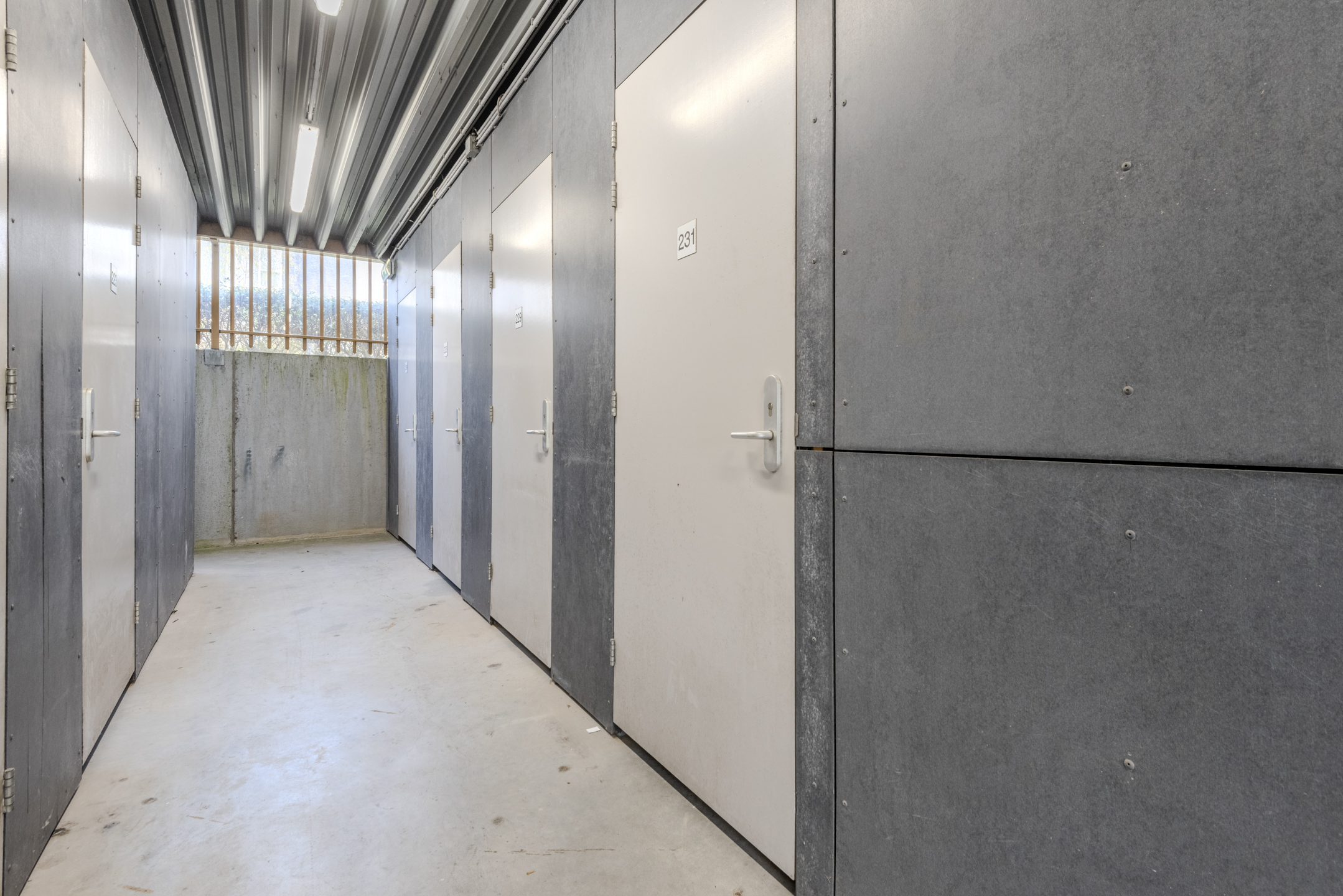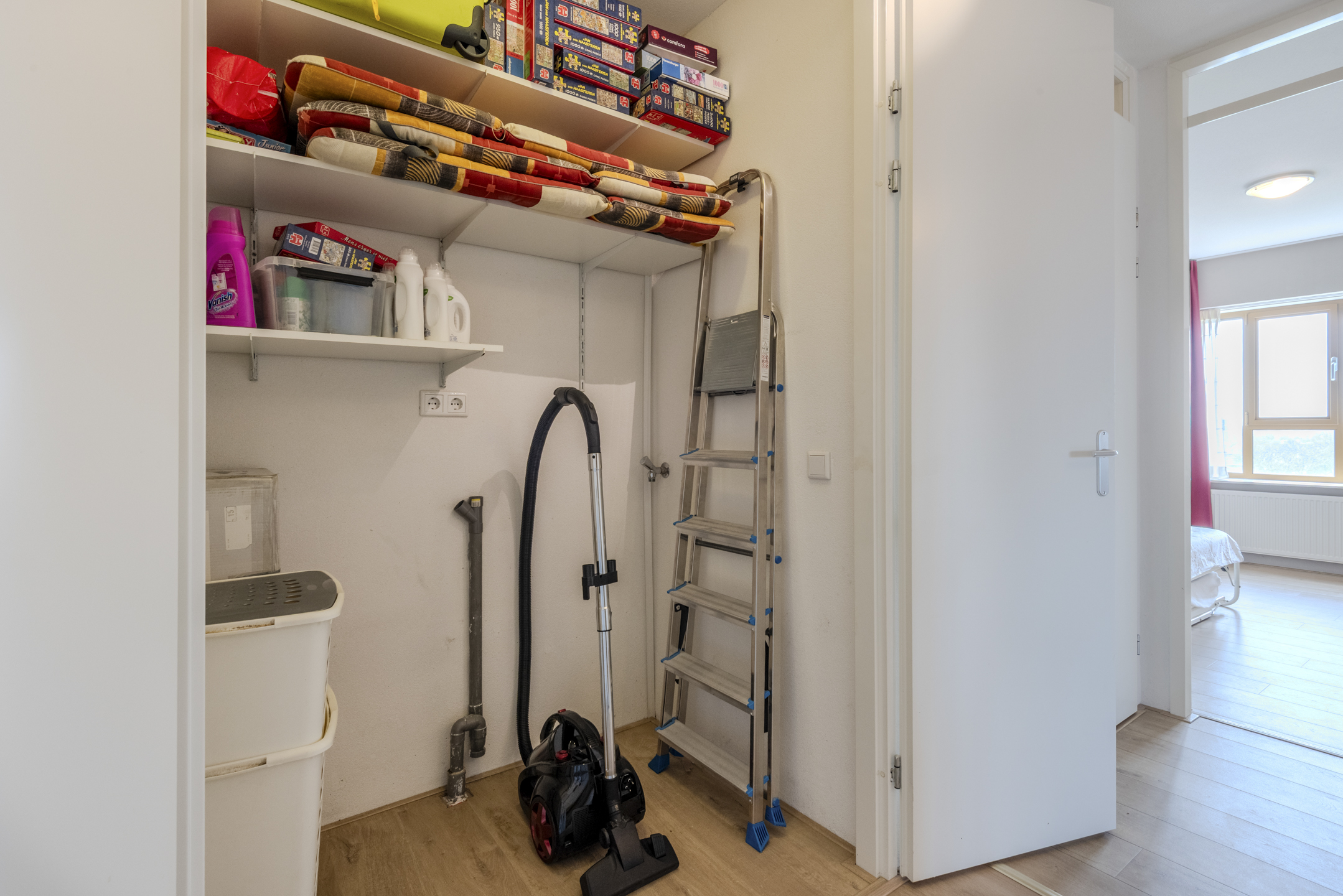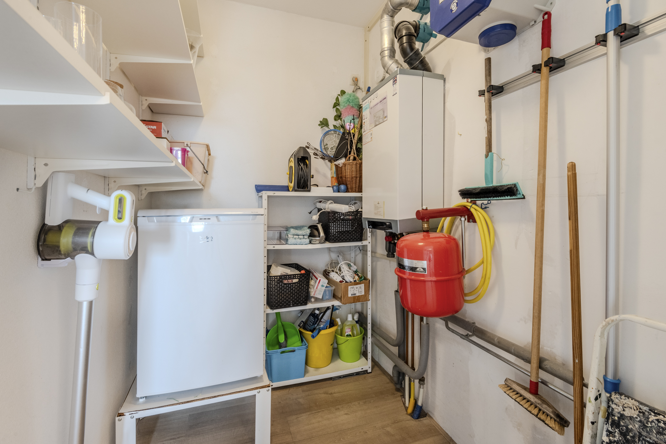 Tegenover de badkamer bevindt zich de ruime inpandige berging en tevens is er in de hal veel ingebouwde bergruimte aanwezig. Hierin zijn ook de aansluitingen voor de witgoedopstelling verwerkt.