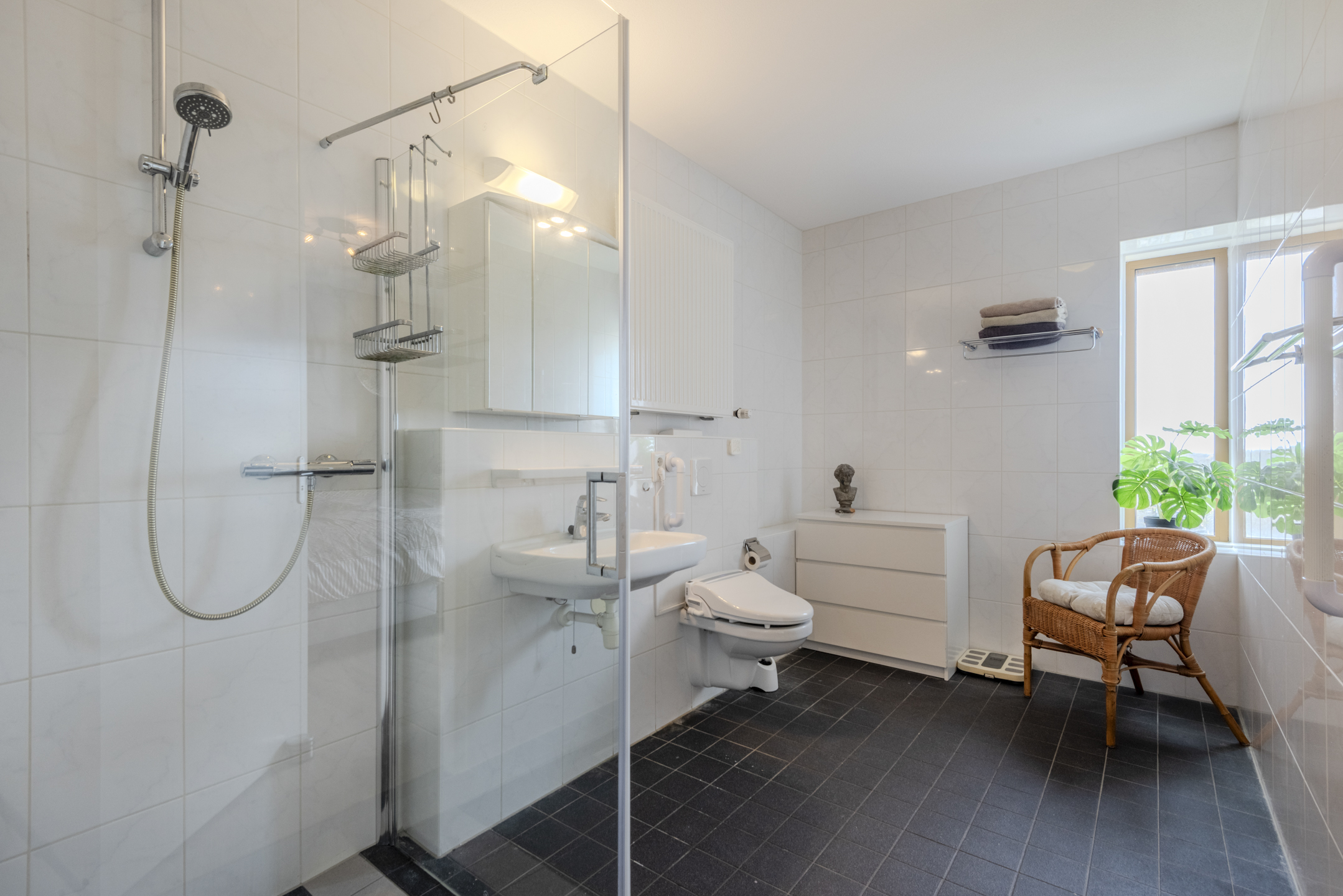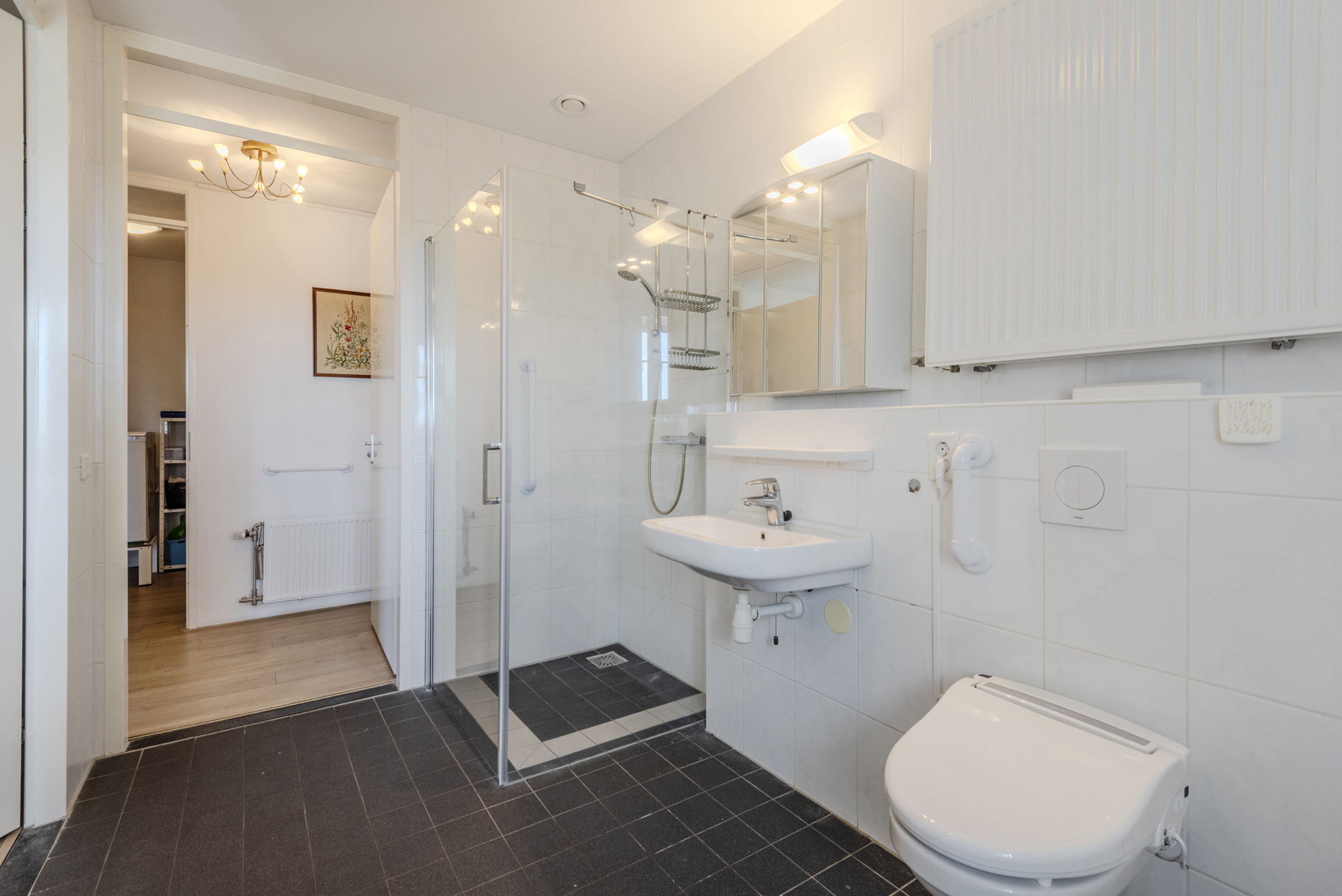 De ruime en complete badkamer beschikt over een toilet, wastafel en een inloopdouche.