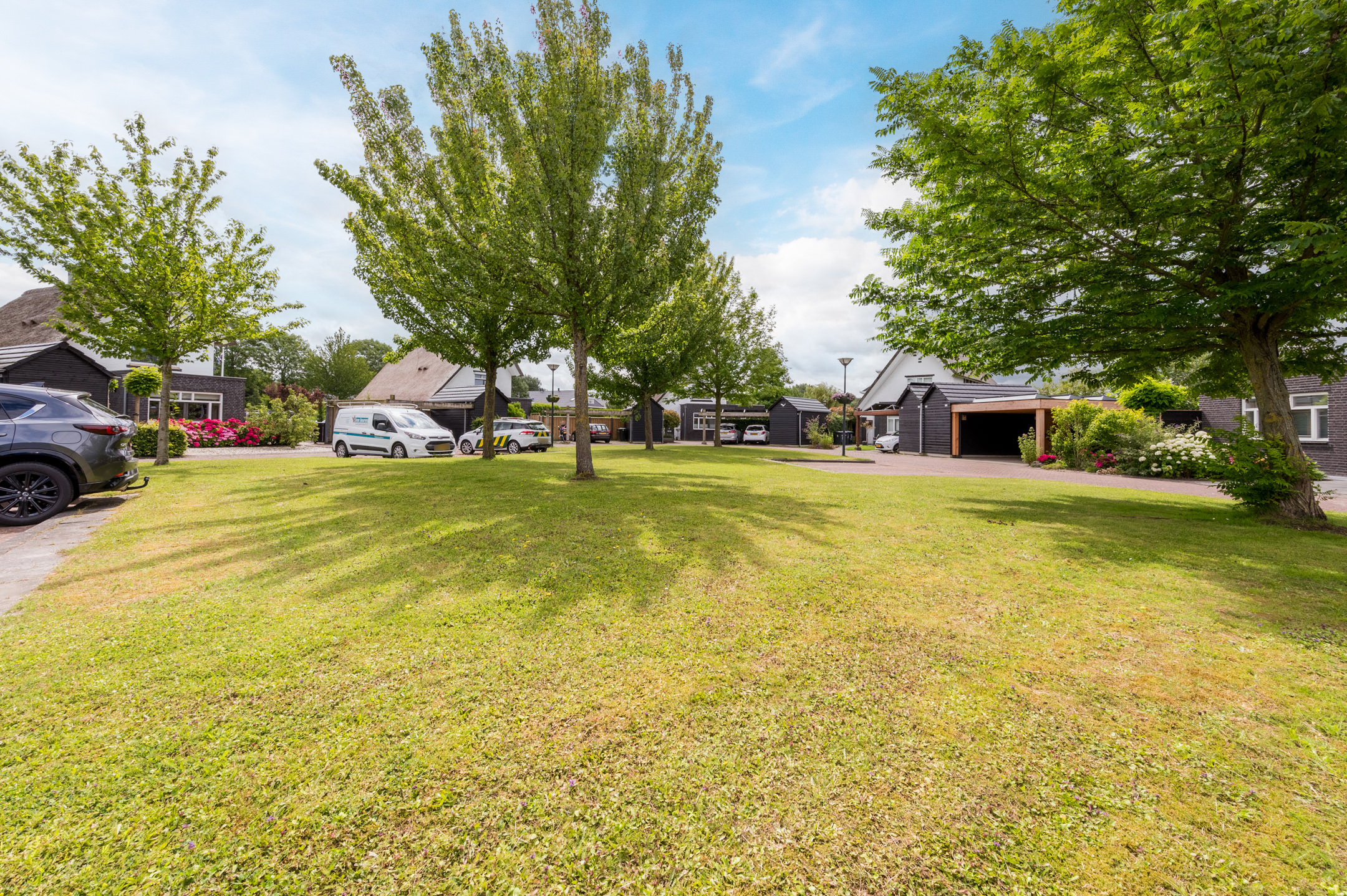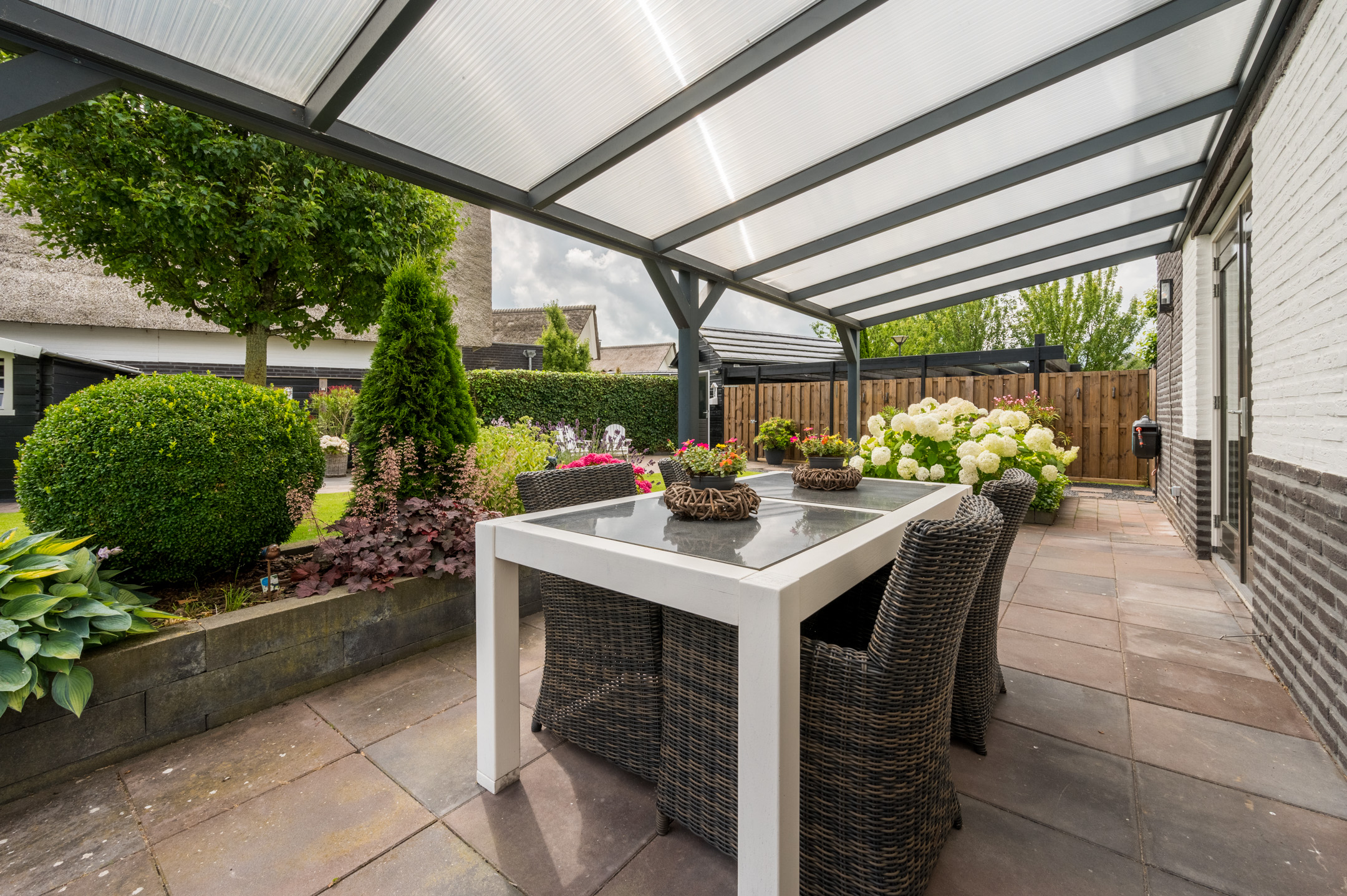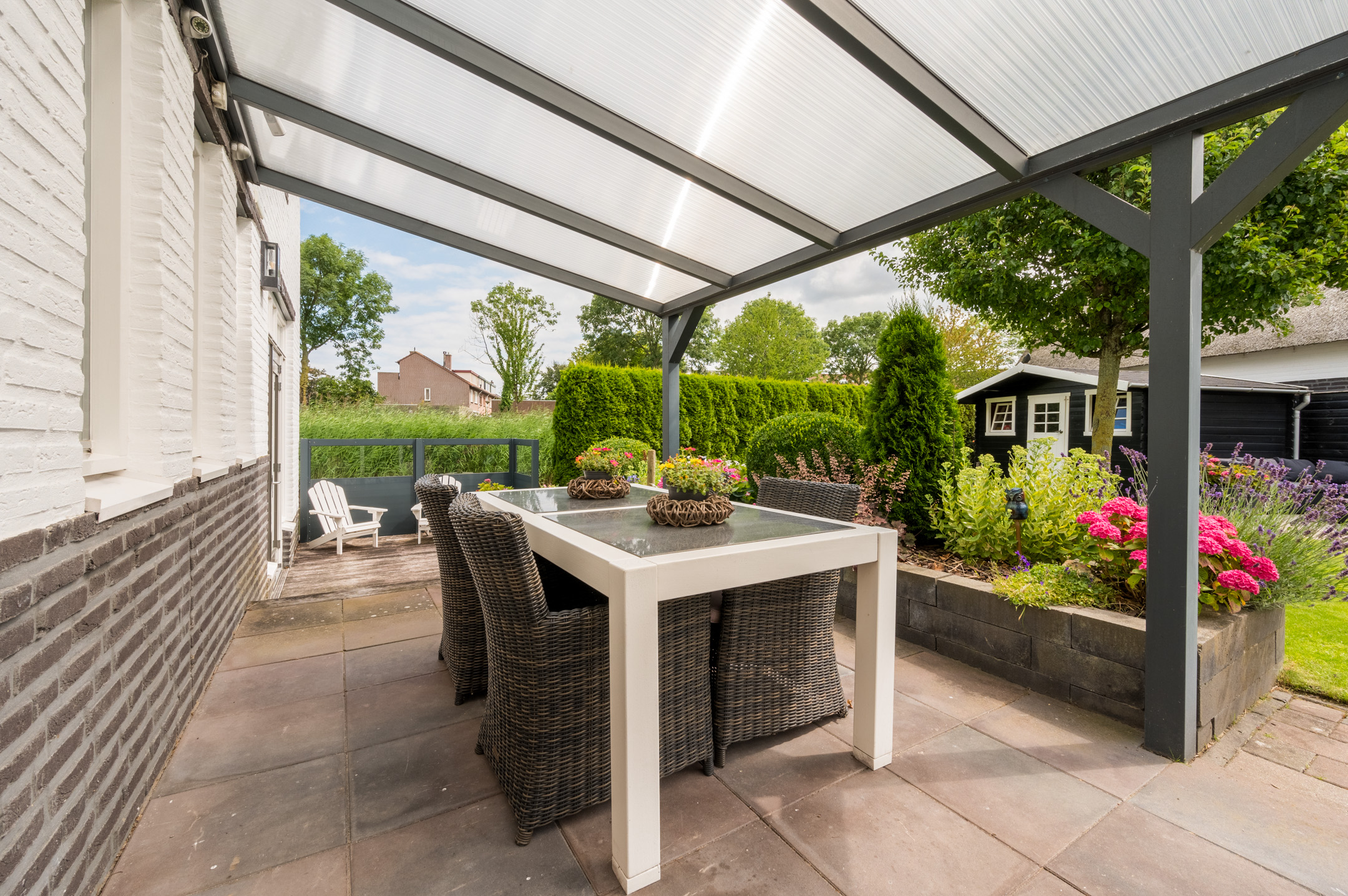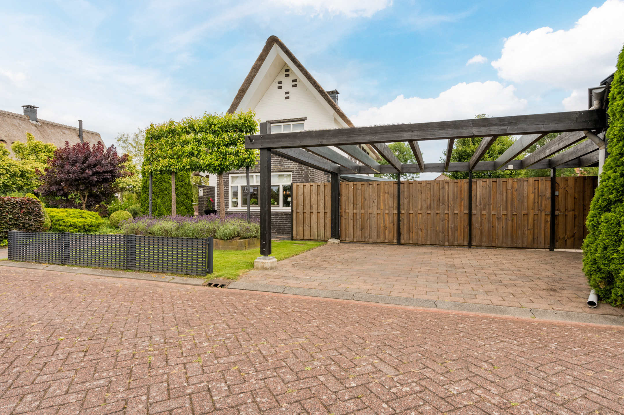 Ruime en fraai aangelegde voortuin met oprit en carport voor 2 auto’s.