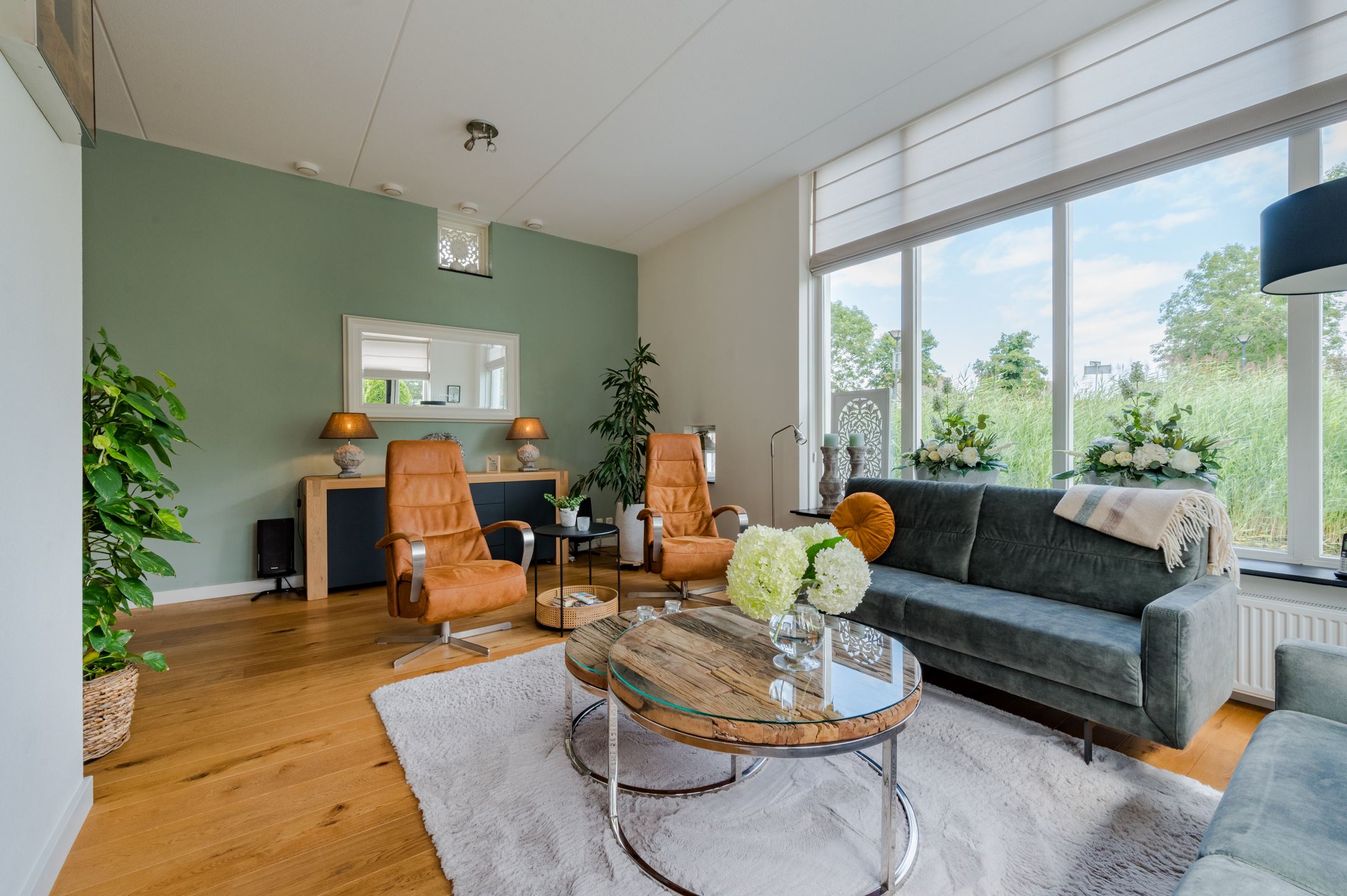 De lichte woonkamer heeft grote raampartijen langs 3 zijden en geniet hierdoor van een prettige hoeveelheid lichtinval. Het hoge plafond (3.30 meter) zorgt voor een extra ruimtelijk gevoel en ook hier zijn openslaande deuren naar de tuin aanwezig.