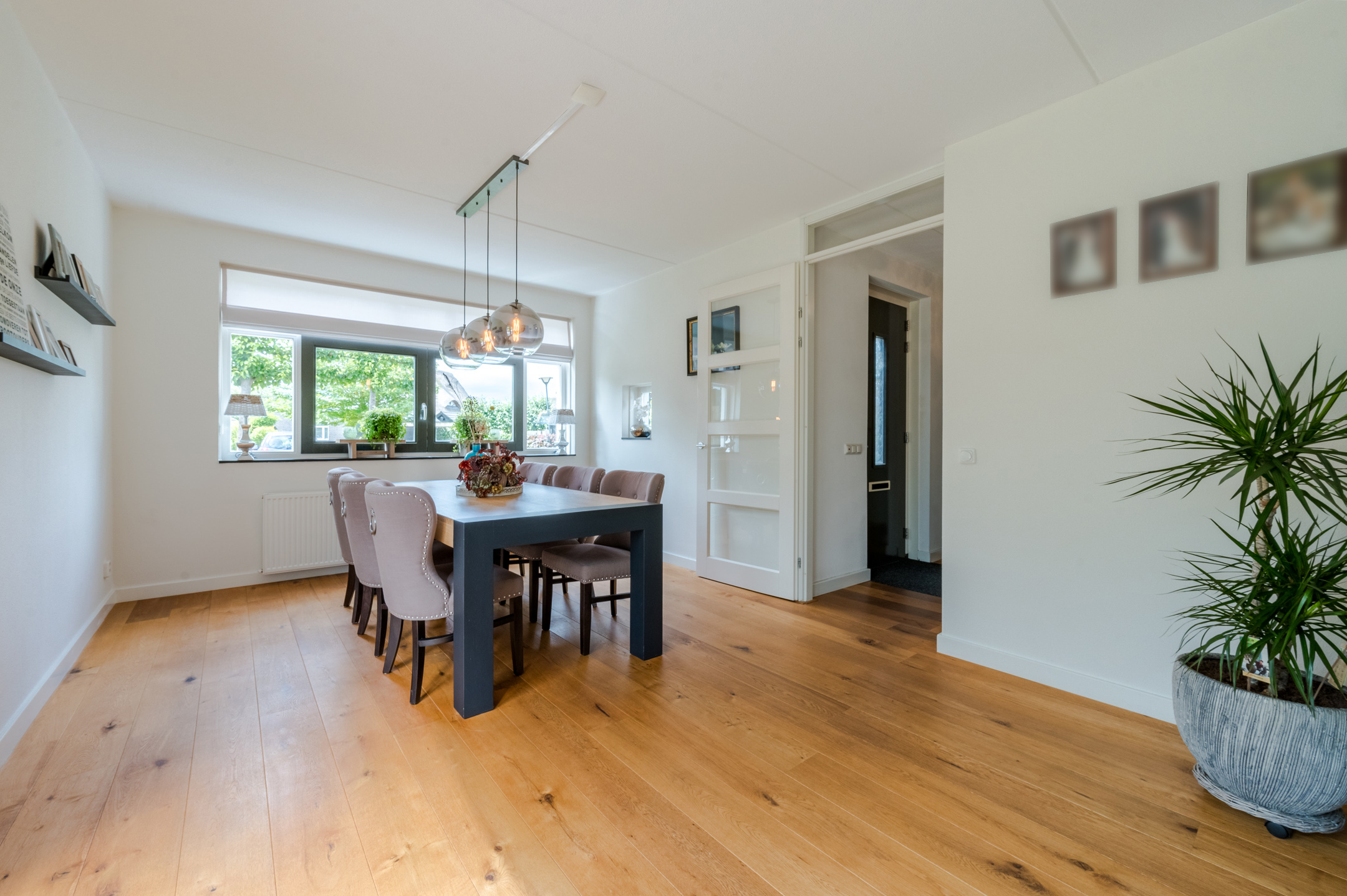 De benedenverdieping heeft een speelse, split level indeling met aan de voorzijde de semi-afgesloten eetkamer. Een fijne ruimte met openslaande deuren richting het verandaterras in de tuin. De eetkamer kan ook verbouwd worden tot slaapkamer eventueel met eigen badkamer.