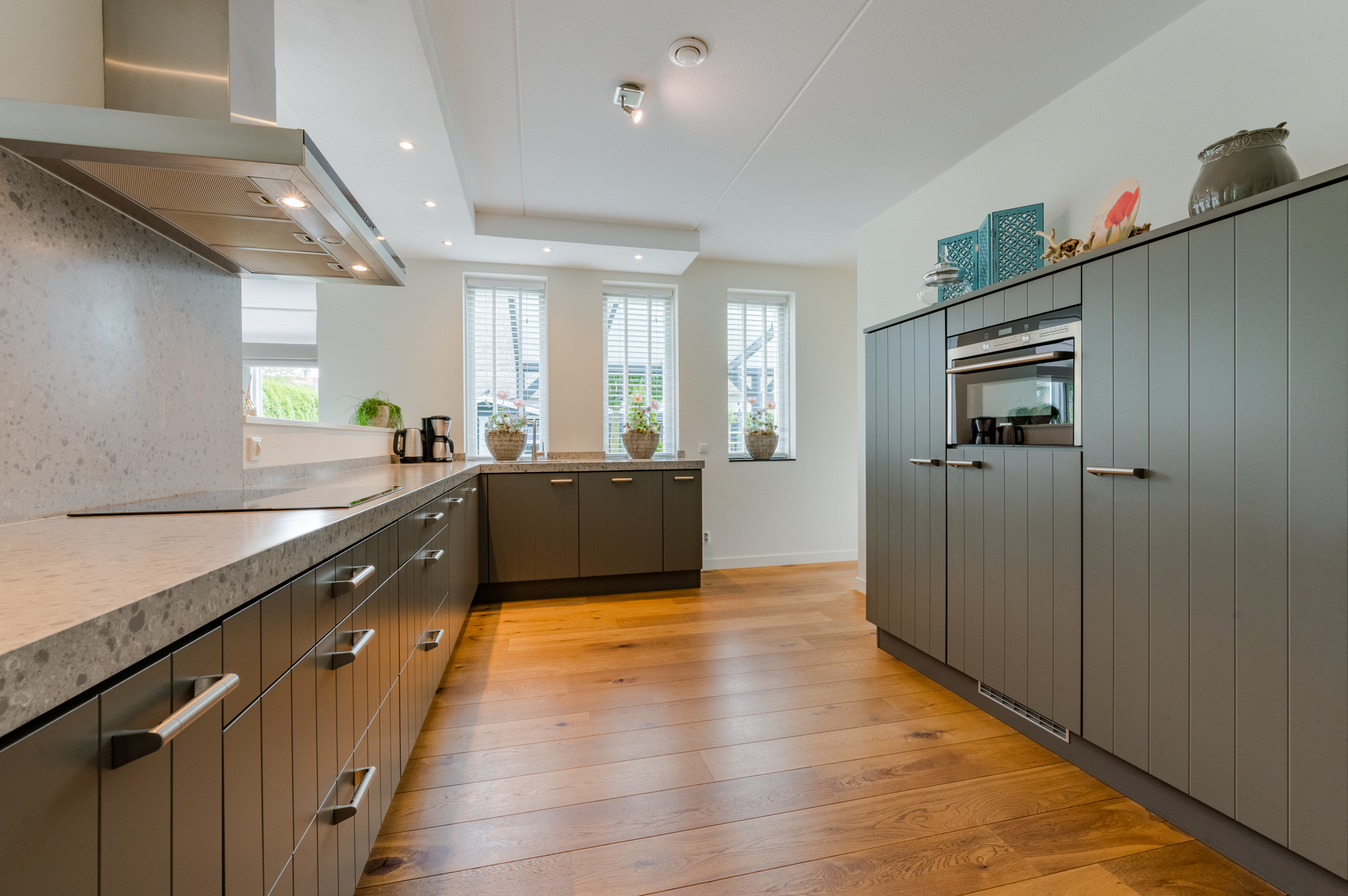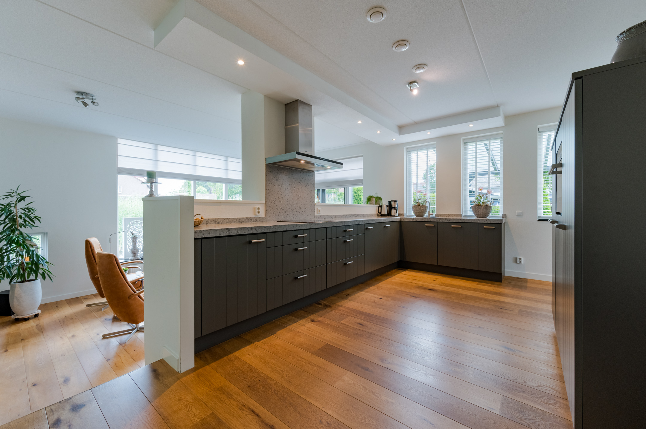 Via een open toog lopen we door naar de moderne en ruime keuken (Keller) die voorzien is van een inductie kookplaat, combimagnetron, koelkast, vriezer en een vaatwasser. De keuken heeft een speels doorkijkje naar de tuingerichte woonkamer, die zich op een iets lager niveau bevindt.