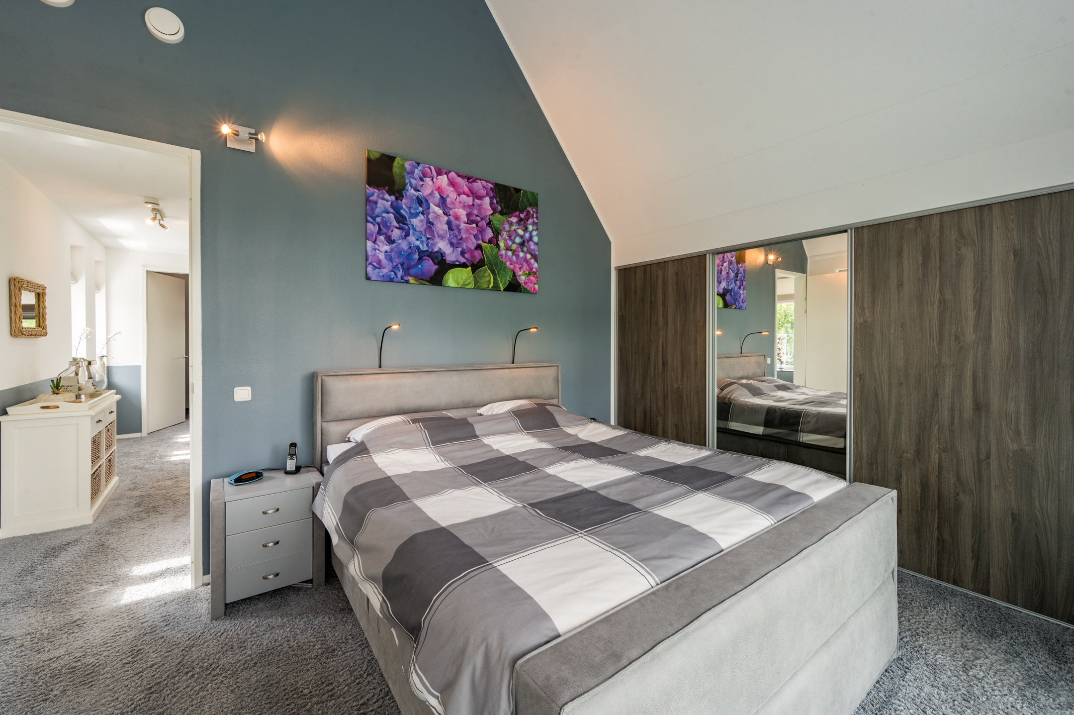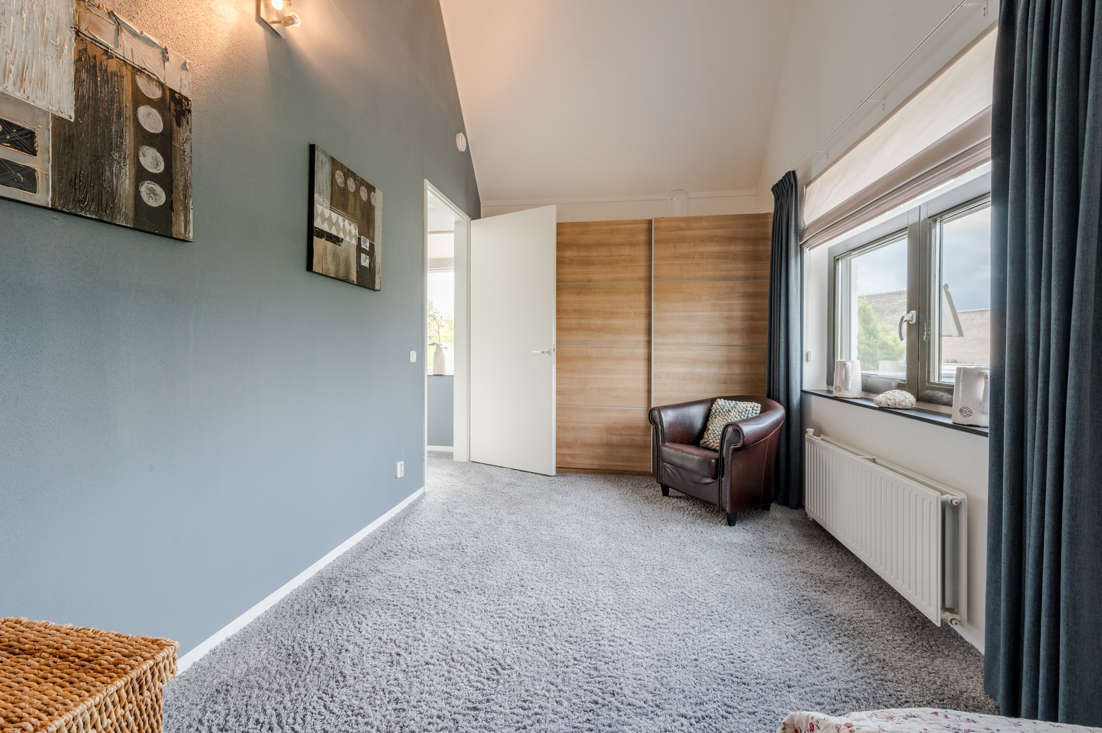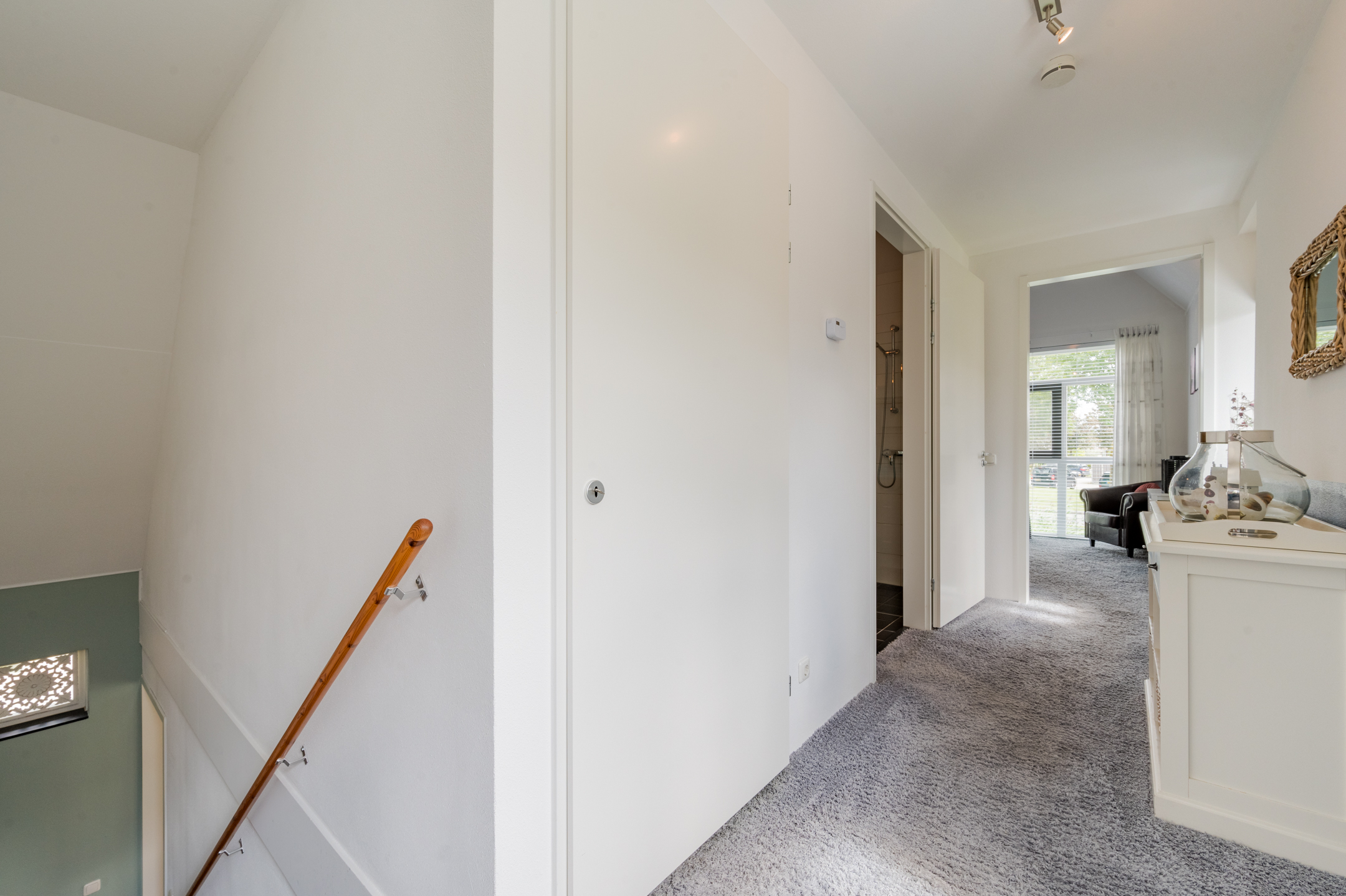 Via de trap in de hal, bereiken we de overloop van de eerste verdieping. Op deze verdieping vinden we 2 slaapkamers, de aparte wasruimte en de badkamer. De hoge nokplafonds in de slaapkamers zorgen voor een ruimtelijk gevoel en in de master bedroom is een handige inbouwwandkast aanwezig.