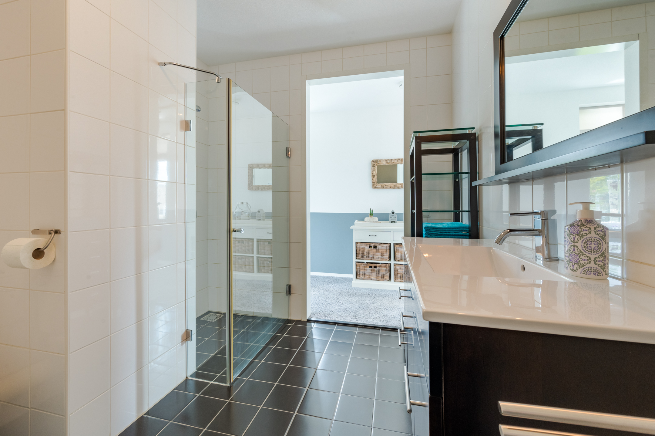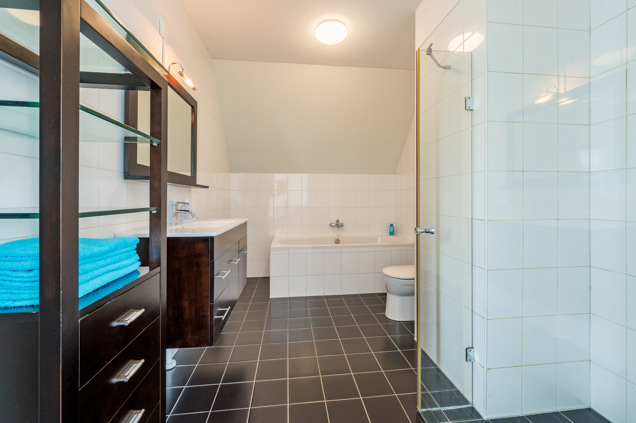 De ruime badkamer is voorzien van een tweede toilet, wastafel met meubel, ligbad en een aparte inloopdouche.