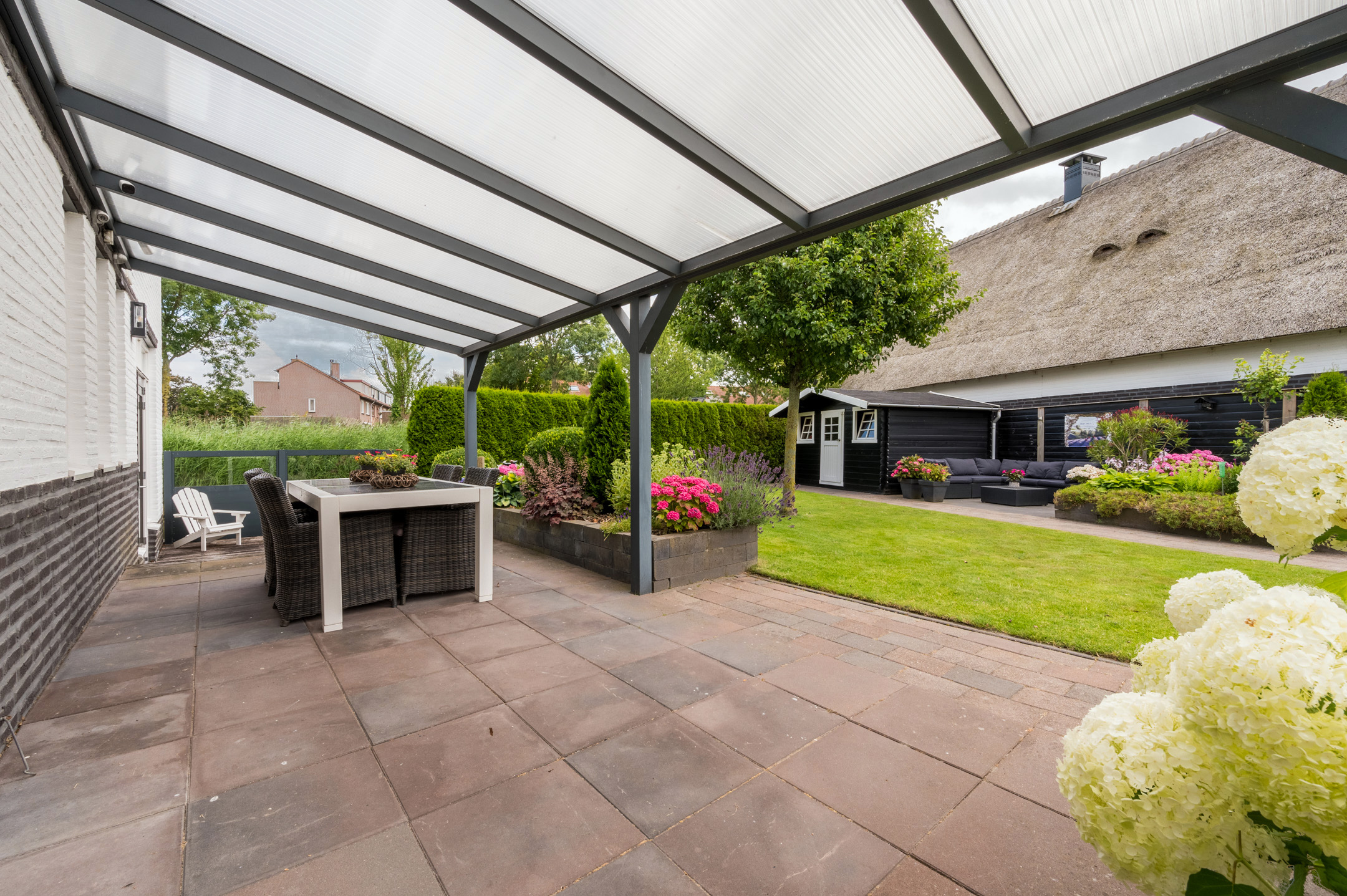 De woning is gelegen op een ruim en volledig afgesloten perceel met een fraai aangelegde tuin rondom de woning. De tuin grenst aan het water en dit geeft de tuin een fijn en vrij gevoel met veel privacy. De tuin kent een gevarieerde balans van groen en heeft diverse betegelde terrassen, waarvan een met een licht doorlatende overkapping. Er zijn 2 ruime bergingen in de tuin welke voorzien zijn van elektriciteit.