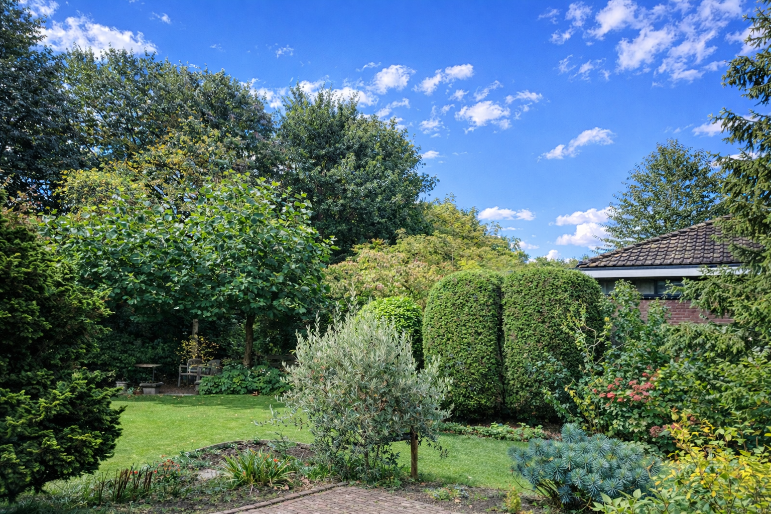 De woning is gelegen op een zeer ruim en groen perceel. De achtertuin is gelegen op het zonnige zuidoosten en fraai aangelegd met een groot betegeld terras en diverse plekken om van de zon te kunnen genieten, dat overgaat in een door groene borders omlijst grasveld met een grote siervijver. De vele hoge bomen aan de rand van en rondom het perceel geven de tuin een parkachtig karakter en zorgen ervoor dat je in alle privacy van het buitenleven kunt genieten.