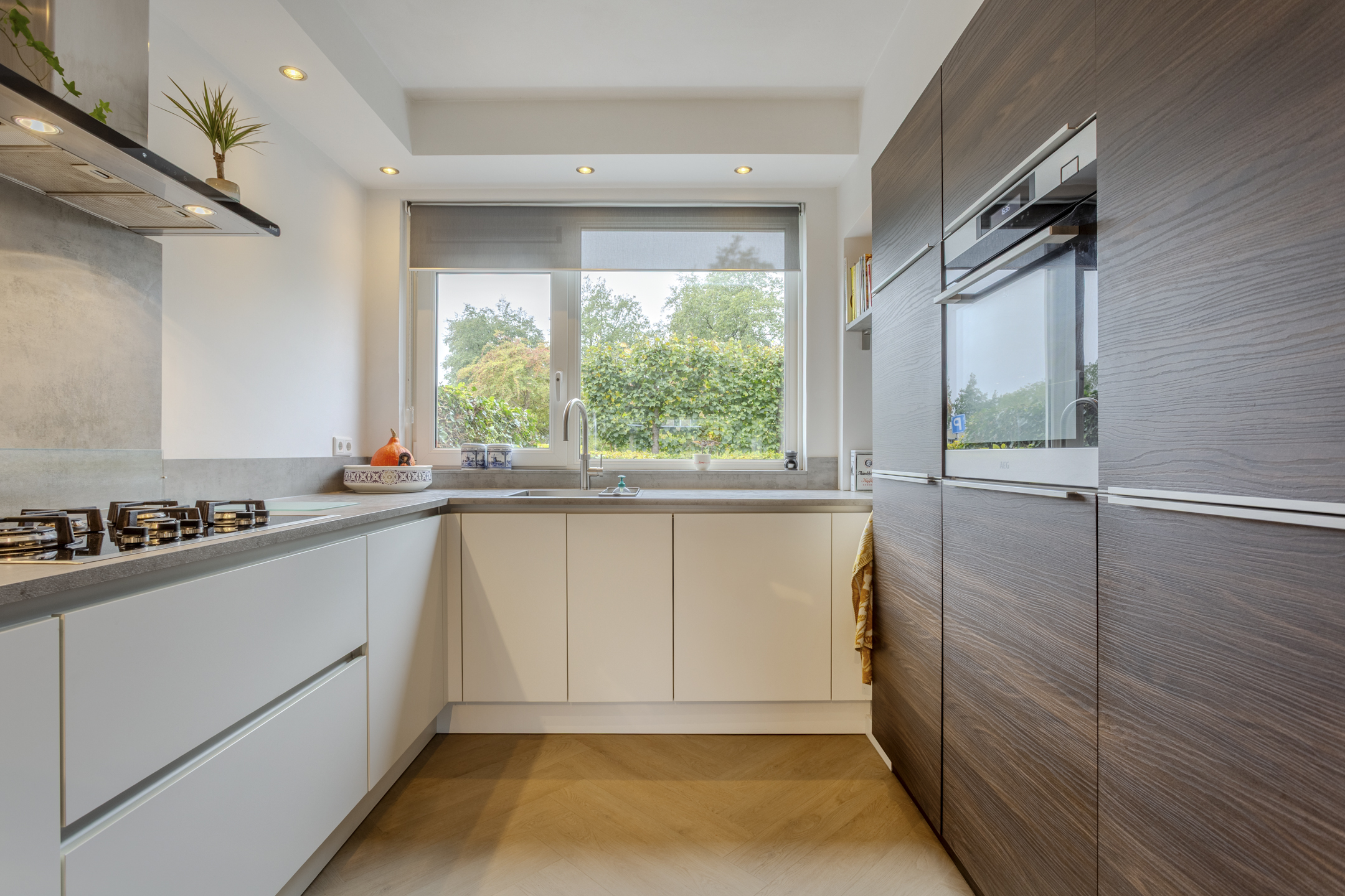 De open keuken bevindt zich aan de voorzijde van de woning en is voorzien van inbouwapparatuur van AEG: een gasfornuis, oven, stoomoven, koelkast, vriezer, Quooker kraan (inclusief 5 liter warmwaterboiler) en een vaatwasser.