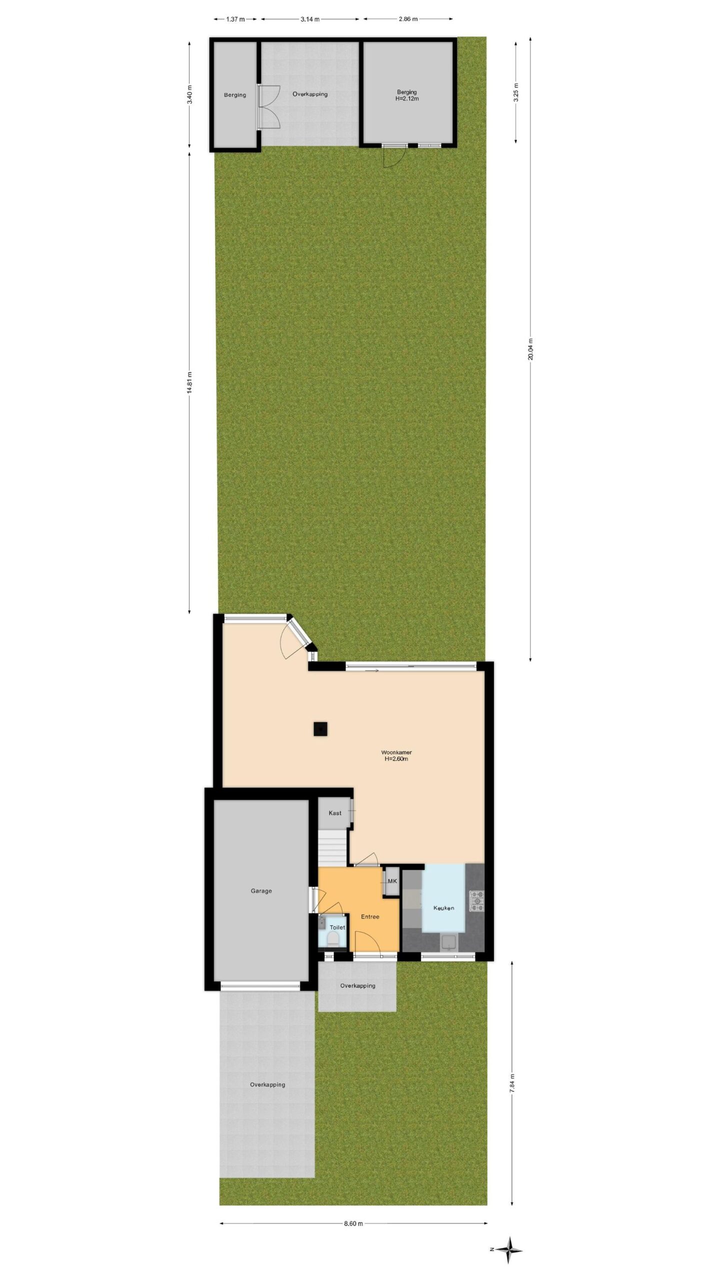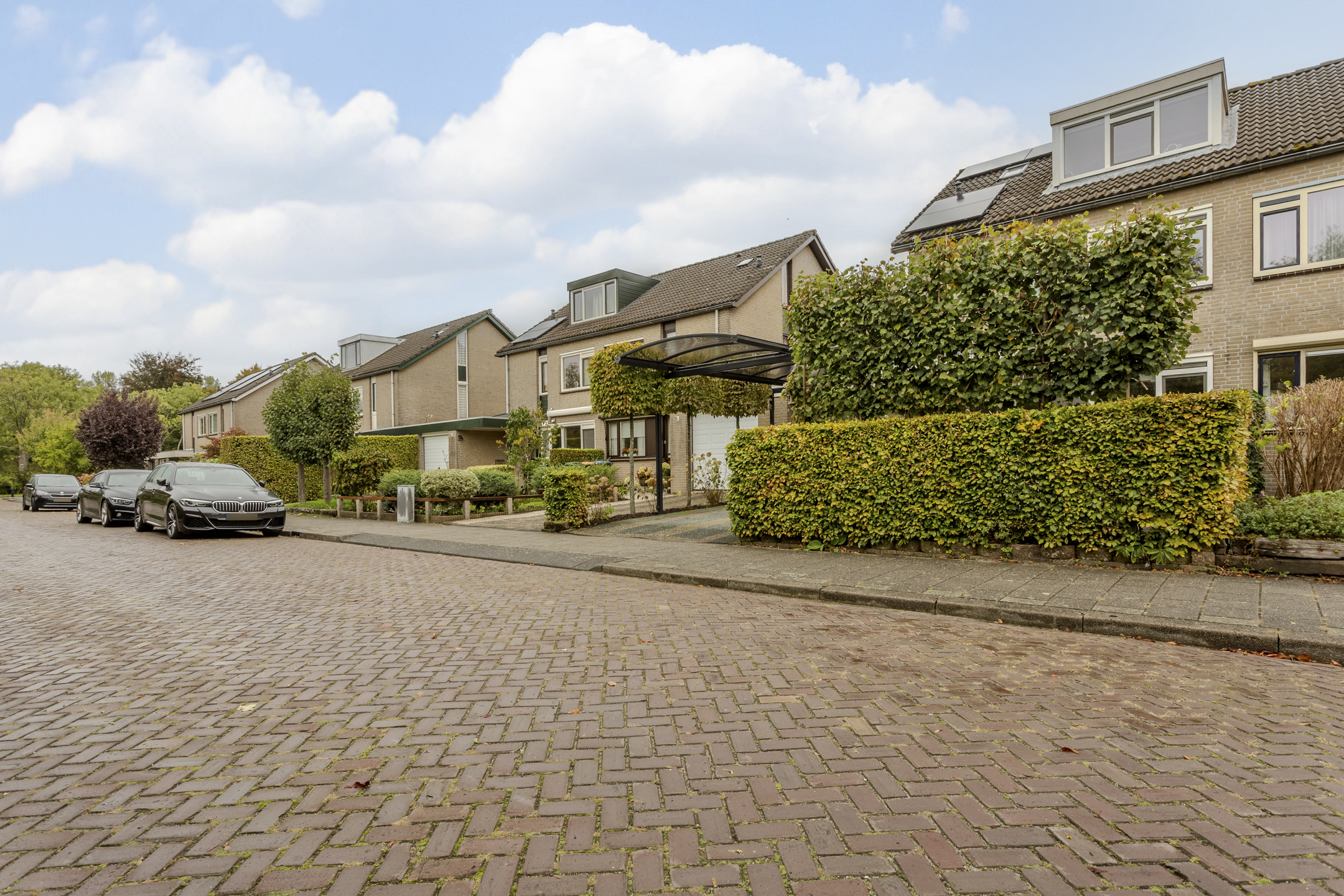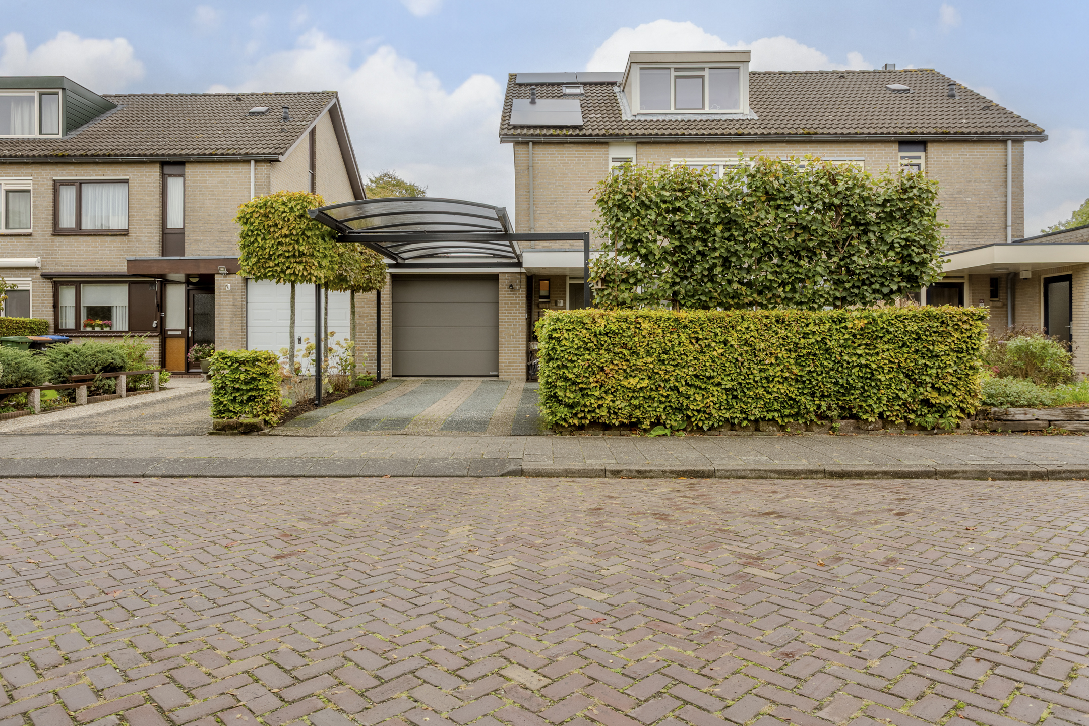 Via de ruime betegelde voortuin met privacy biedende haag, leibomen, garage en grote carport, bereiken we de voordeur van de woning.