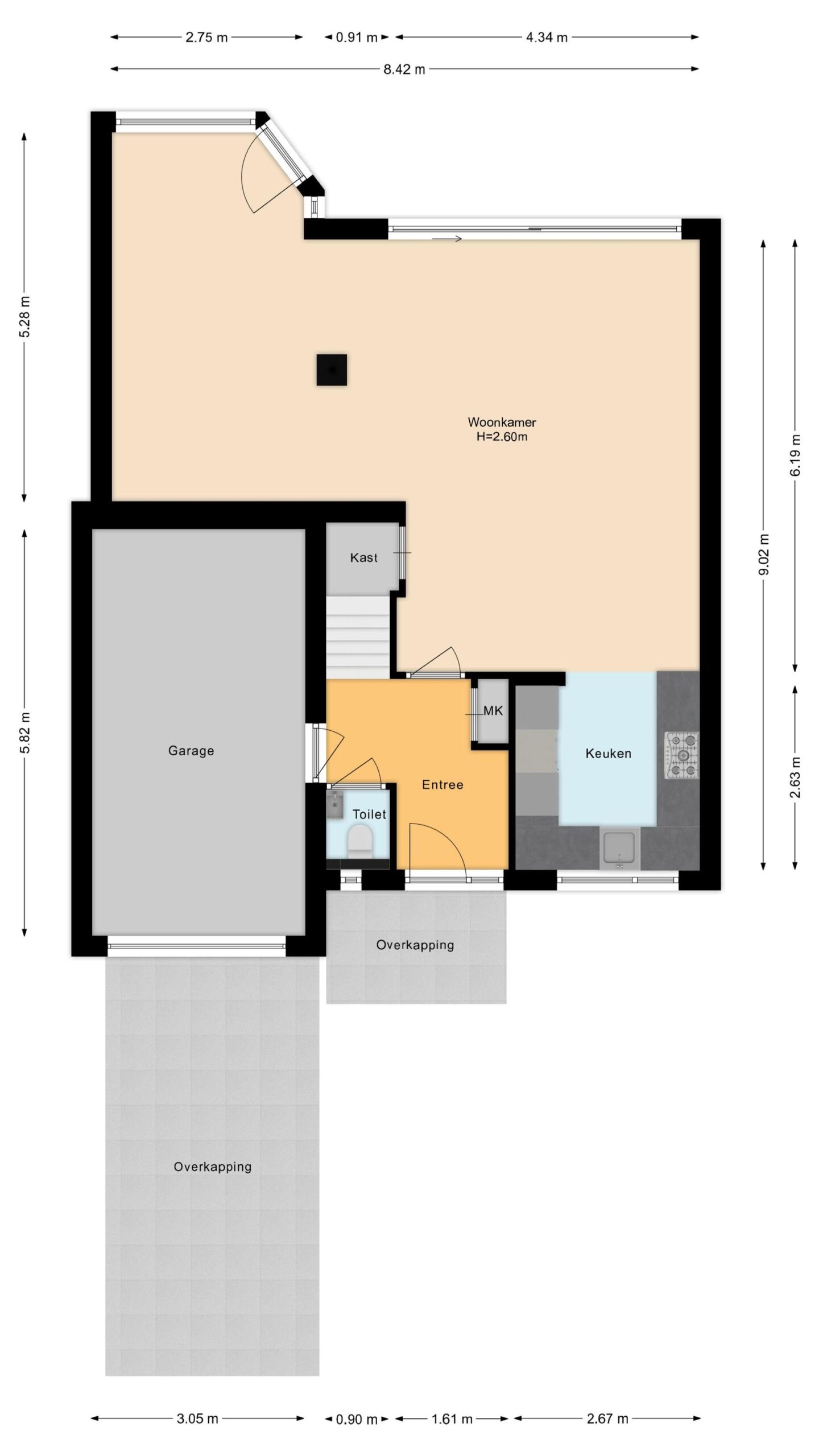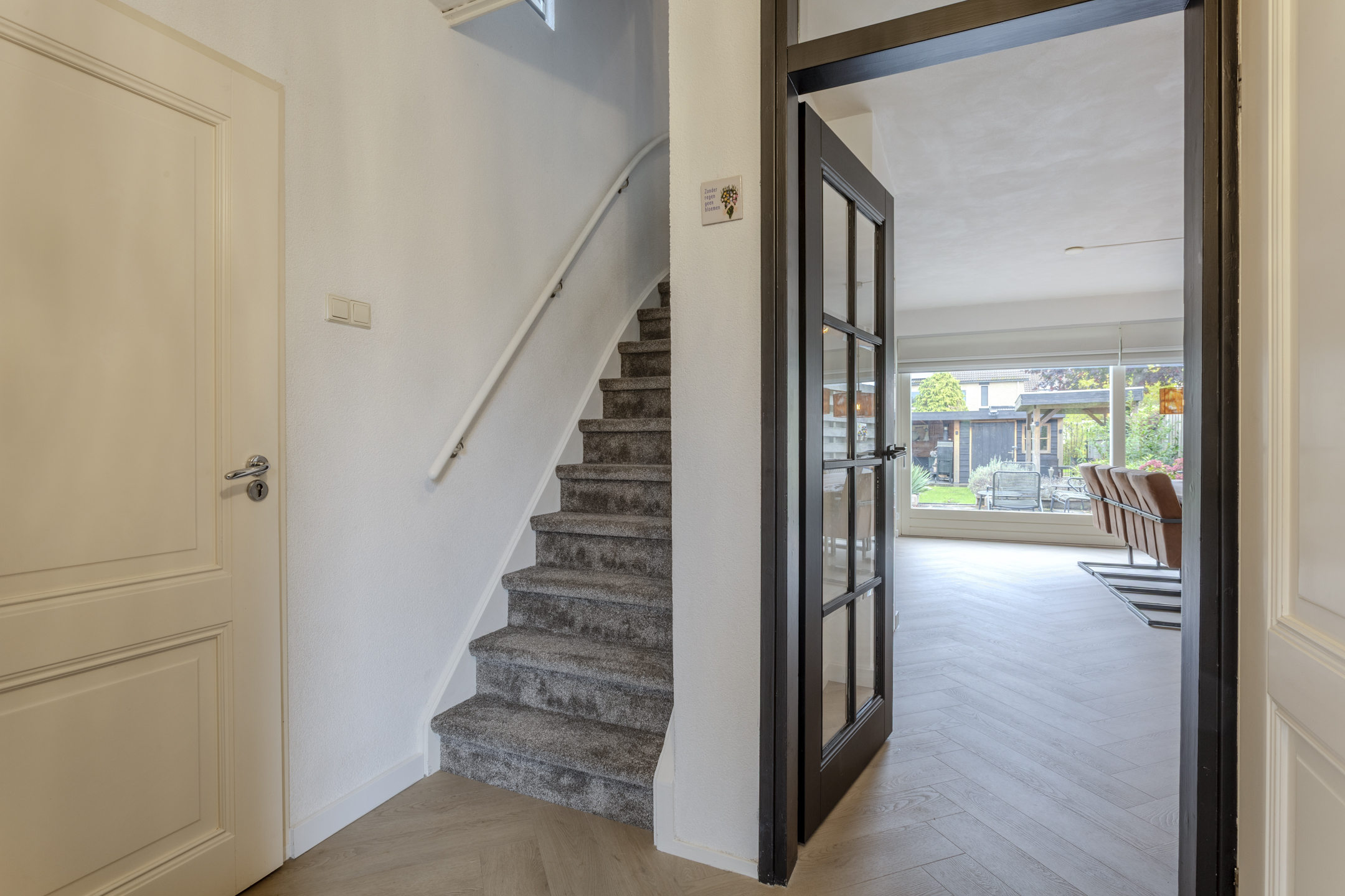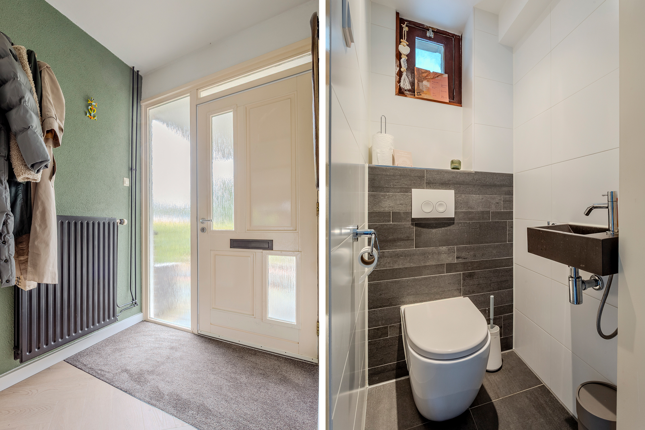 Achter de voordeur vinden we de entree met de meterkast (vernieuwd in 2023), het gastentoilet met fonteintje, inpandige toegang tot de garage, trapopgang naar de eerste verdieping (opnieuw gestoffeerd in zomer 2025) en de toegang tot de woonkamer met open keuken.