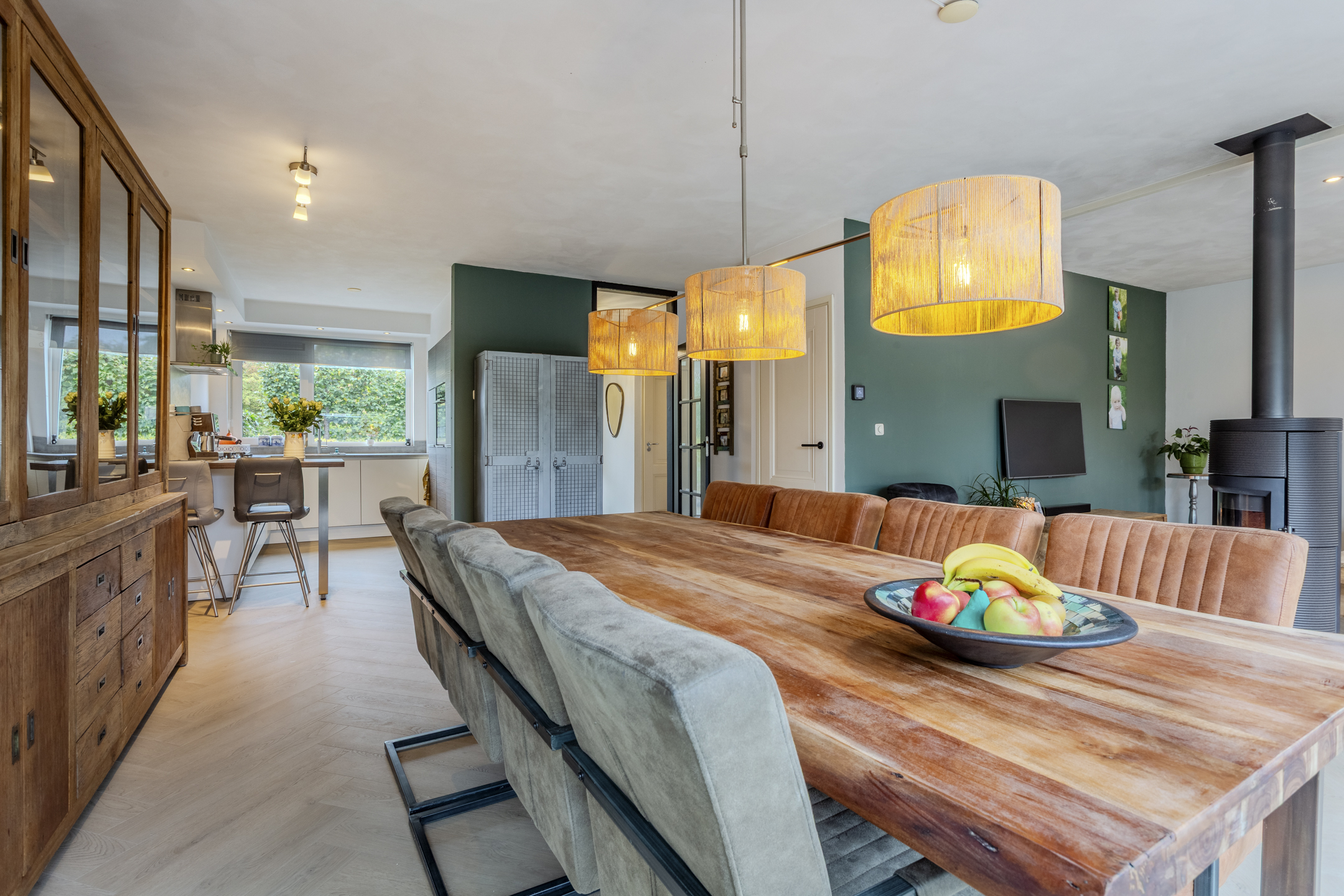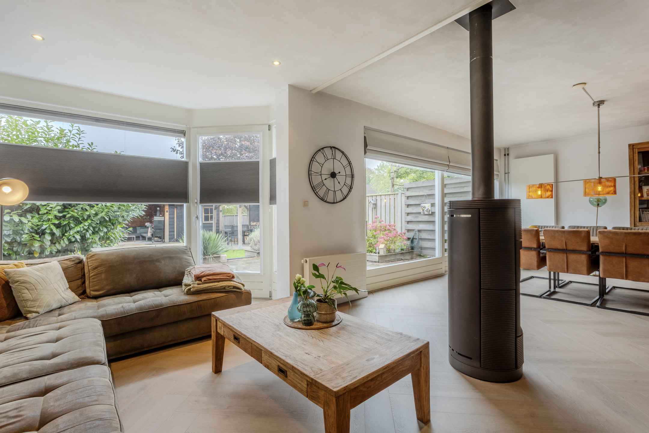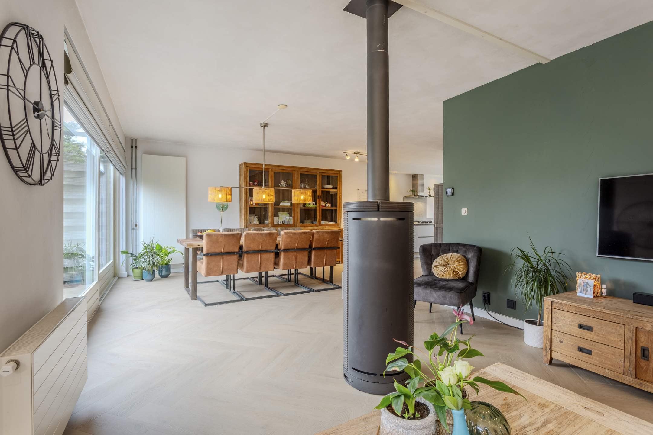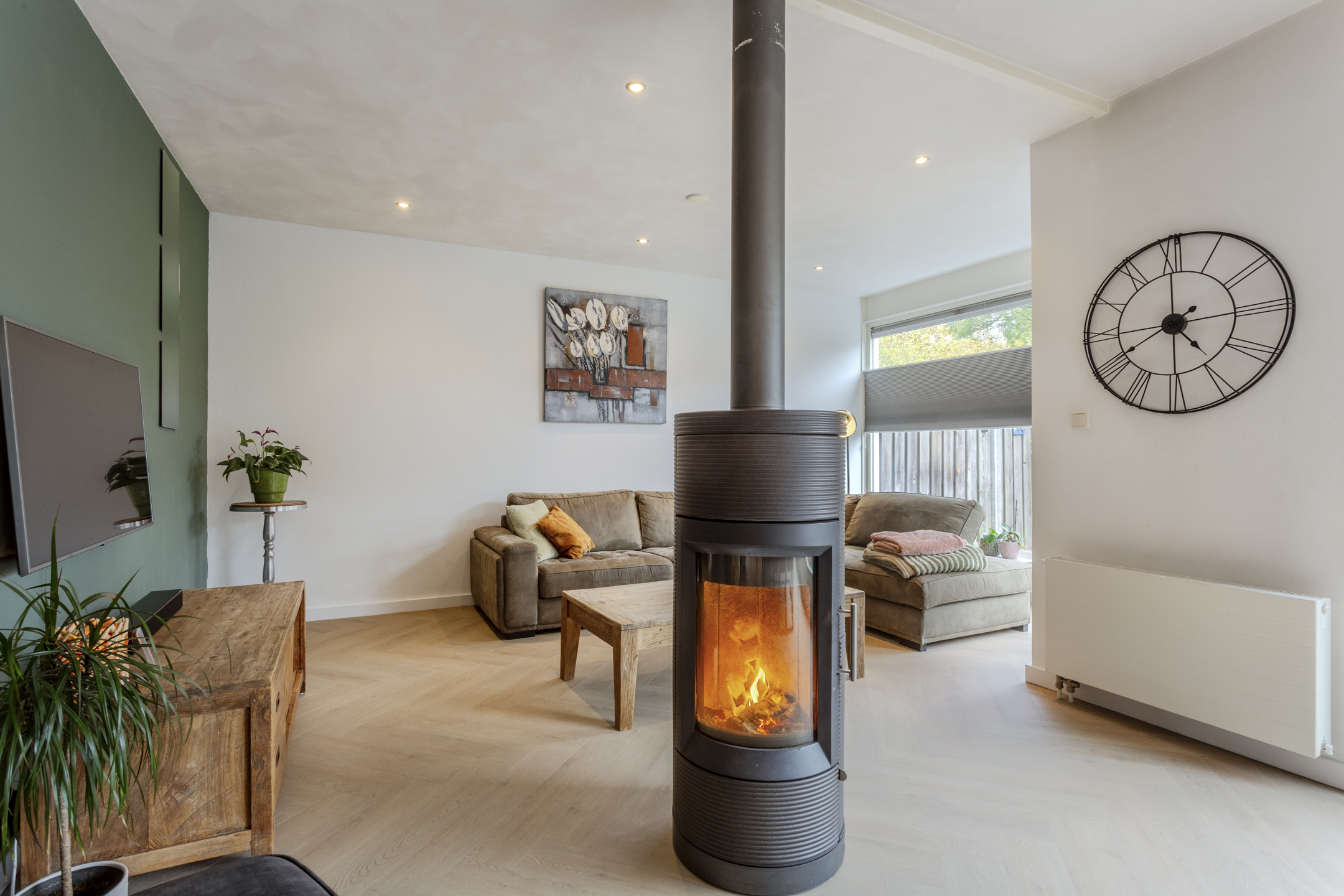De sfeervolle en zeer ruime woonkamer is tuingericht, heeft een grote schuifpui naar de tuin en geniet door de grote raampartijen van een fijne hoeveelheid lichtinval. Centraal in de ruimte is de gezellige houtkachel (draaibaar richting zowel de woonkamer als eethoek) en de zomer van 2025 is er een nieuwe PVC-laminaatvloer gelegd.