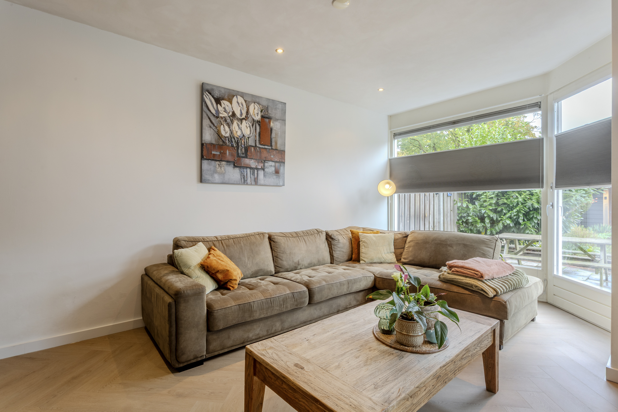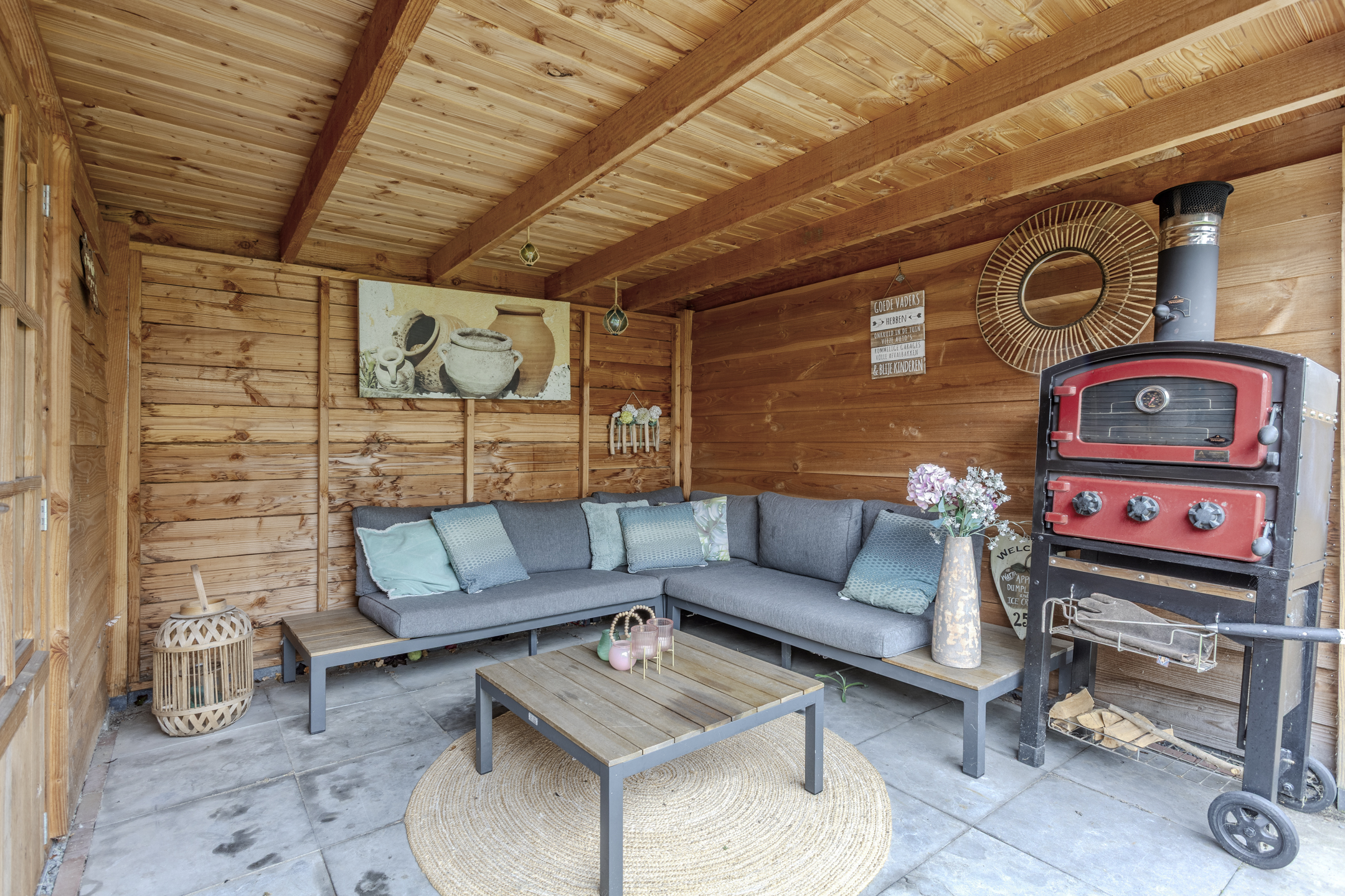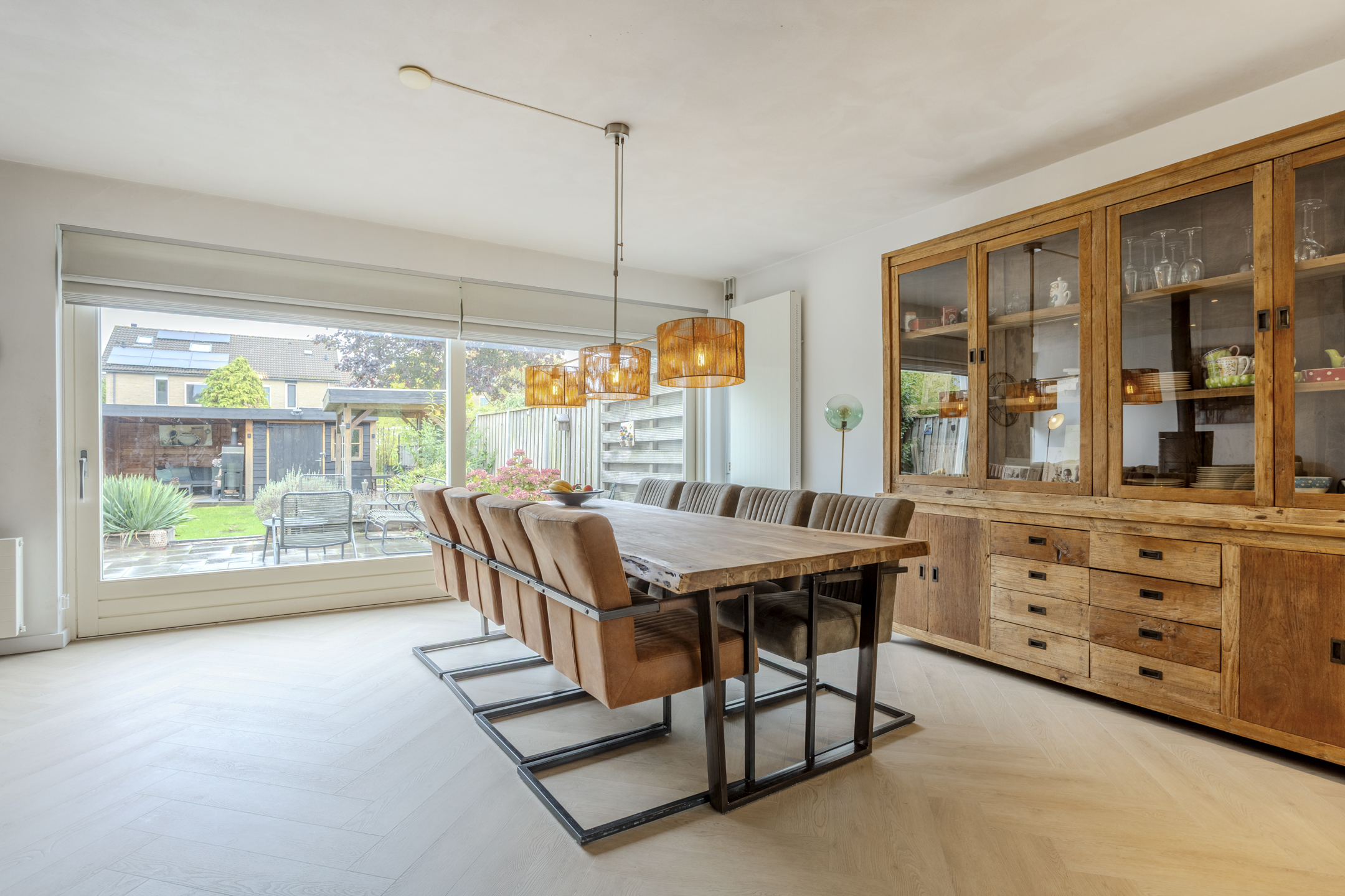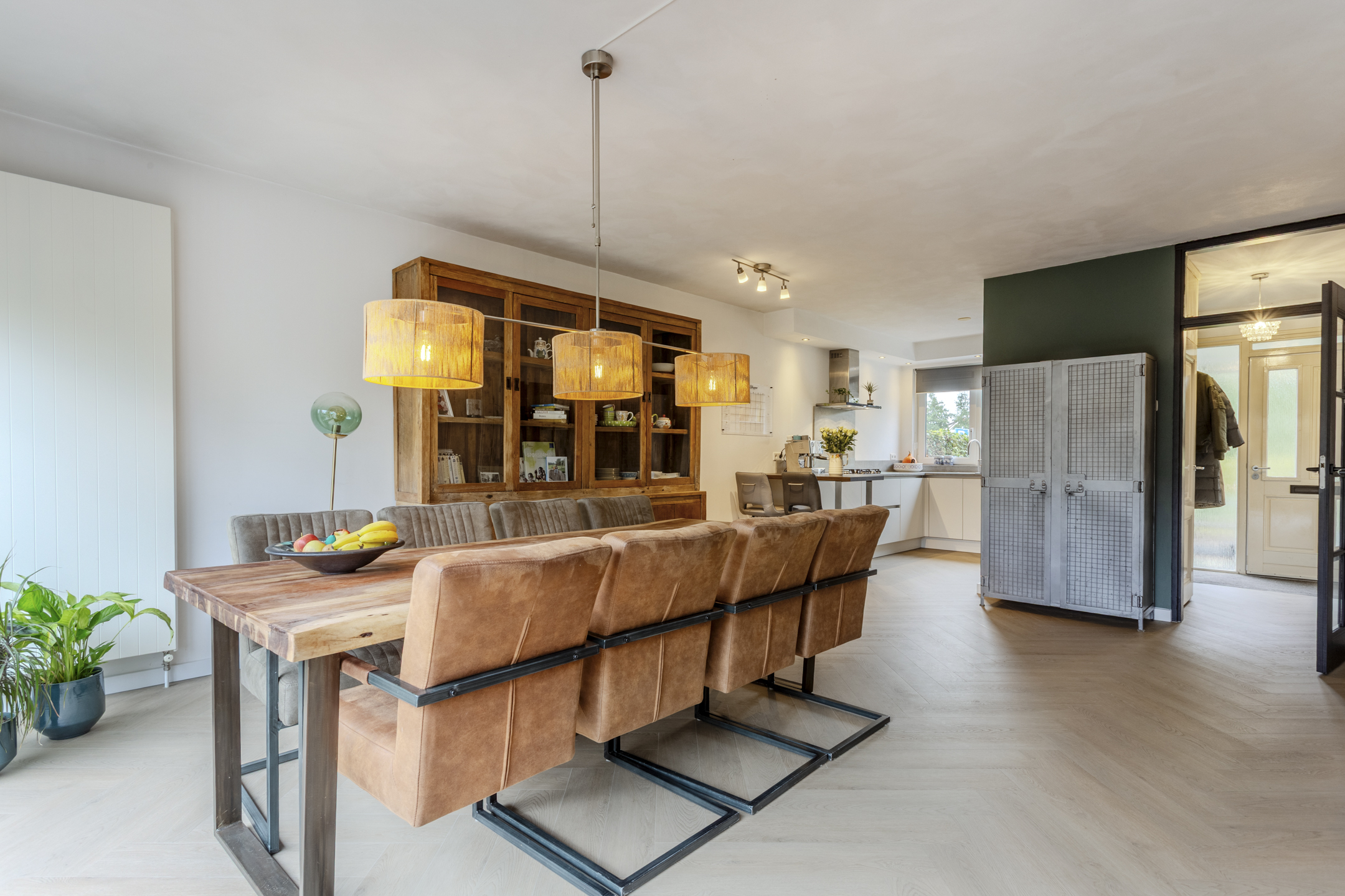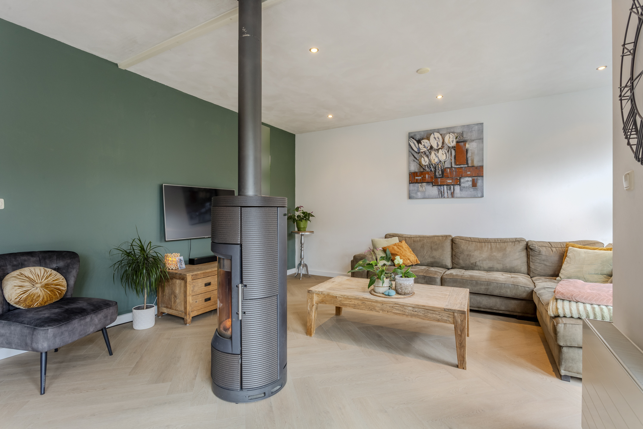 De sfeervolle en zeer ruime woonkamer is tuingericht, heeft een grote schuifpui naar de tuin en geniet door de grote raampartijen van een fijne hoeveelheid lichtinval. Centraal in de ruimte is de gezellige houtkachel (draaibaar richting zowel de woonkamer als eethoek) en de zomer van 2025 is er een nieuwe PVC-laminaatvloer gelegd.