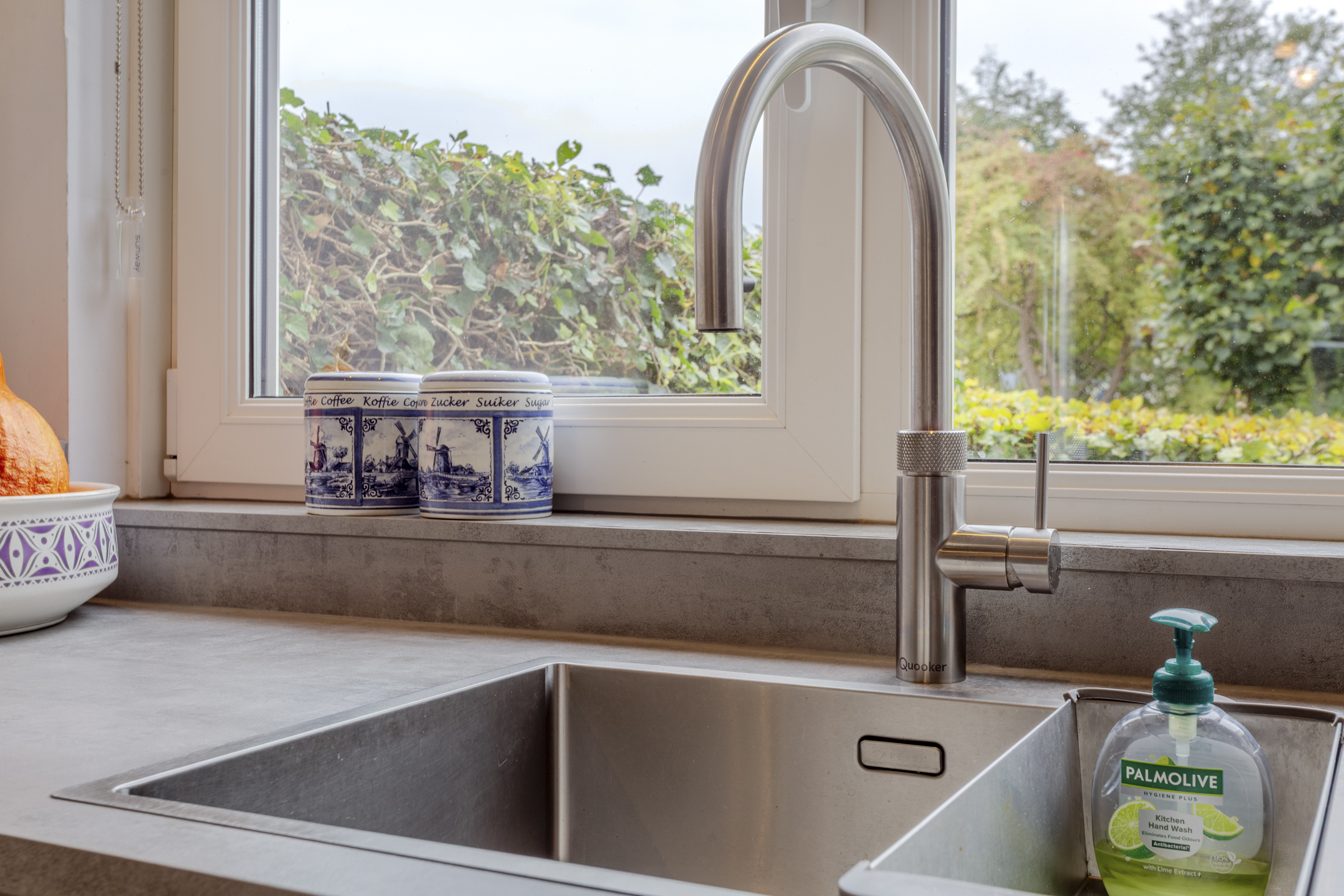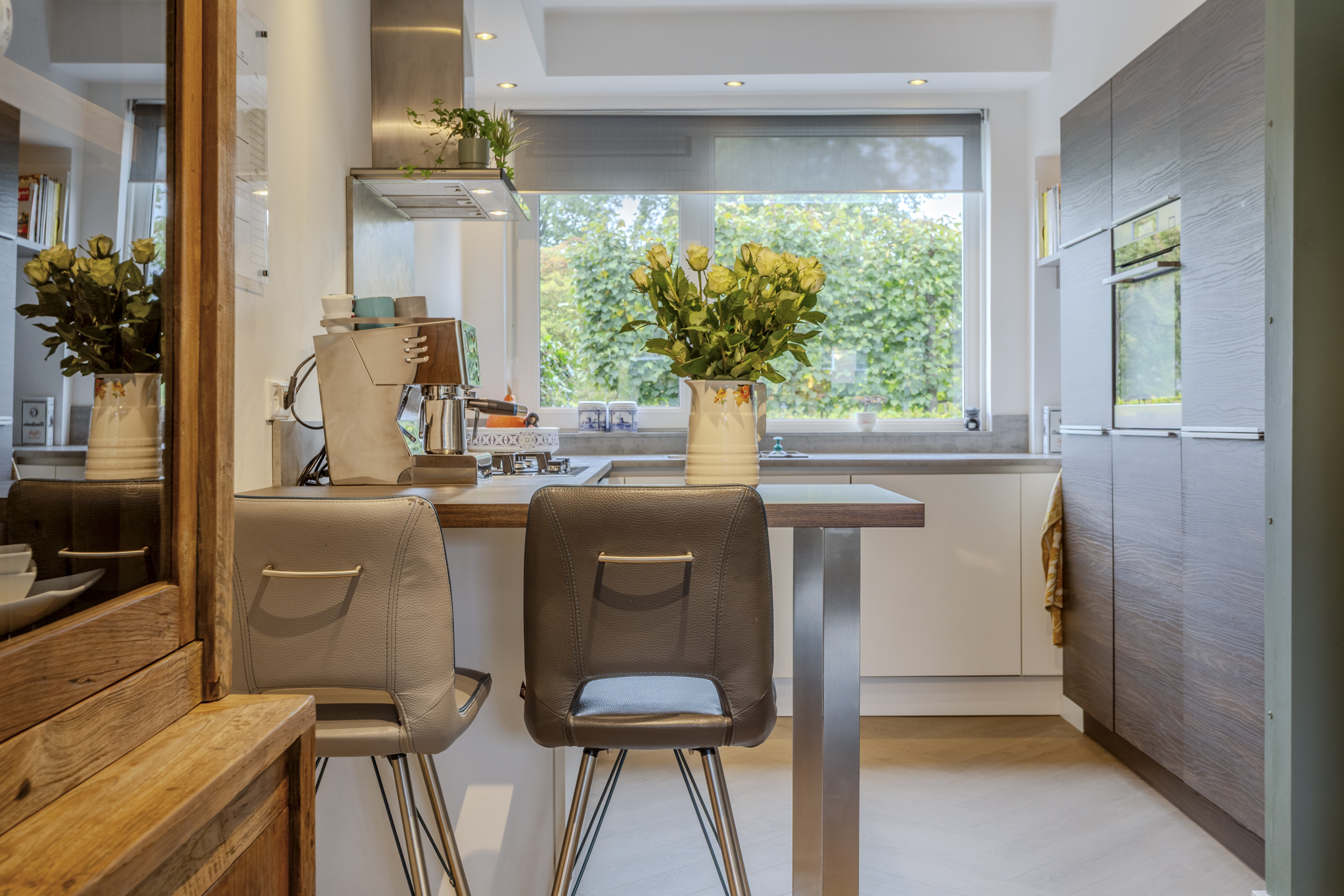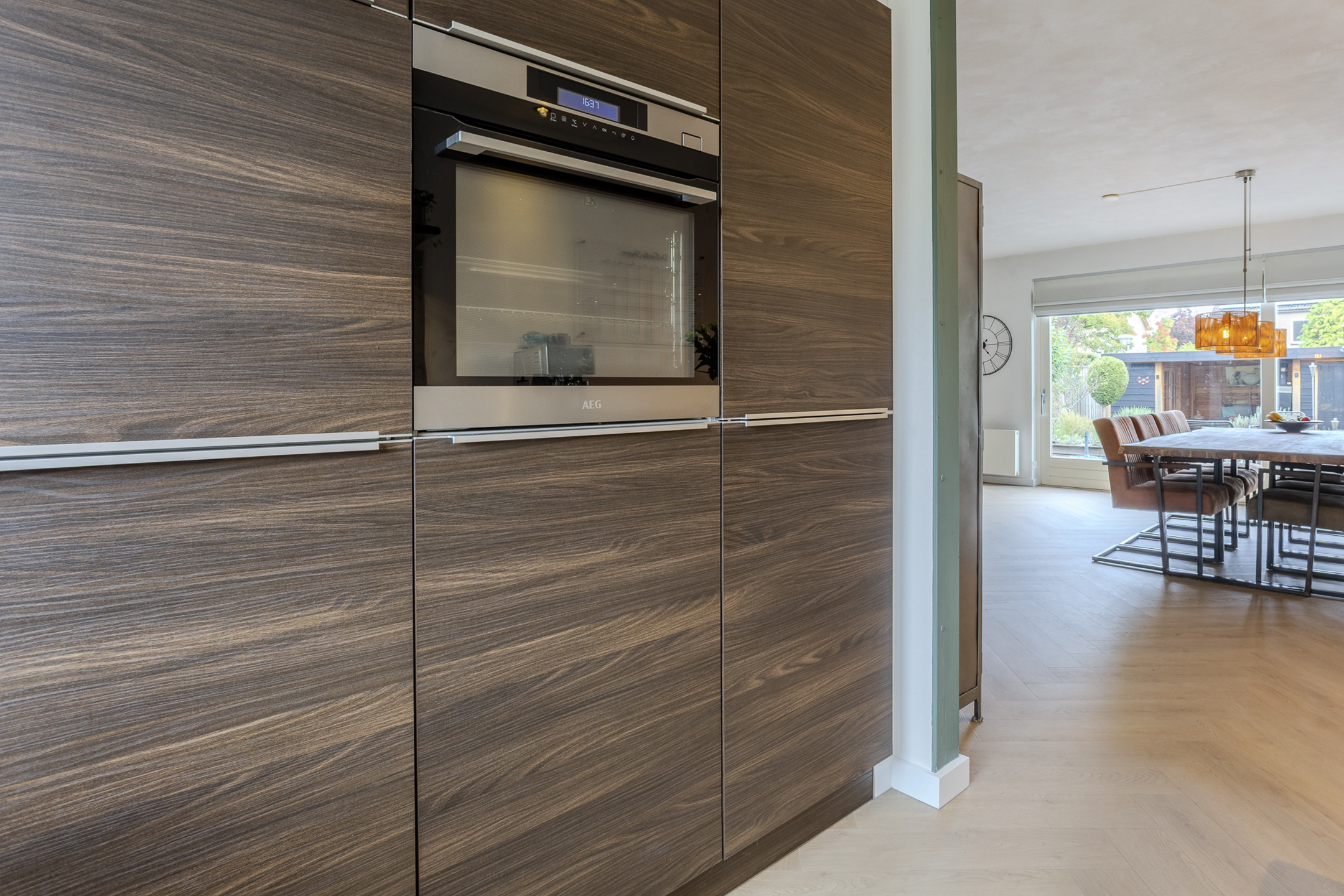 De open keuken bevindt zich aan de voorzijde van de woning en is voorzien van inbouwapparatuur van AEG: een gasfornuis, oven, stoomoven, koelkast, vriezer, Quooker kraan (inclusief 5 liter warmwaterboiler) en een vaatwasser.