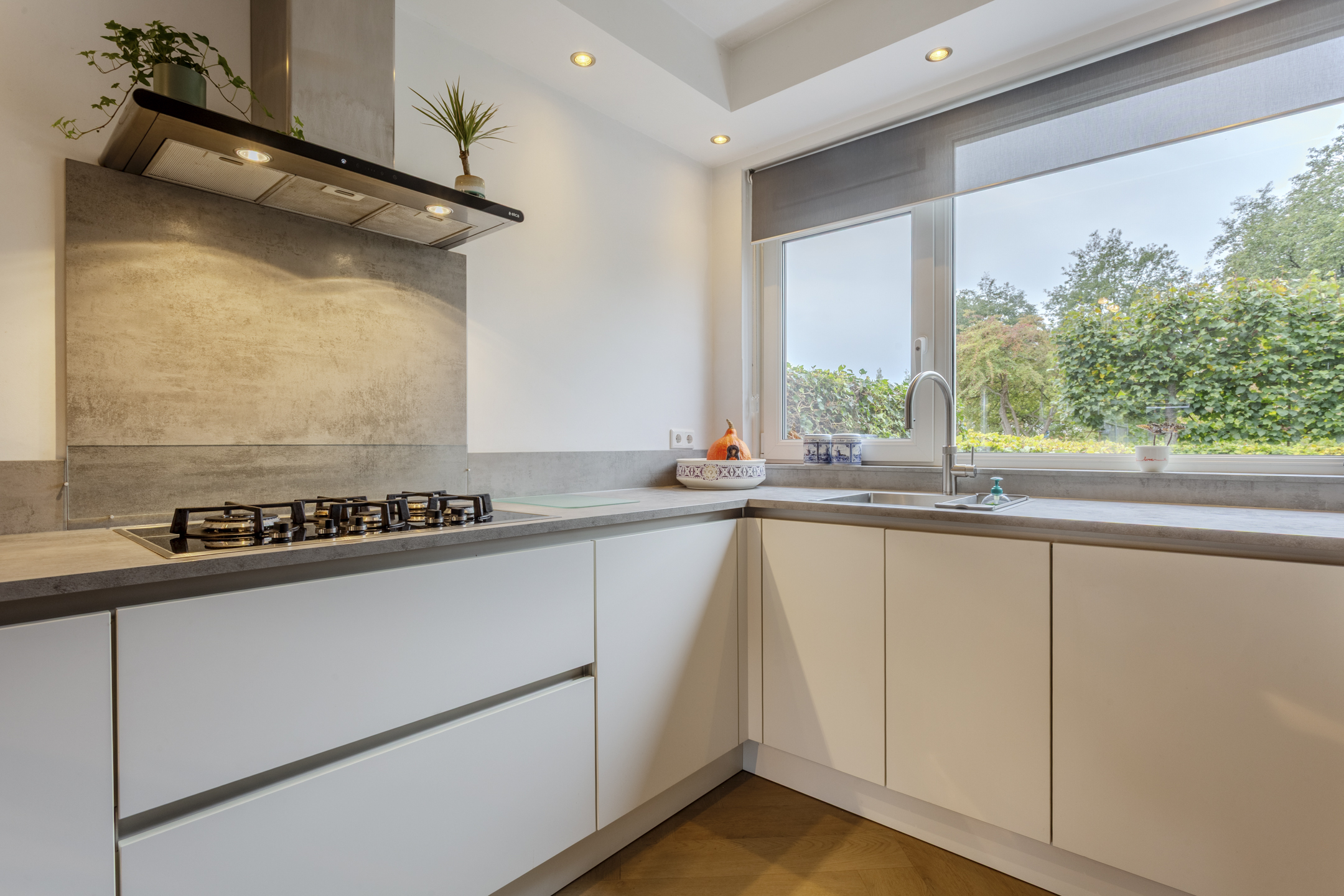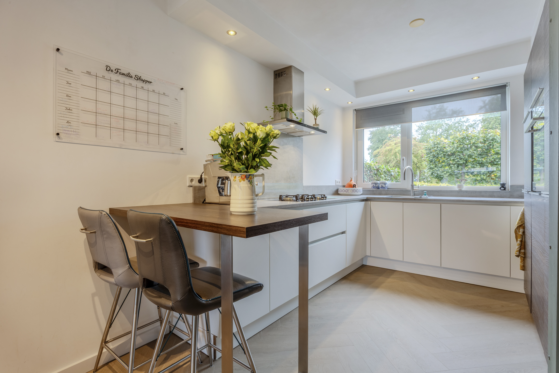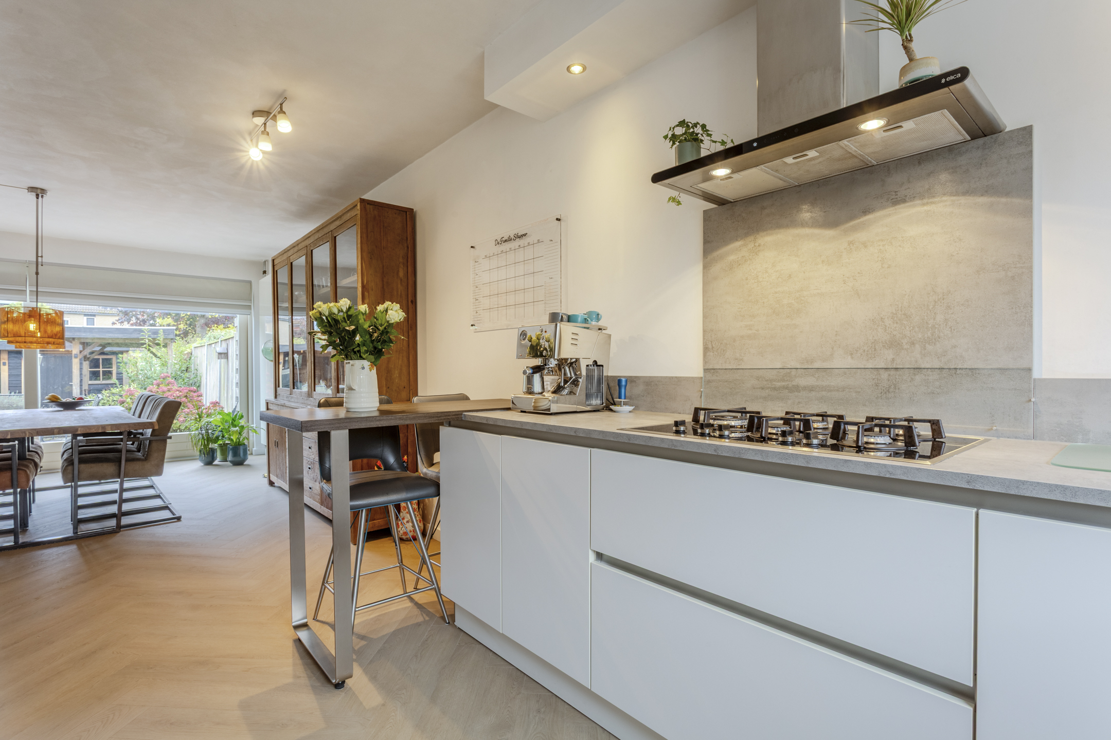De open keuken bevindt zich aan de voorzijde van de woning en is voorzien van inbouwapparatuur van AEG: een gasfornuis, oven, stoomoven, koelkast, vriezer, Quooker kraan (inclusief 5 liter warmwaterboiler) en een vaatwasser.