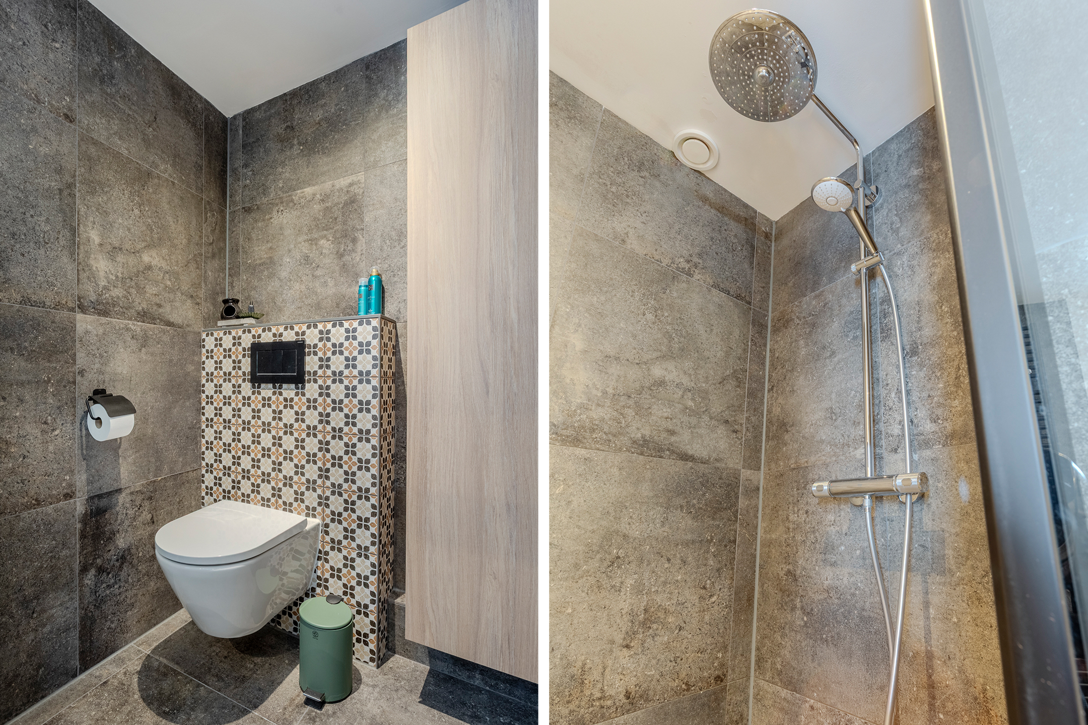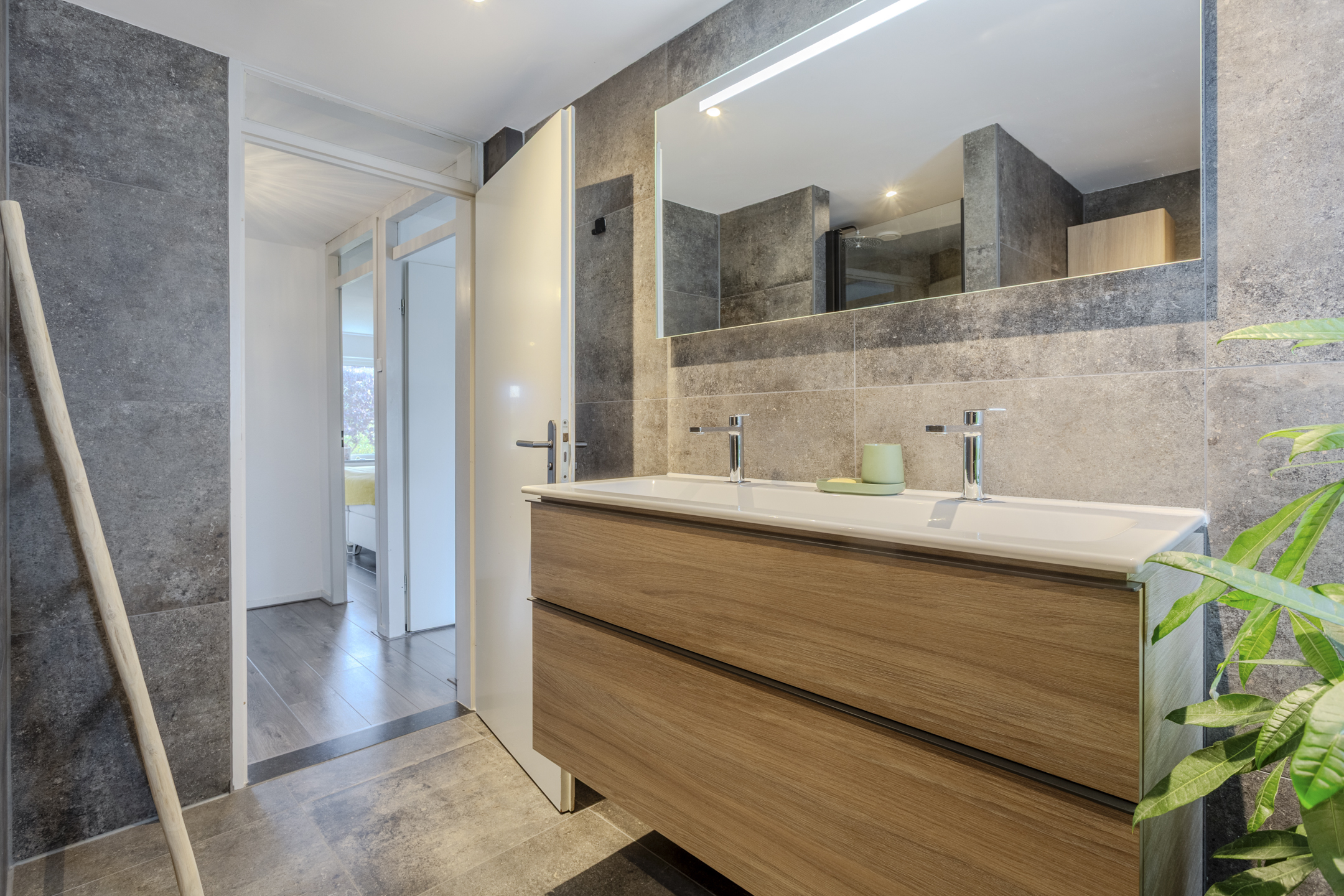 De moderne en ruime badkamer is voorzien van inbouwspotverlichting, een tweede toilet, wastafel met dubbele kraan en meubel en een inloopregendouche.