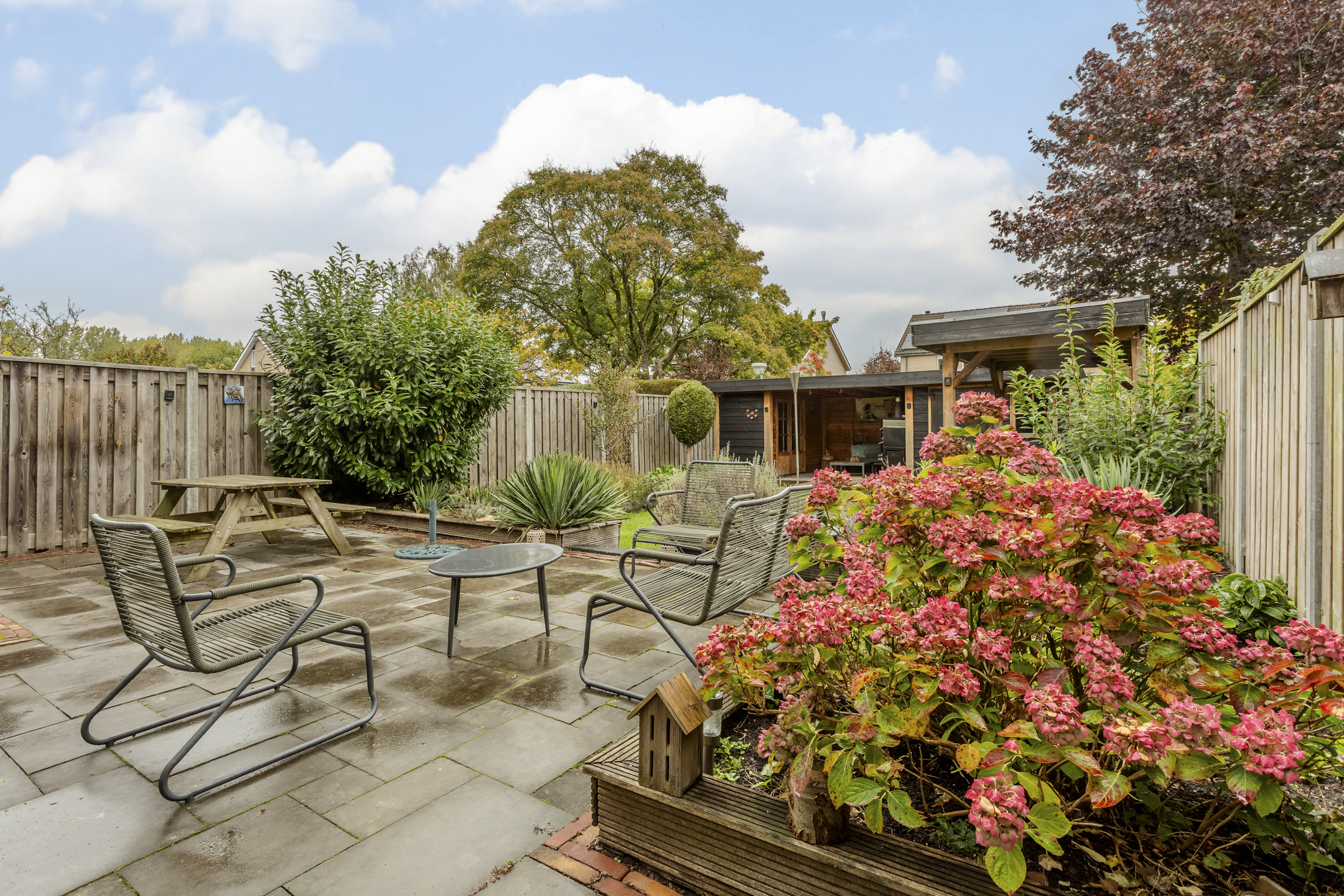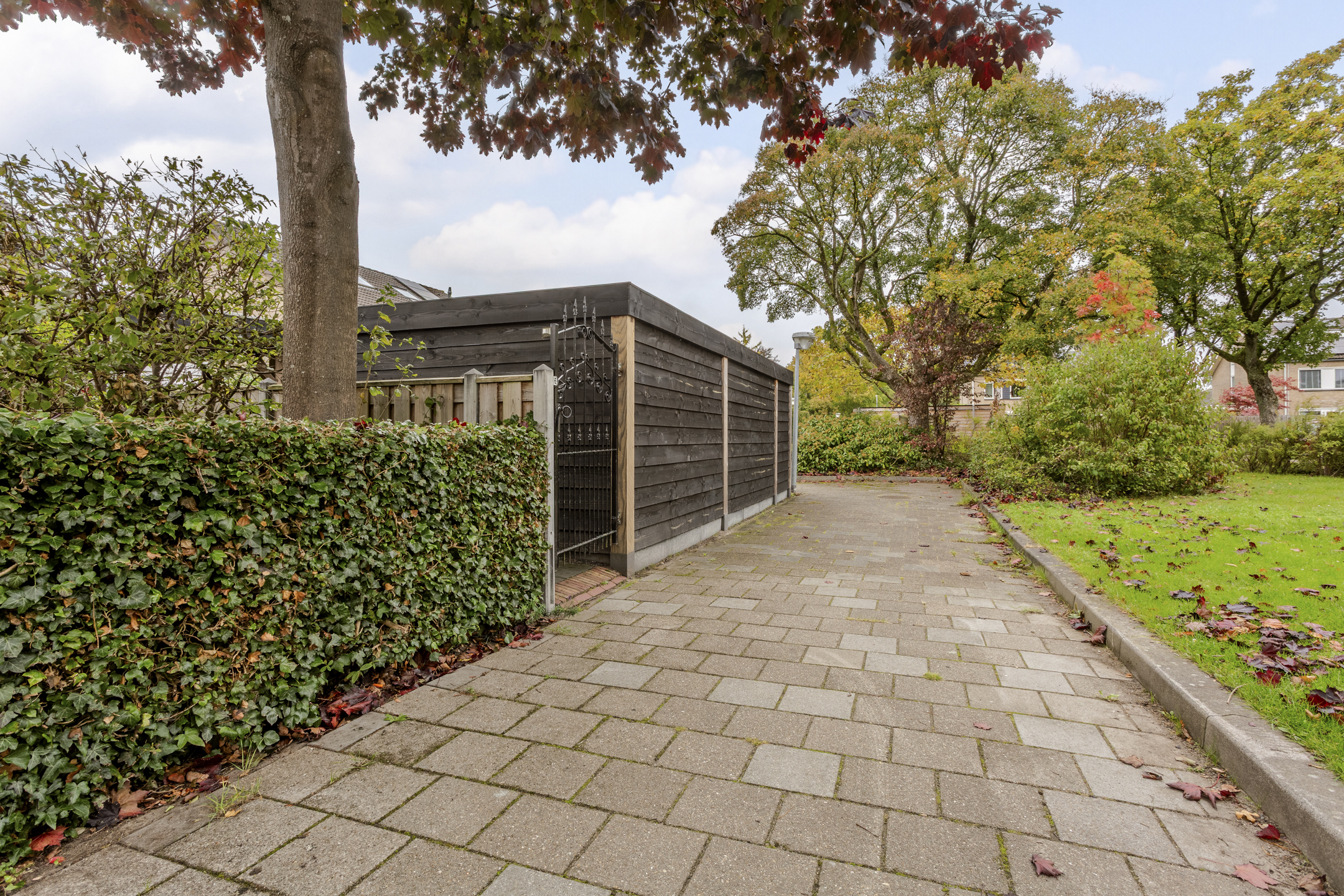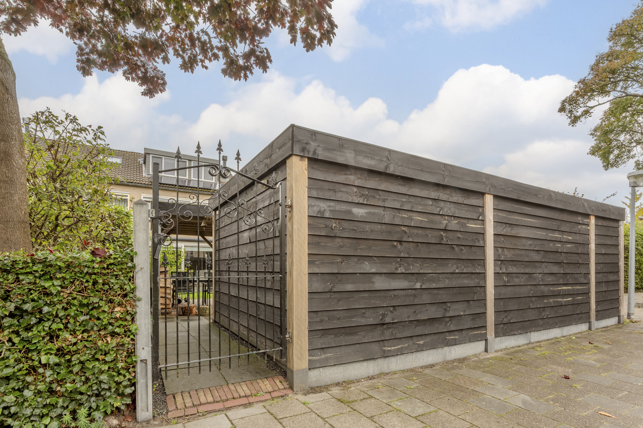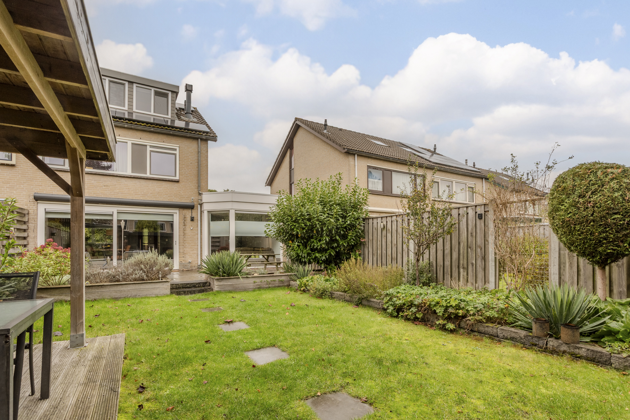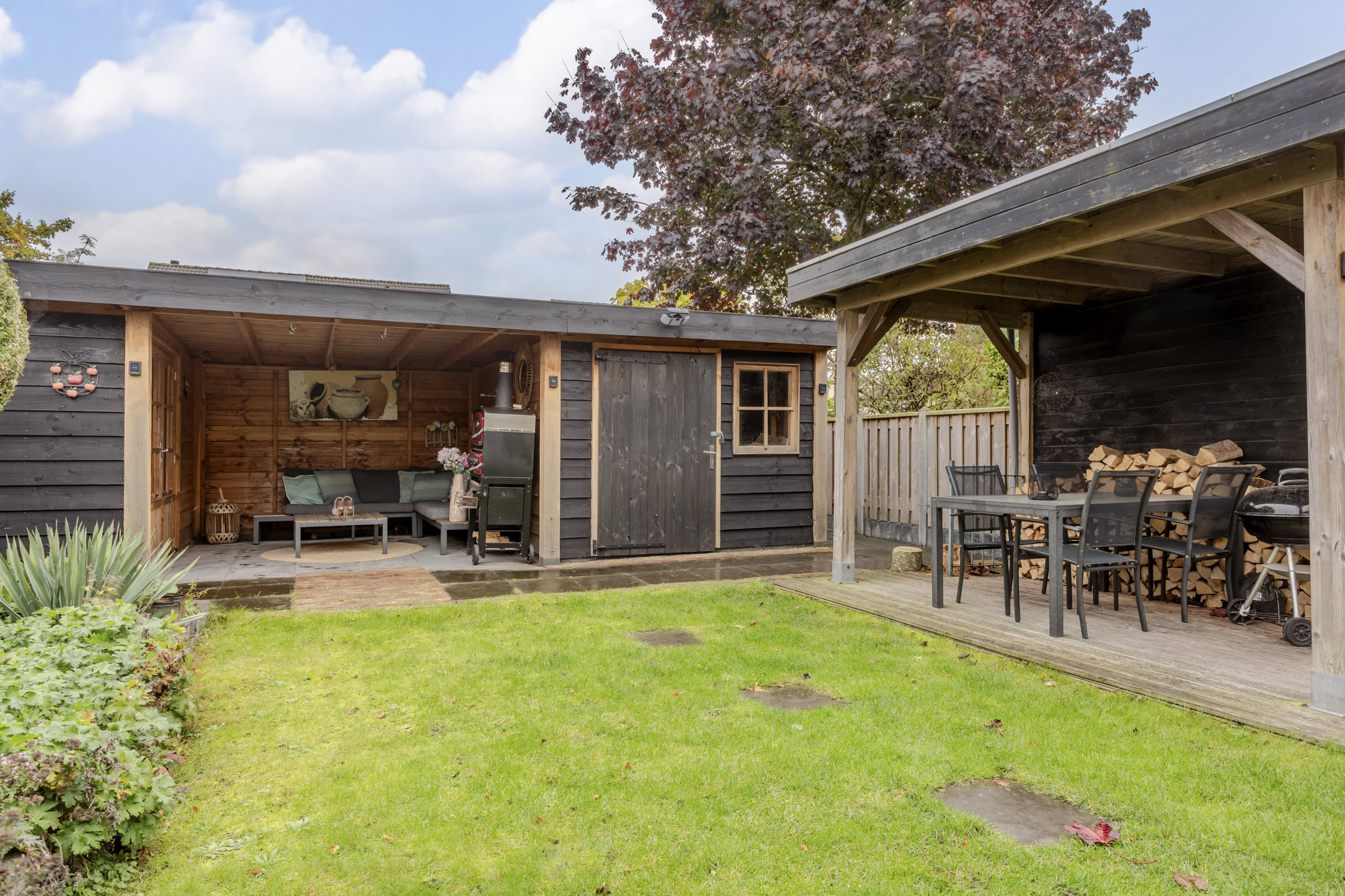 De grote achtertuin is gelegen op het oosten. De tuin is ontzettend diep en is fraai aangelegd met een groot betegeld terras direct achter het huis dat wordt omlijst door groene borders en een groot grasveld. Achterin de tuin zijn in 2017 twee fraaie overkappingen gerealiseerd van Douglas hout waarvan er een twee geschakelde bergingen heeft.