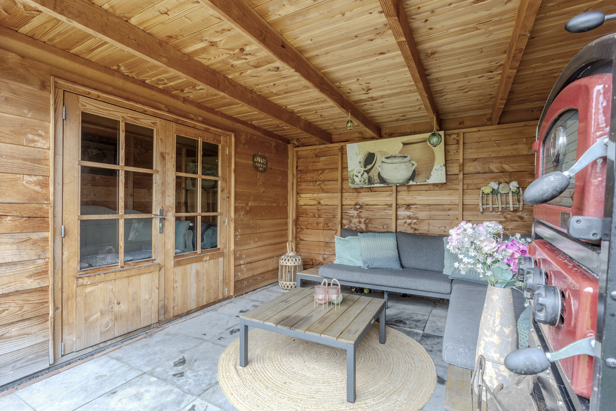 ⢠Grote tuin van van 20 meter diep met twee terrassen onder een houten overkapping