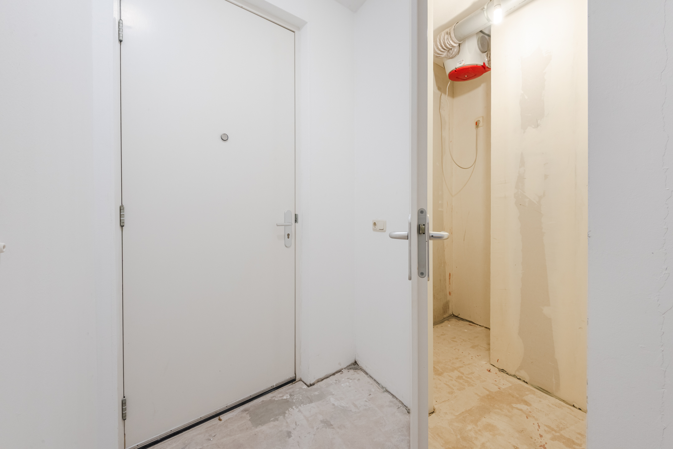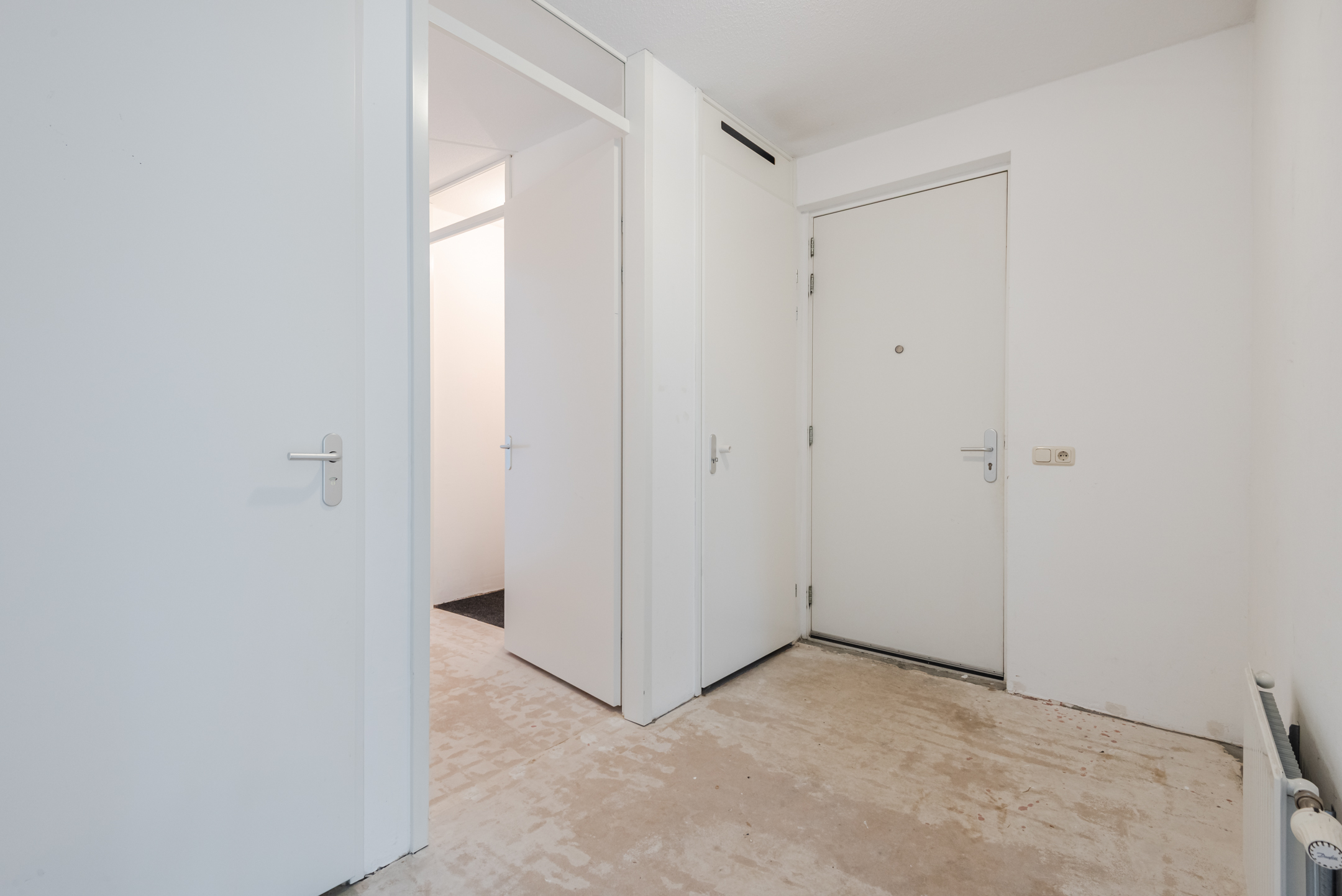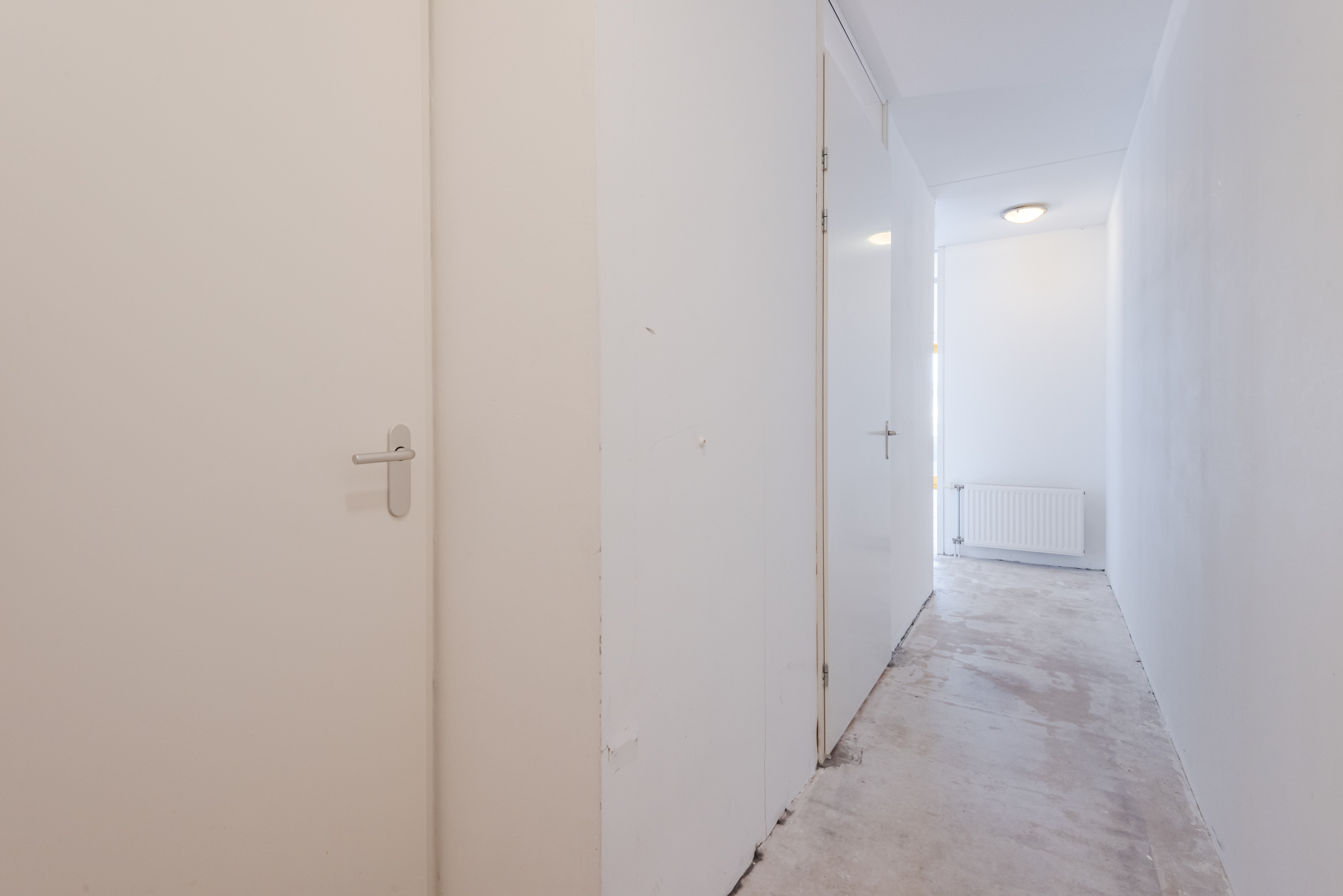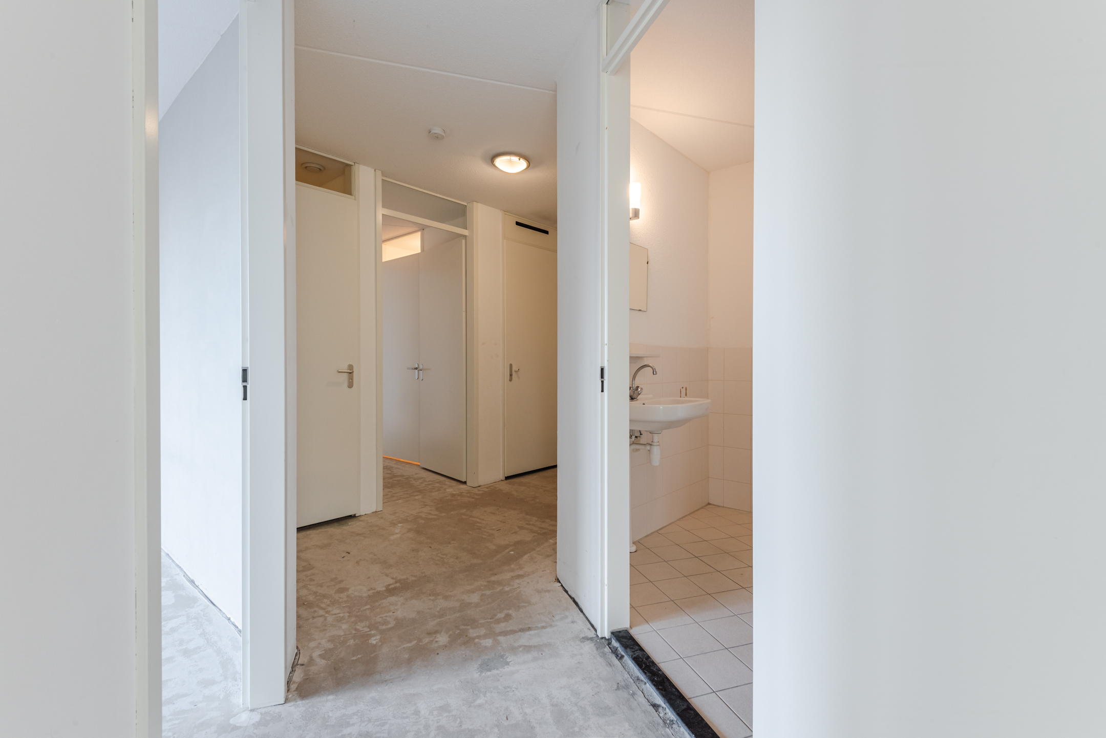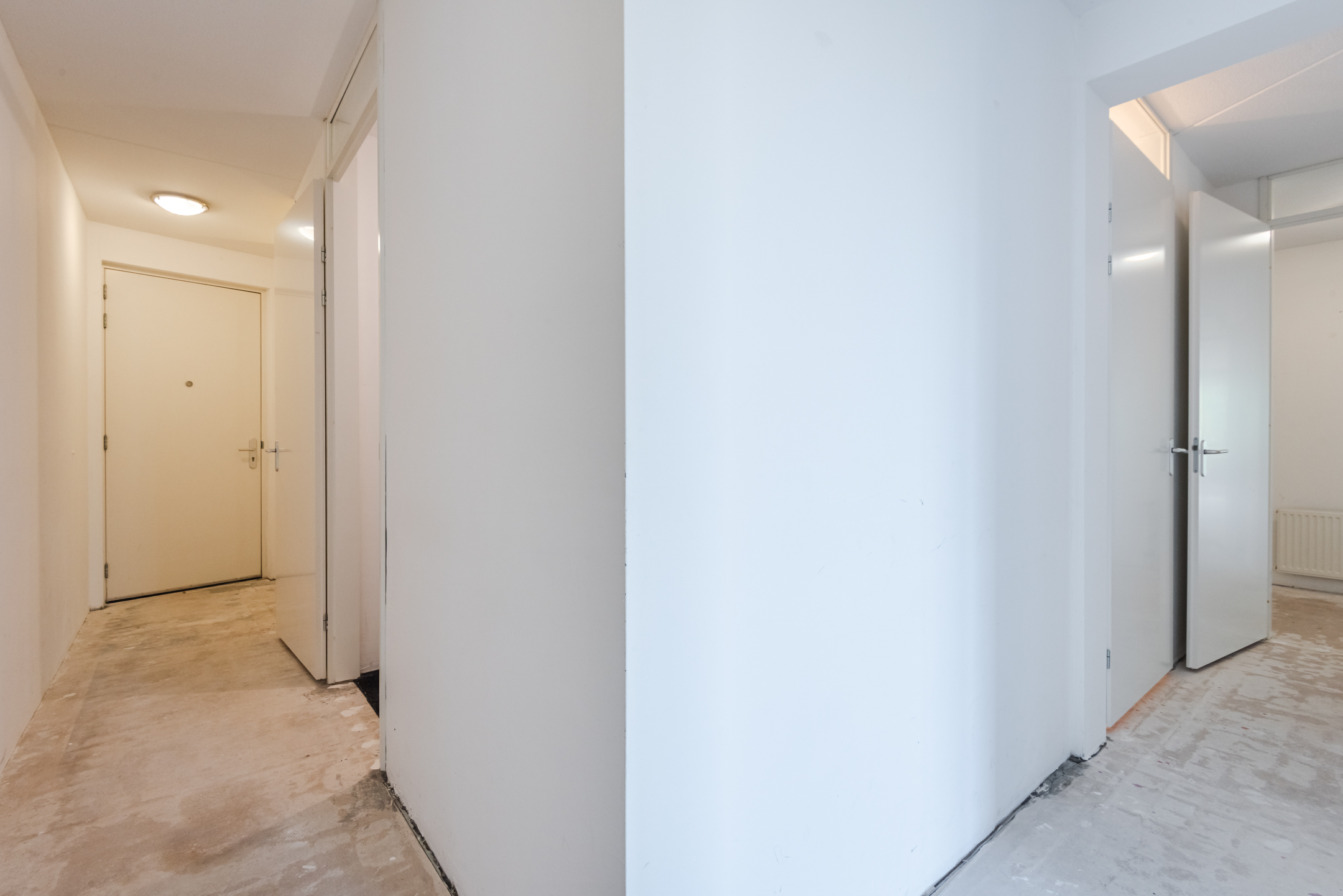 Achter de voordeur vinden we de langwerpige entreehal en geschakelde hal die toegang bieden tot alle ruimtes van het appartement.