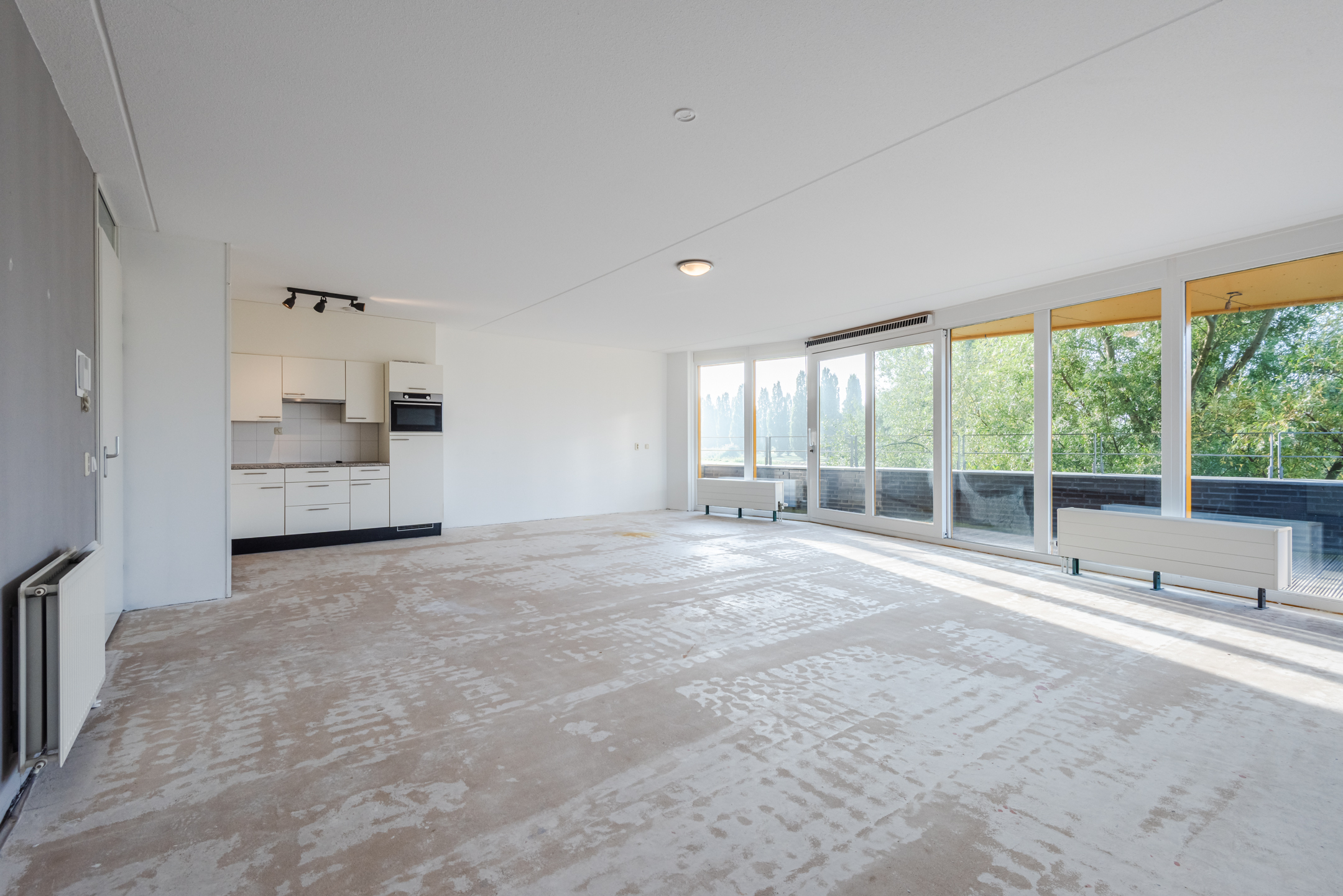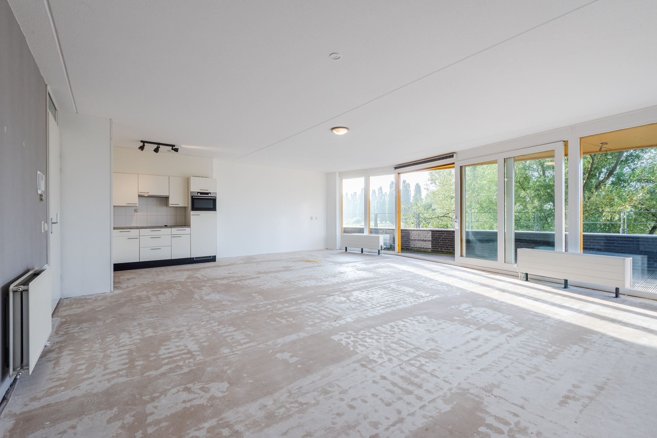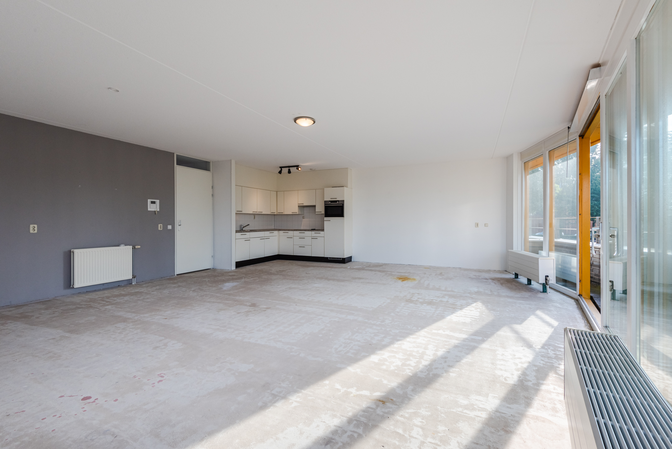 De lichte woonkamer geniet door de grote raampartijen van een grote hoeveelheid lichtinval en beschikt over een grote schuifpui die toegang biedt tot het zeer riante dakterras van ruim 75m2!