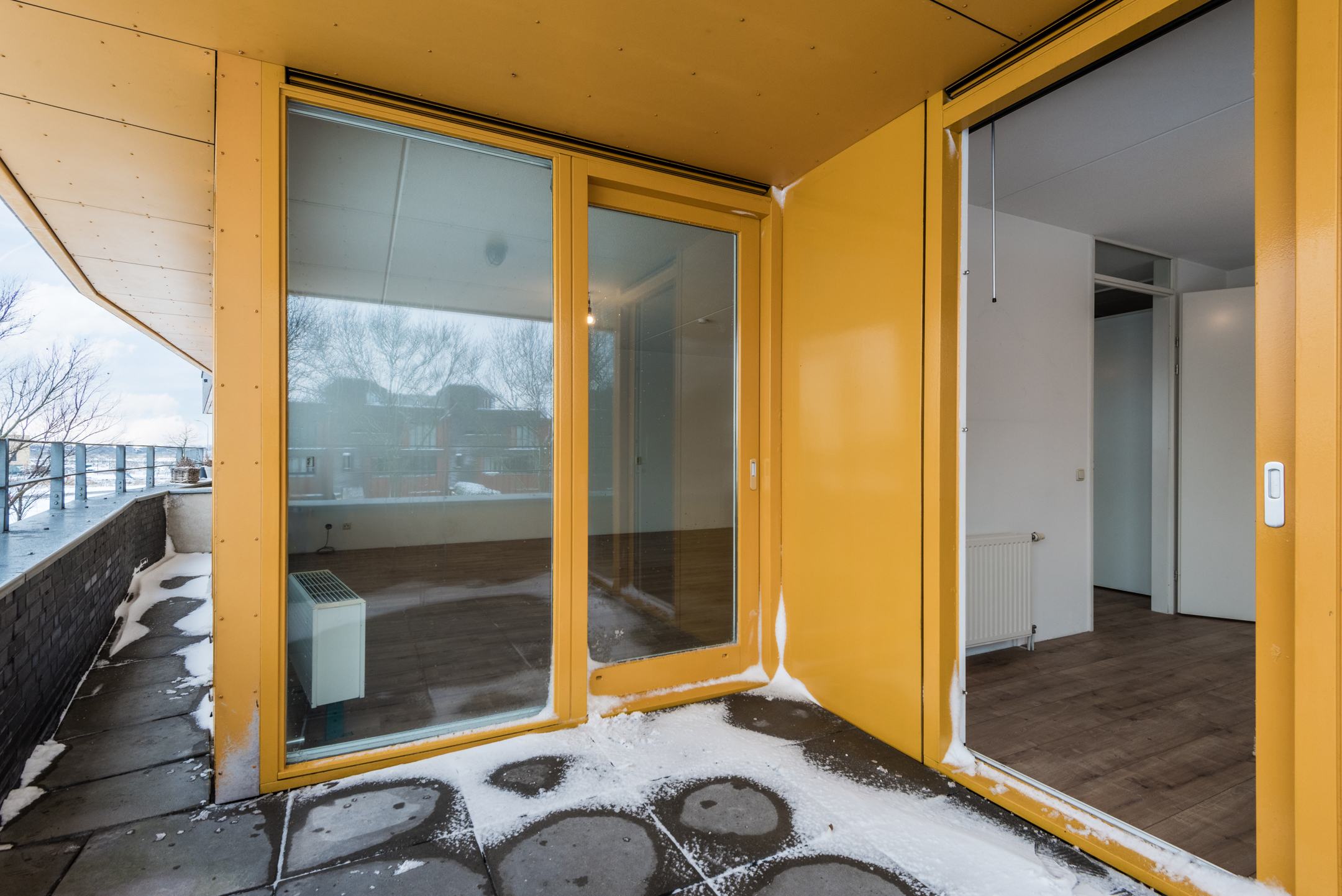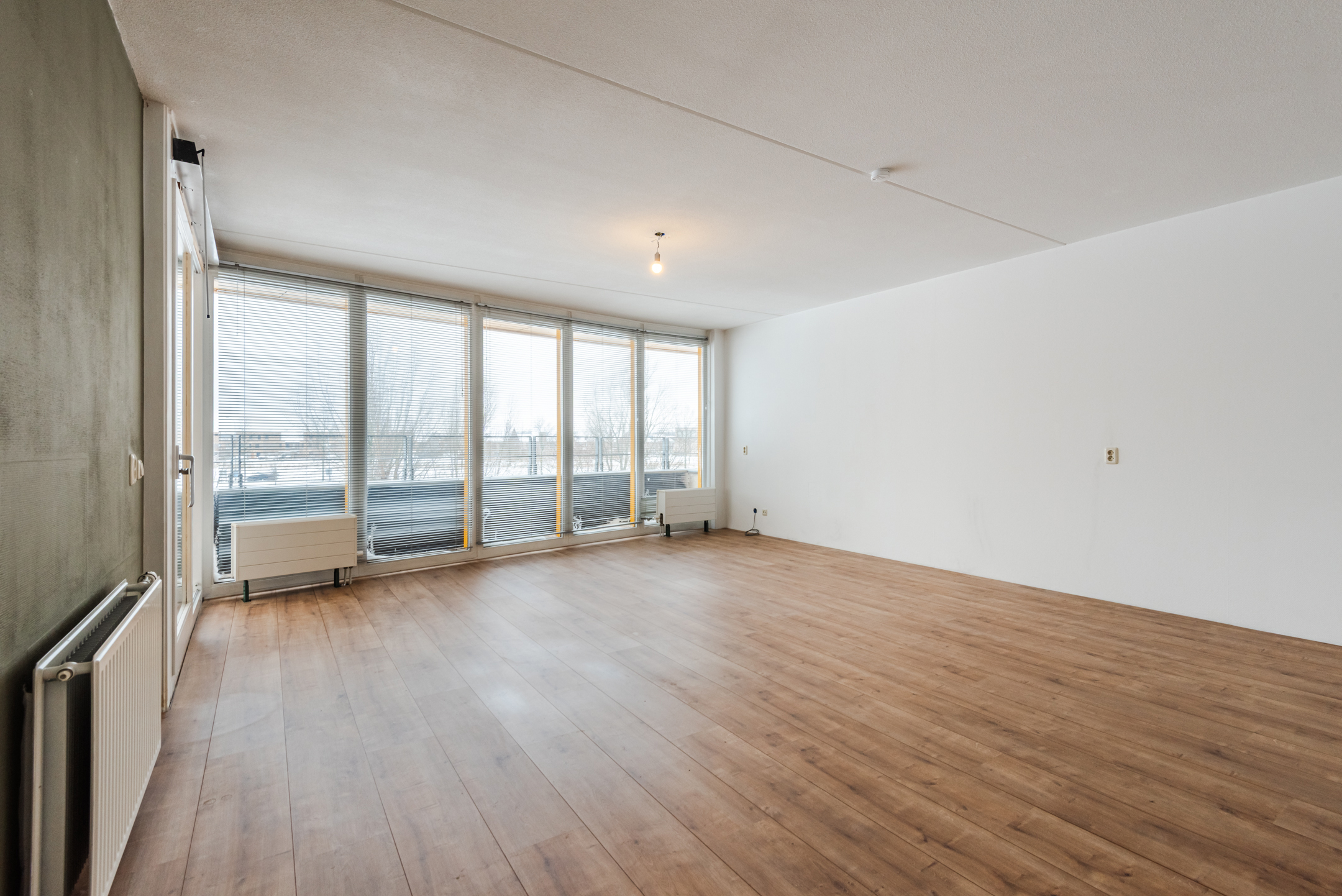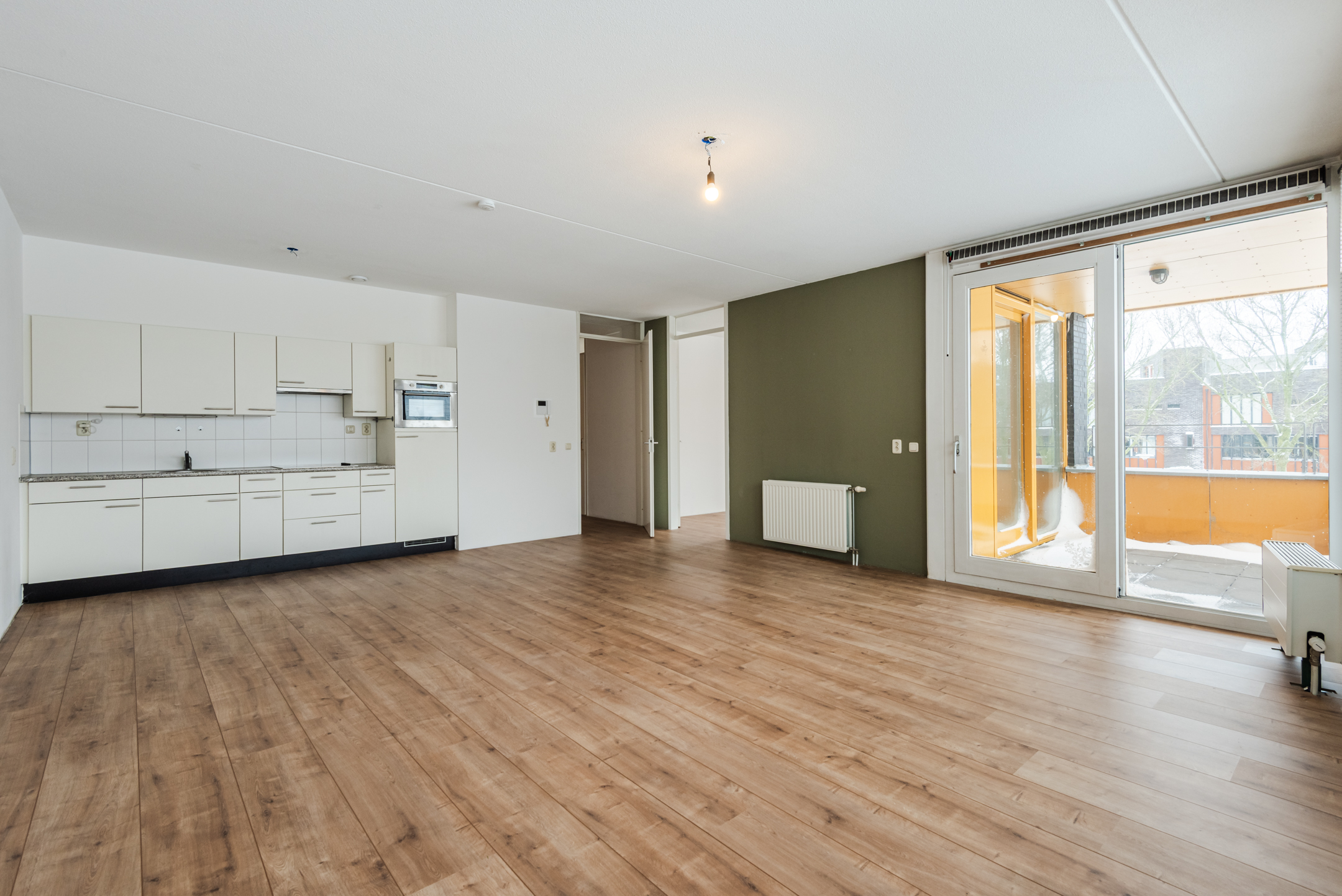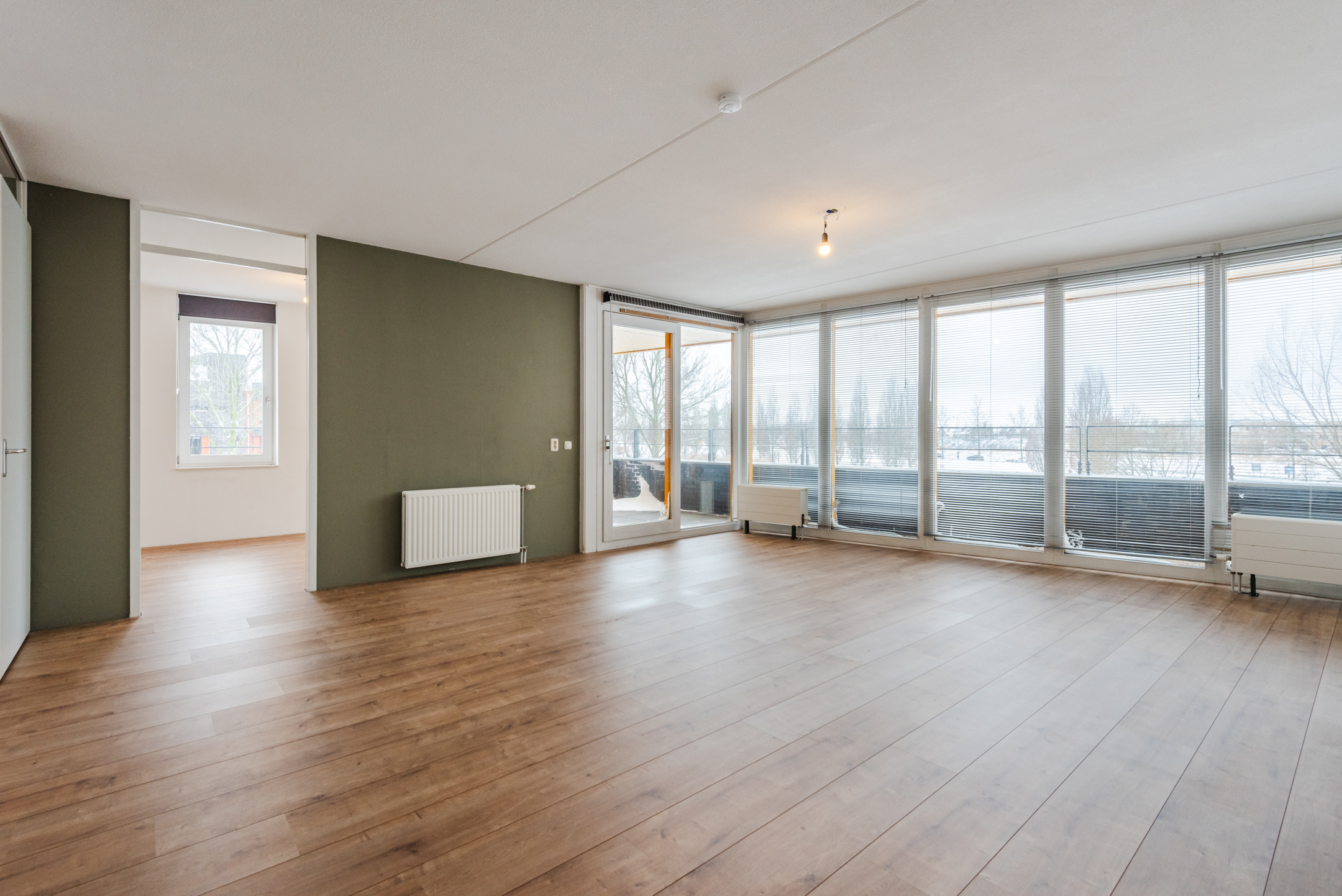 De lichte woonkamer geniet door de grote raampartijen van een grote hoeveelheid lichtinval en beschikt over een grote schuifpui die toegang biedt tot het hoekbalkon. Door de ligging op het zuiden profiteer je zowel in de woonkamer als buiten op het balkon van optimale zon en tevens is er een mooi vrij uitzicht over groen.
