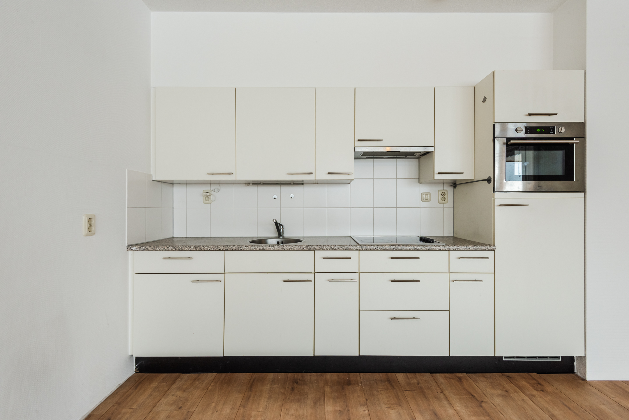 De open keuken beschikt over een keramische kookplaat, koelkast en een combimagnetron/oven.