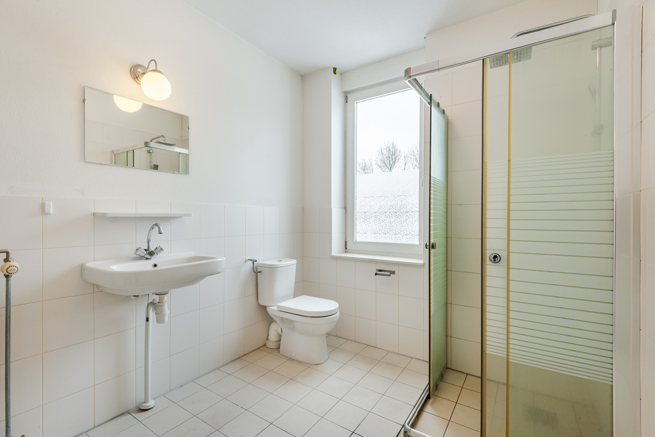 De ruime badkamer beschikt over een toilet, wastafel en een inloopdouche.