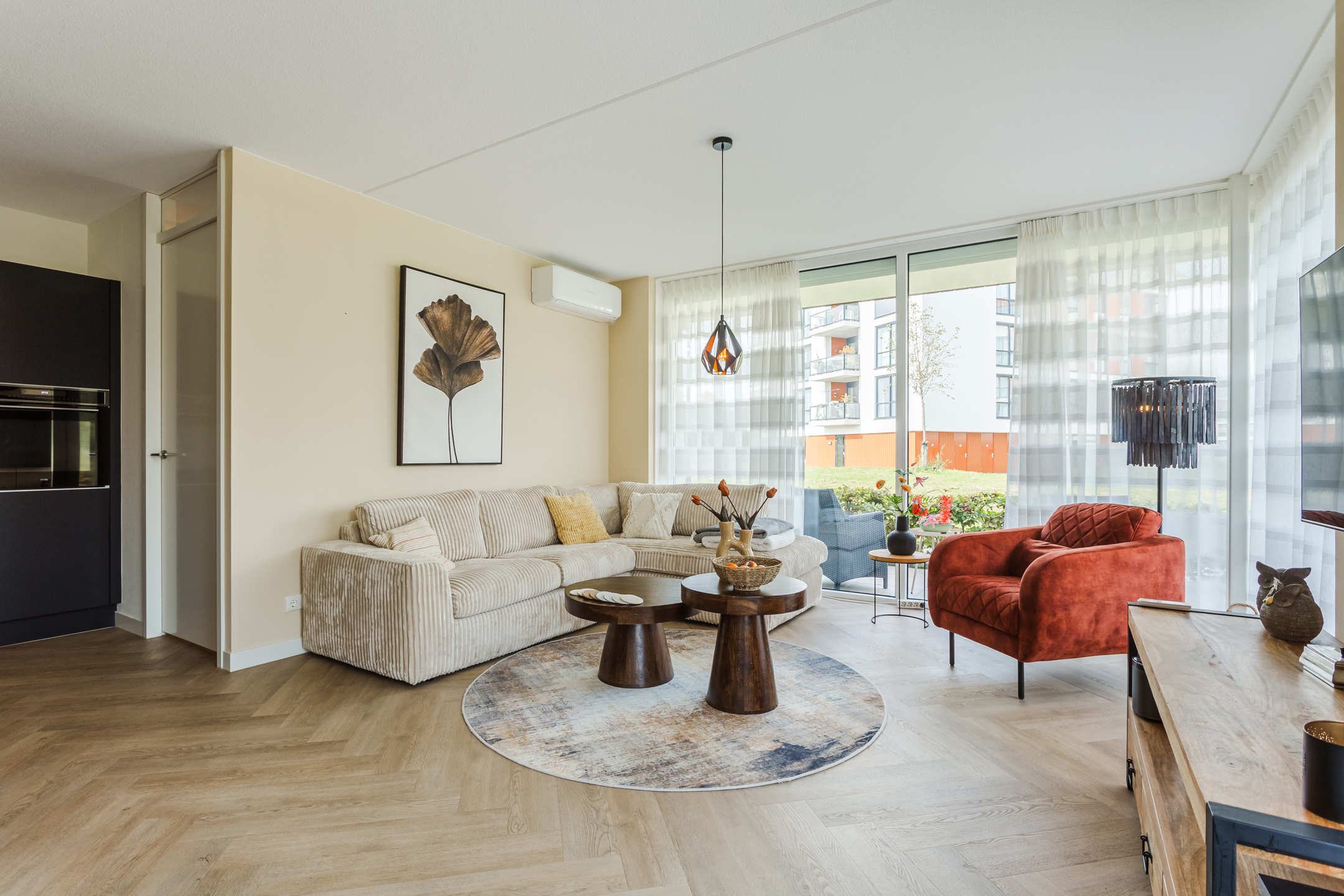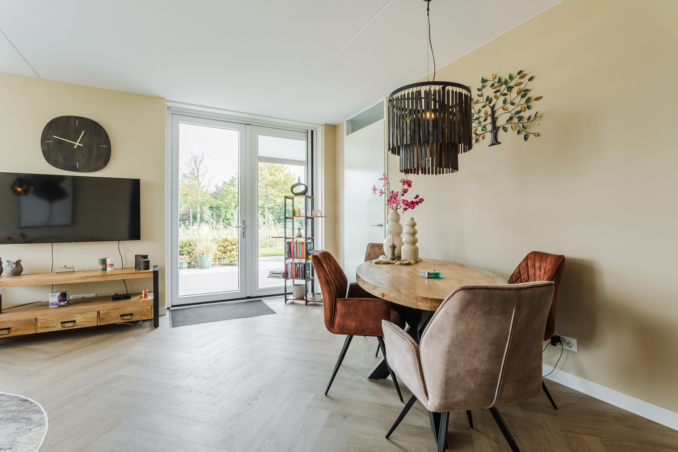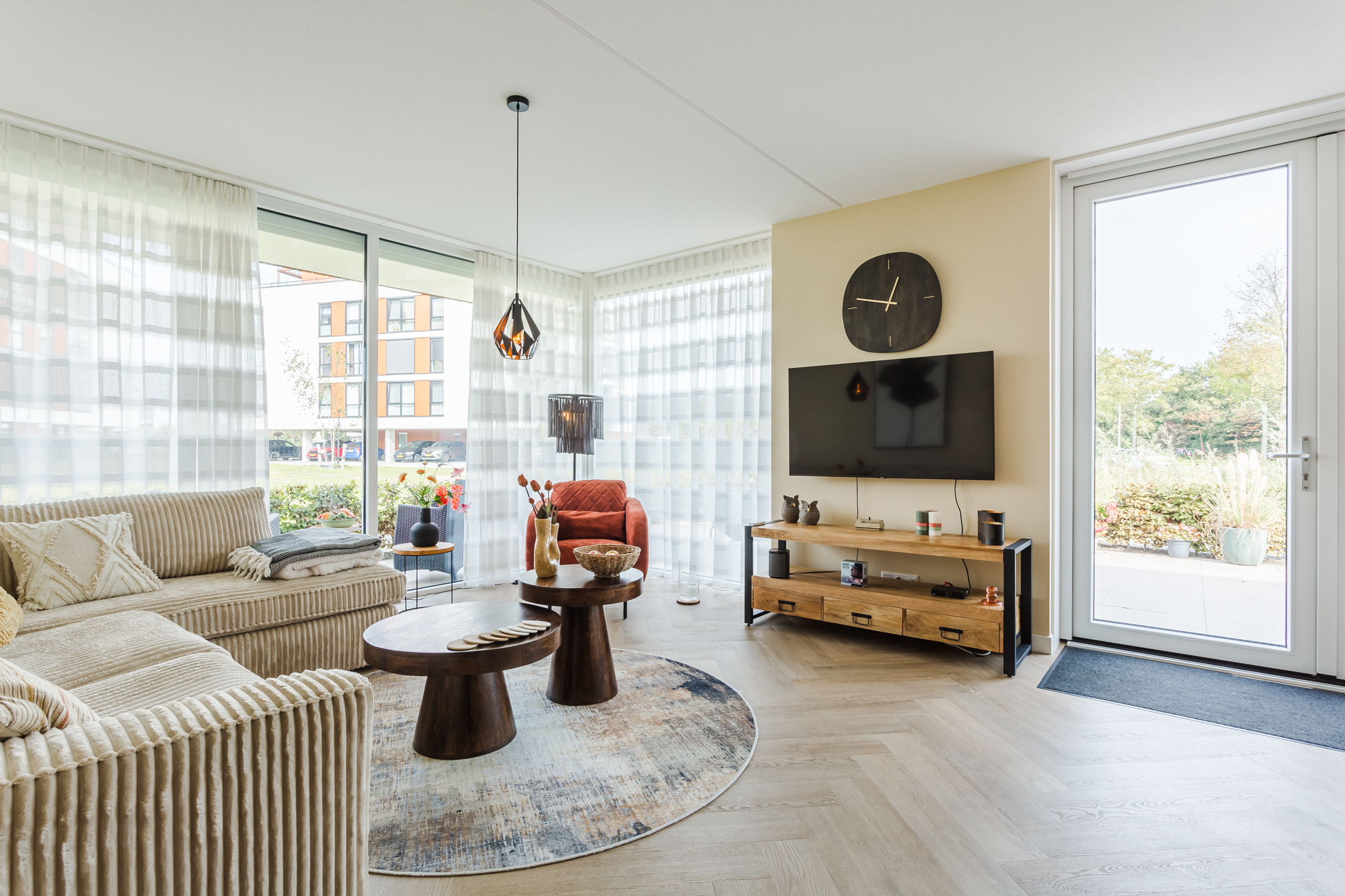 De sfeervolle woonkamer is gelegen op een hoek en geniet door de grote raampartijen van een prettige hoeveelheid lichtinval. Openslaande deuren bieden toegang tot het eigen terras.