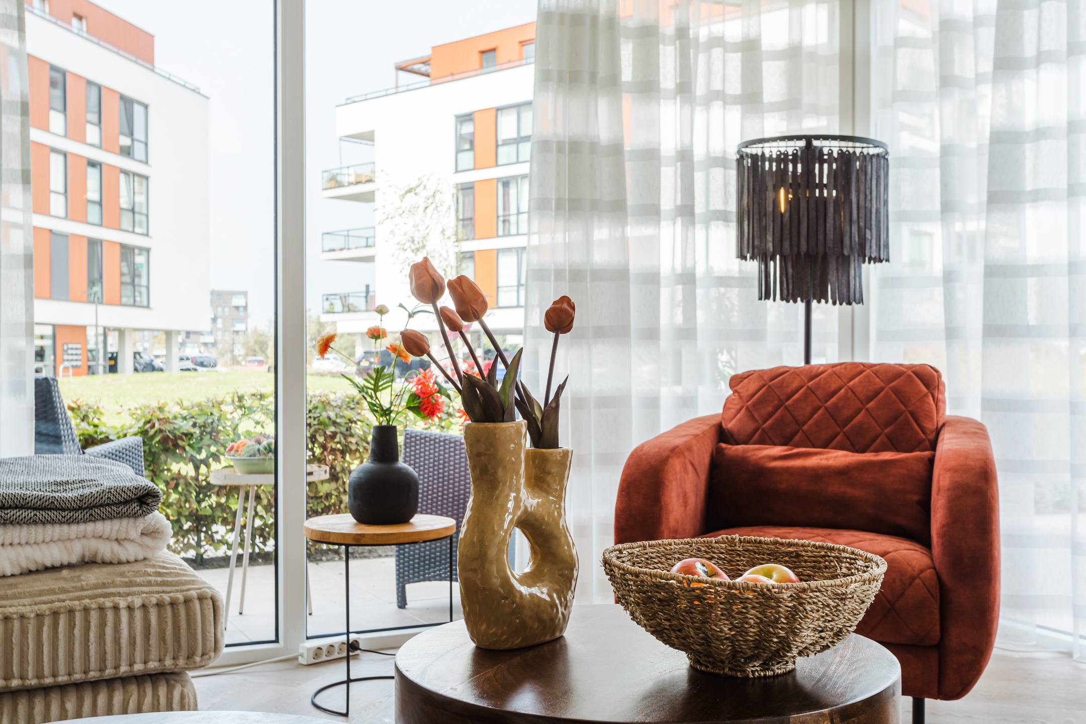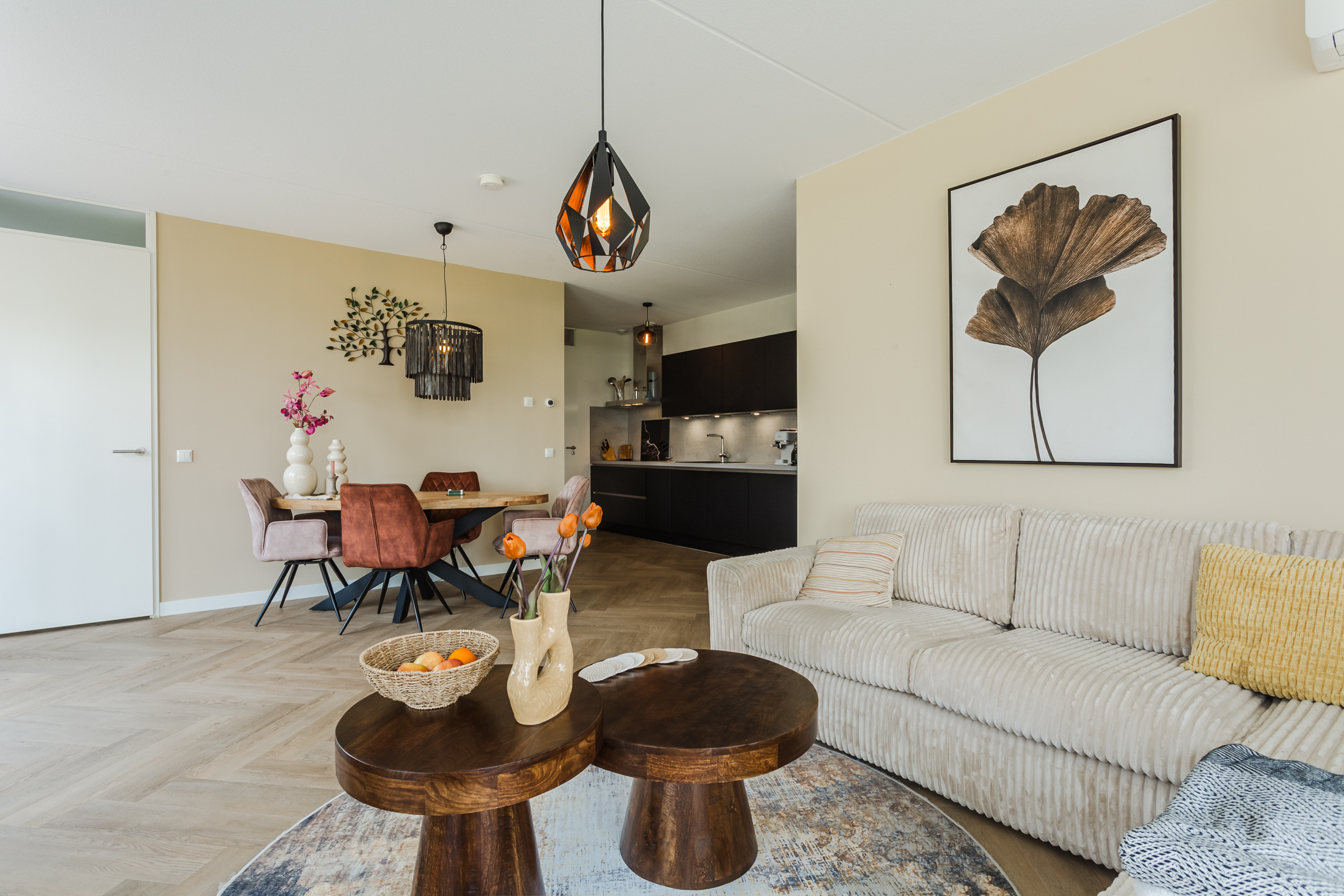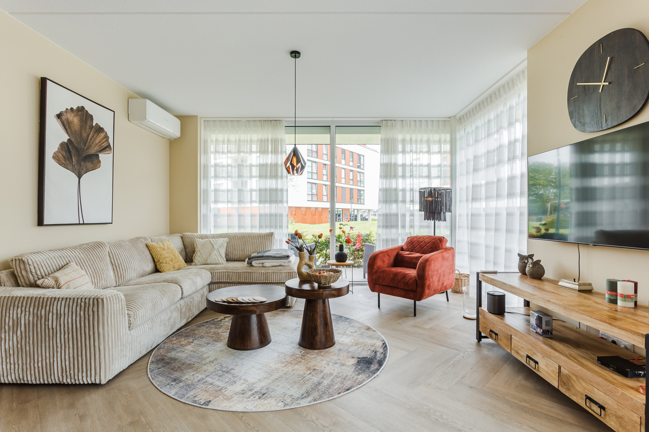 De sfeervolle woonkamer is gelegen op een hoek en geniet door de grote raampartijen van een prettige hoeveelheid lichtinval. Openslaande deuren bieden toegang tot het eigen terras.