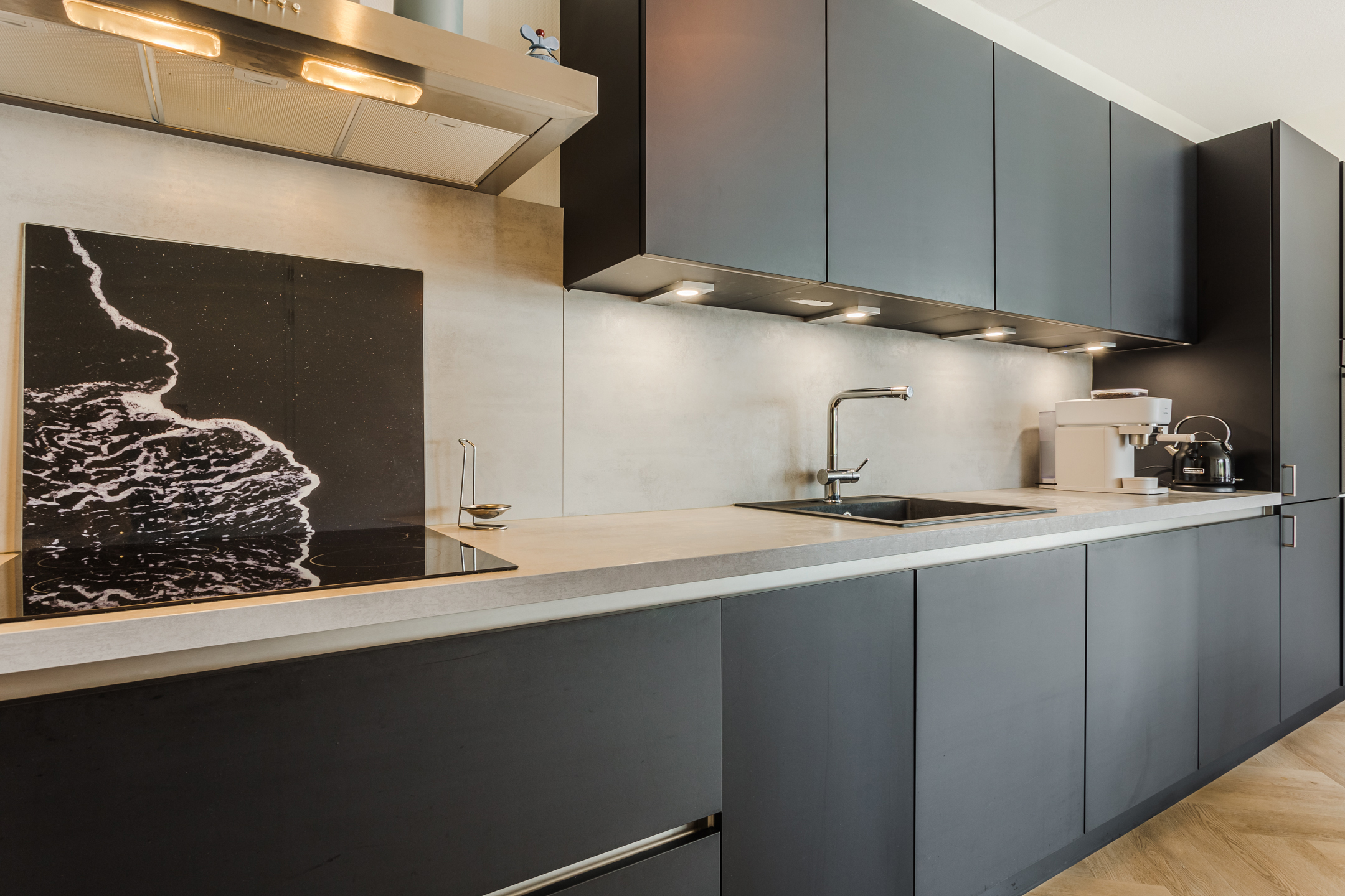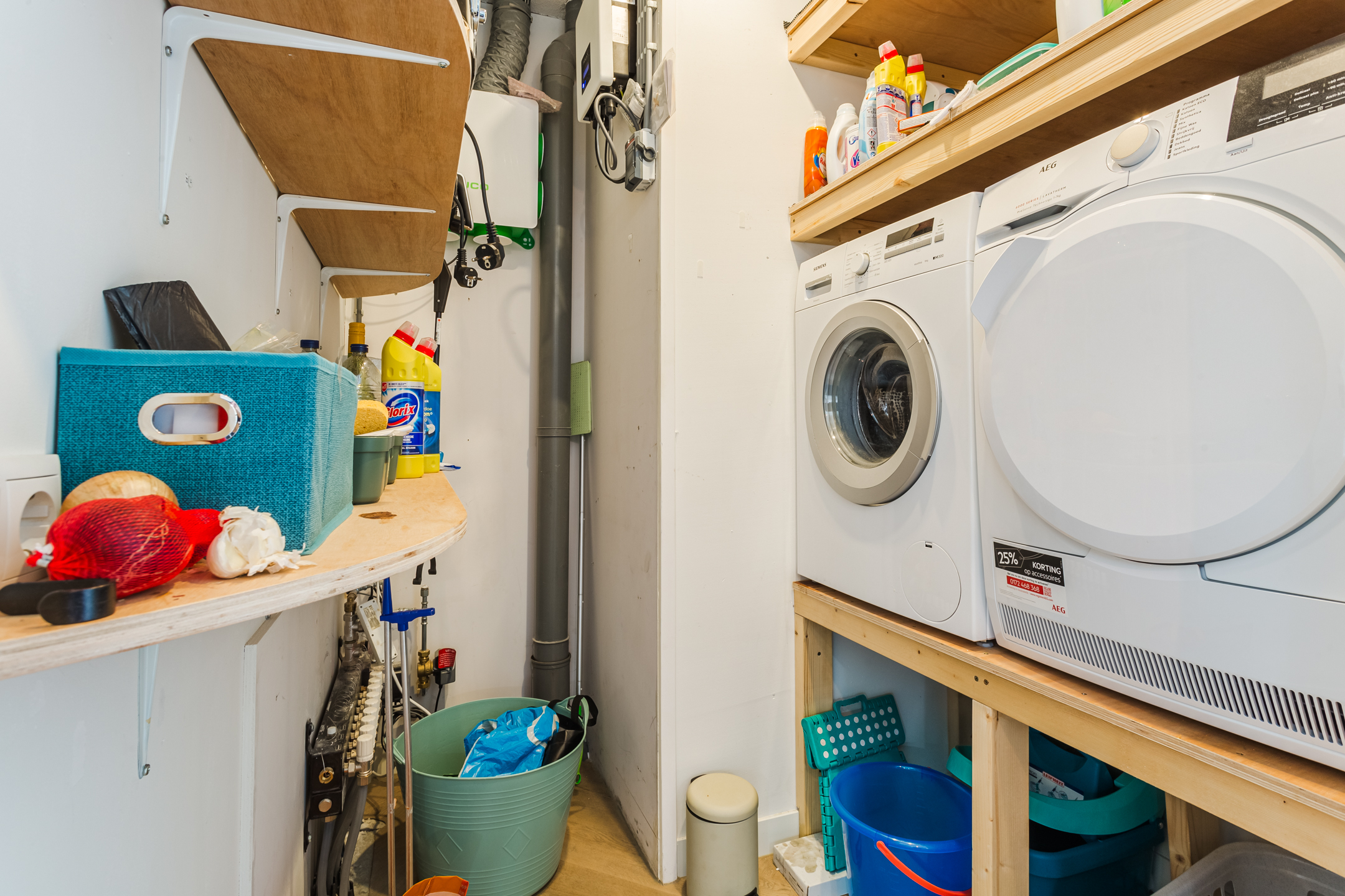 De luxe half open keuken is voorzien van een inductiekookplaat, oven, magnetron, koelkast, vriezer en een vaatwasser. Tegenover de keuken zit een aparte wasruimte/berging en direct naast de keuken een ruime inloopkast met raam die dus tevens te gebruiken zou zijn als extra kamertje.
