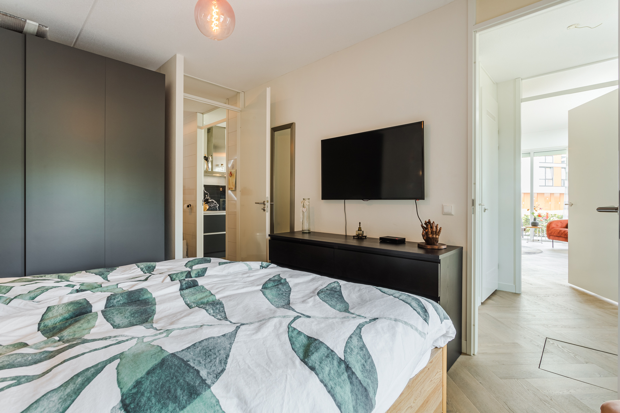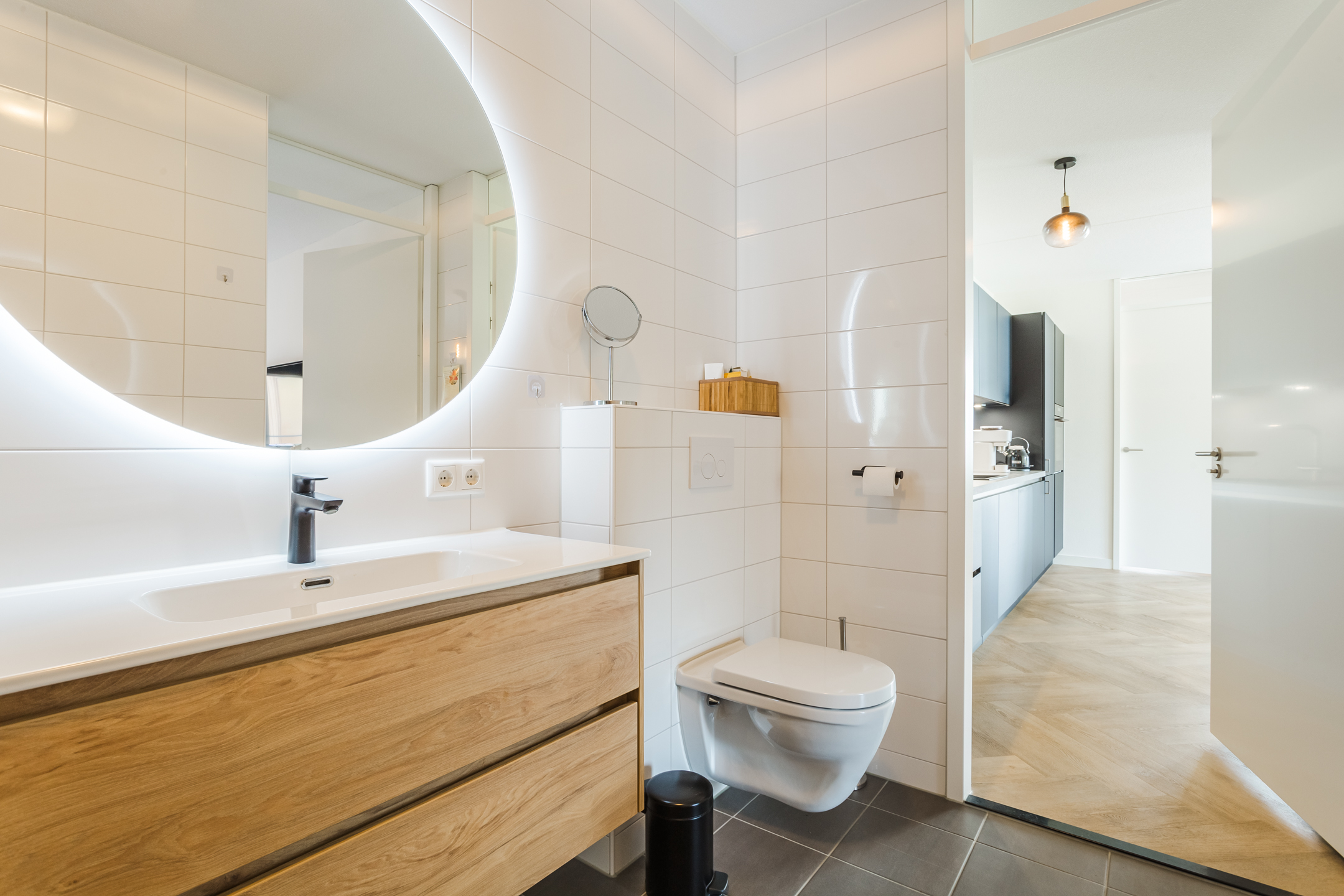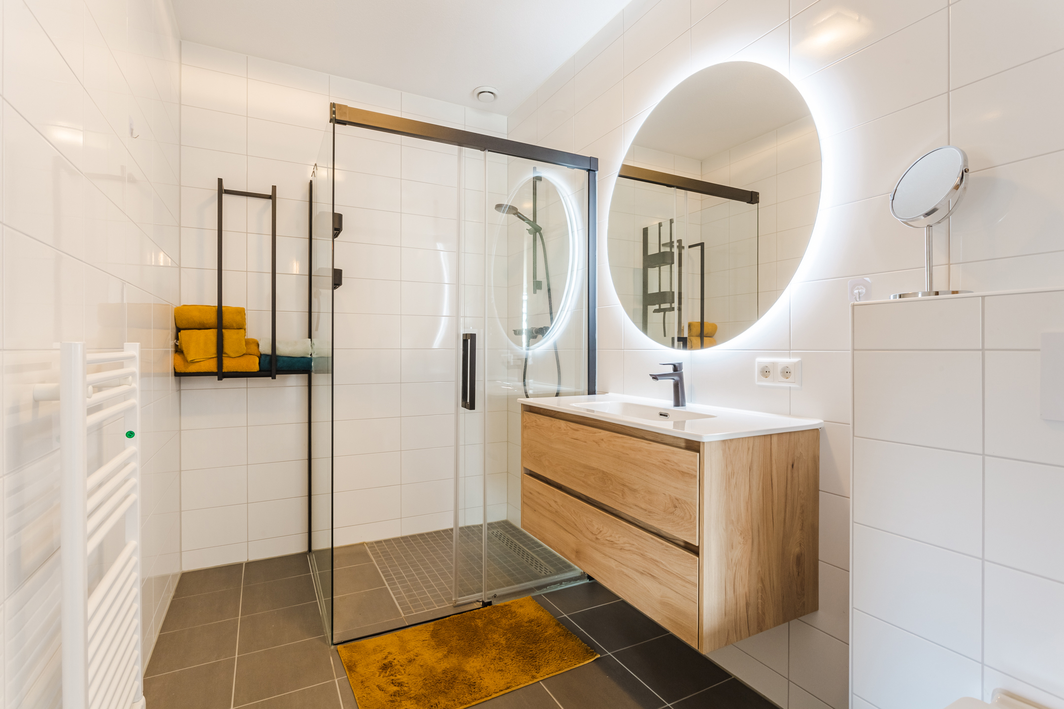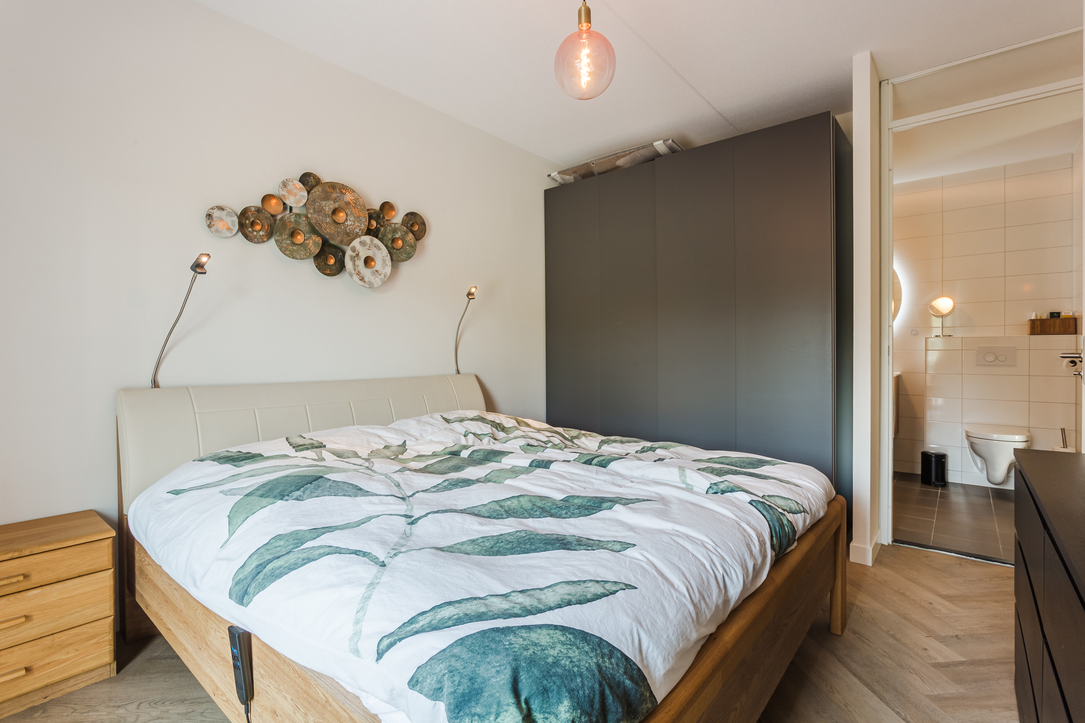De grote slaapkamer biedt en suite toegang tot de badkamer met een zwevend toilet, wastafel met meubel en een inloopdouche.