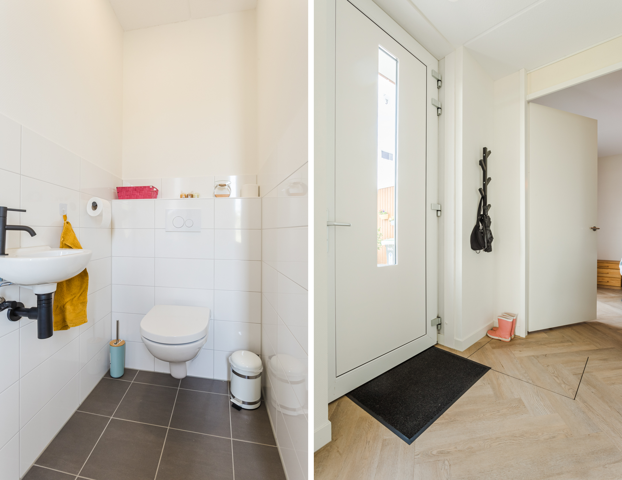 Achter de voordeur vinden we de entreehal met de meterkast, het gastentoilet met fonteintje en toegang tot zowel de woonkamer als tot de slaapkamer.