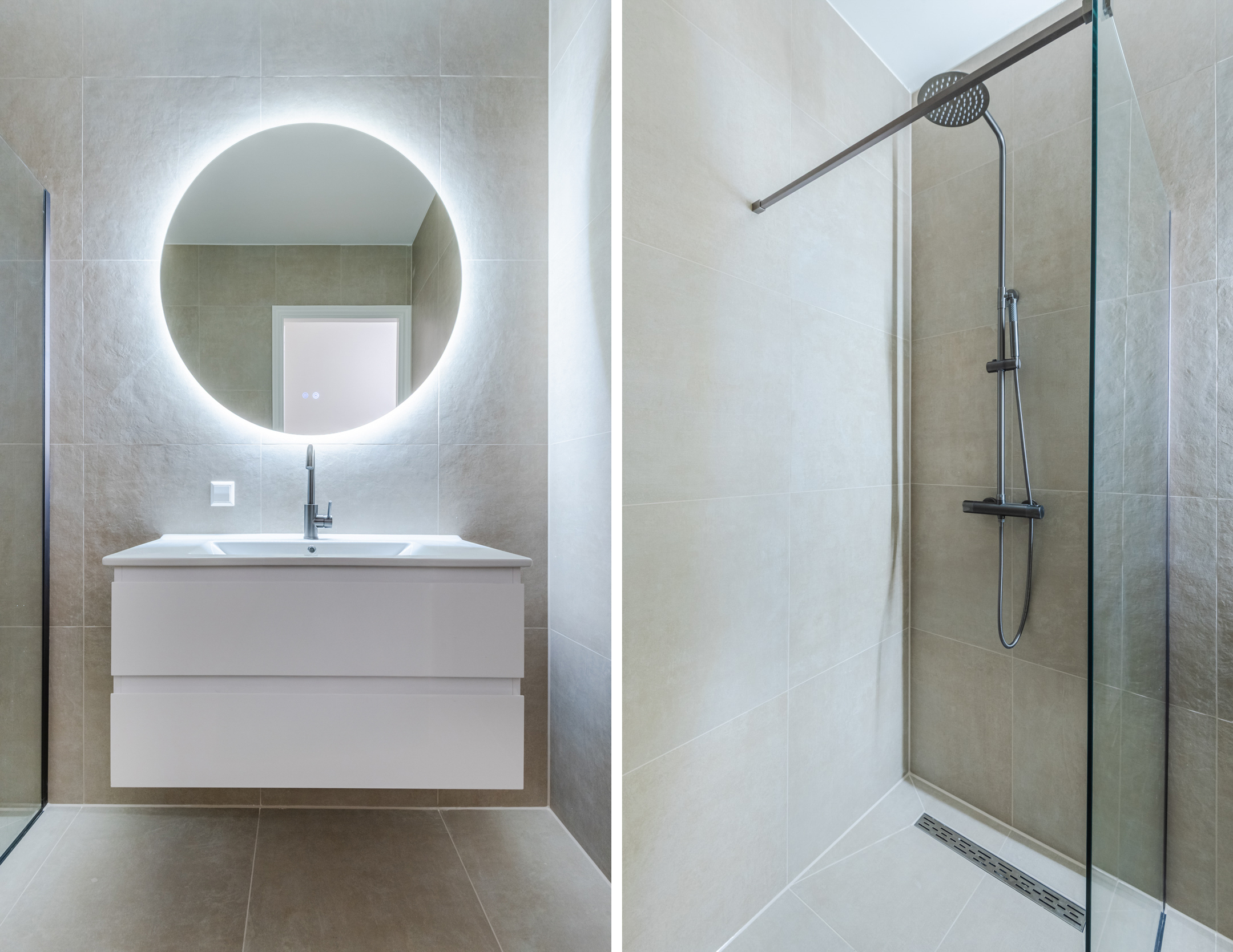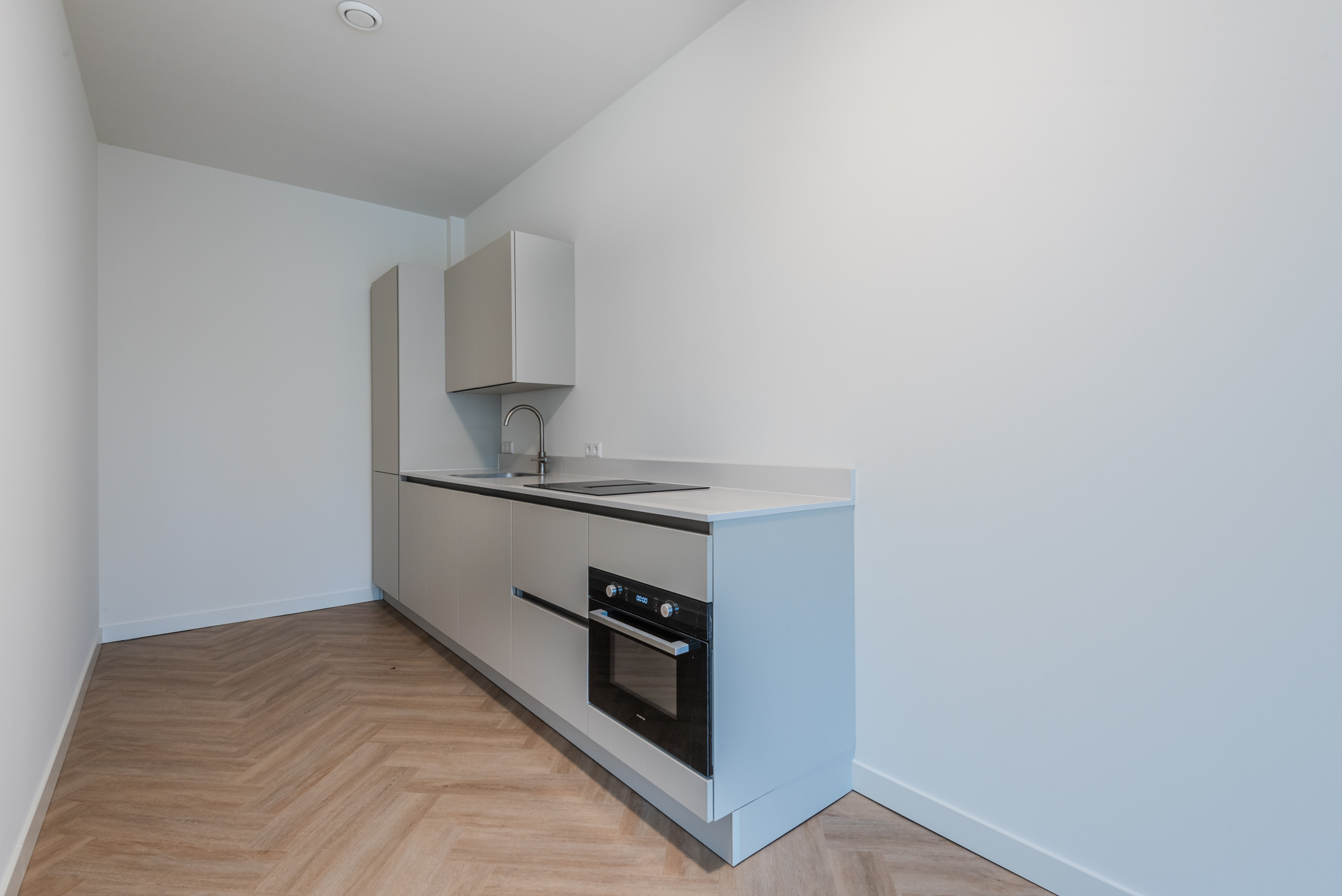 Het appartement beschikt over 1 slaapkamer van een goed formaat met grote raampartijen, zeer ruime berging, een aparte wasruimte, luxe badkamer met wastafel met meubel, verlichte spiegel en een inloopregendouche en het separate (gasten)toilet met fonteintje.