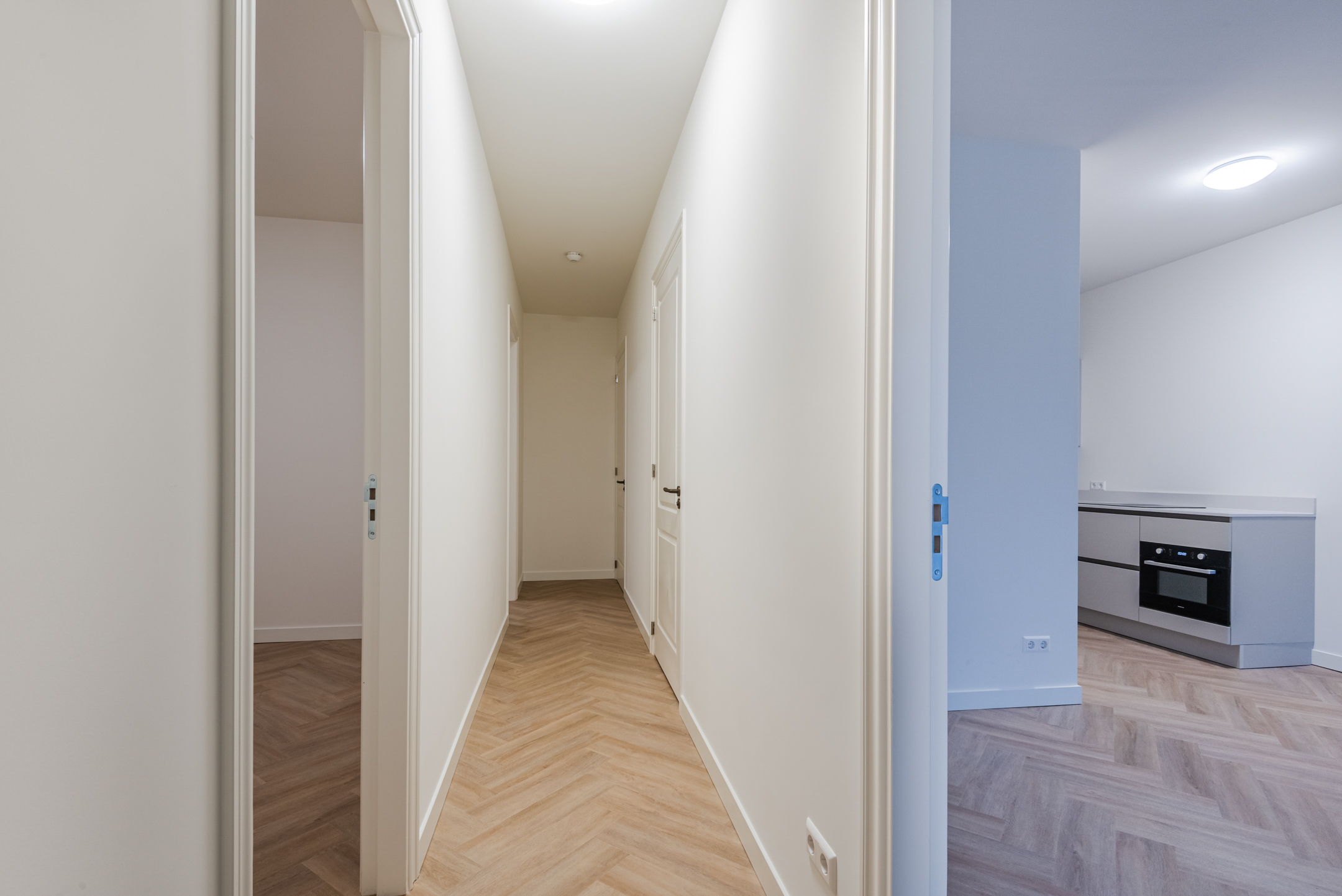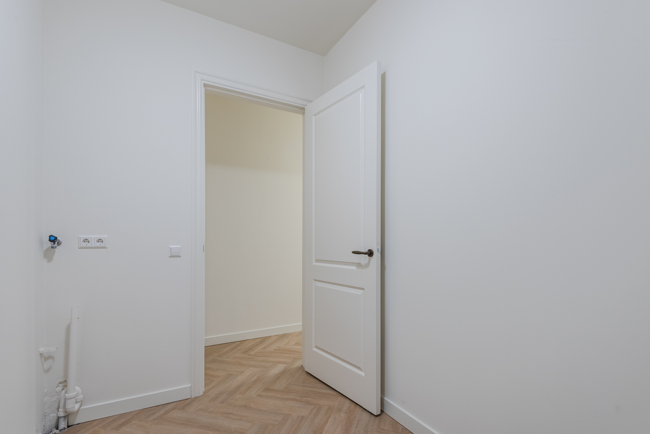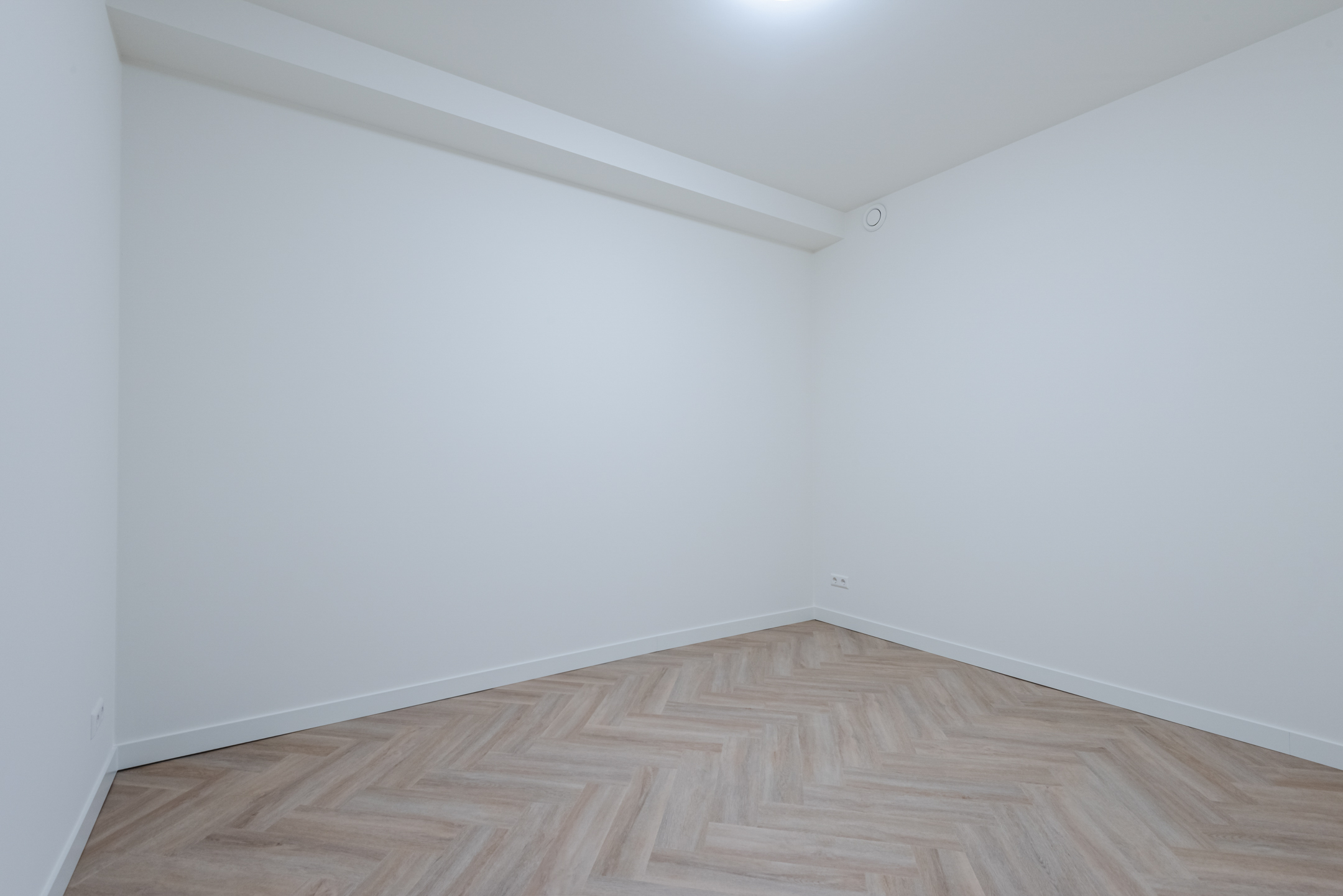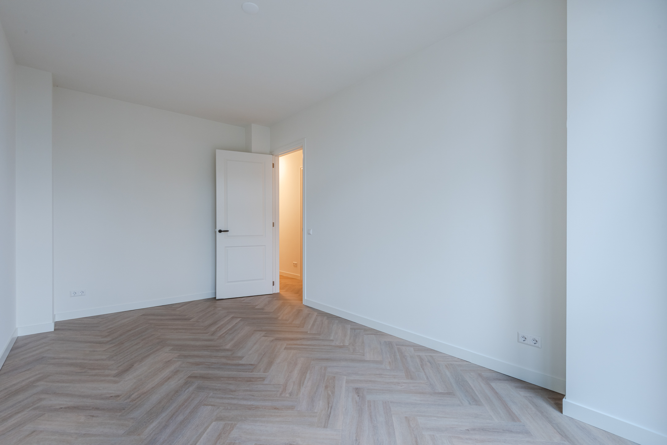 Het appartement beschikt over 1 slaapkamer van een goed formaat met grote raampartijen, zeer ruime berging, een aparte wasruimte, luxe badkamer met wastafel met meubel, verlichte spiegel en een inloopregendouche en het separate (gasten)toilet met fonteintje.
