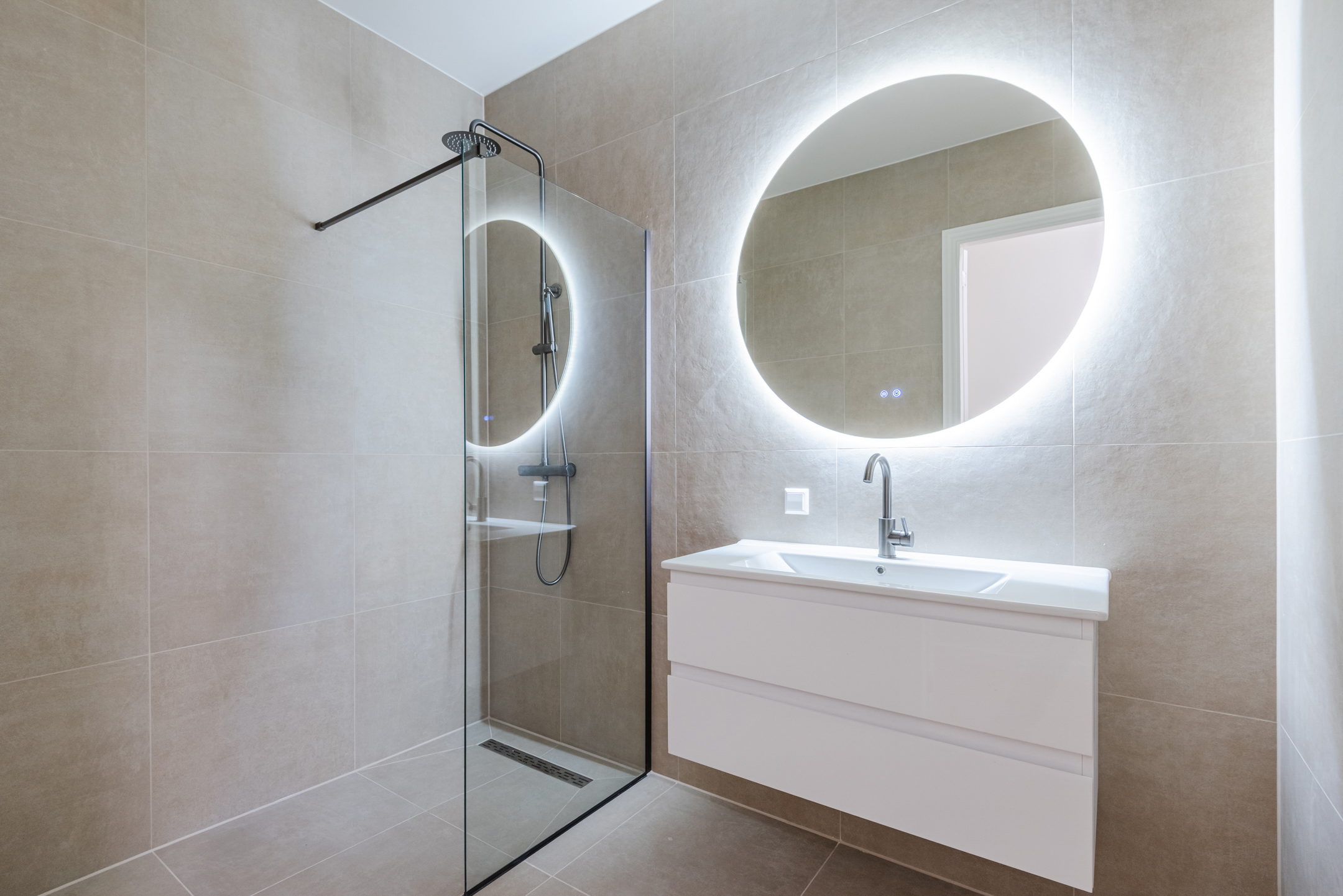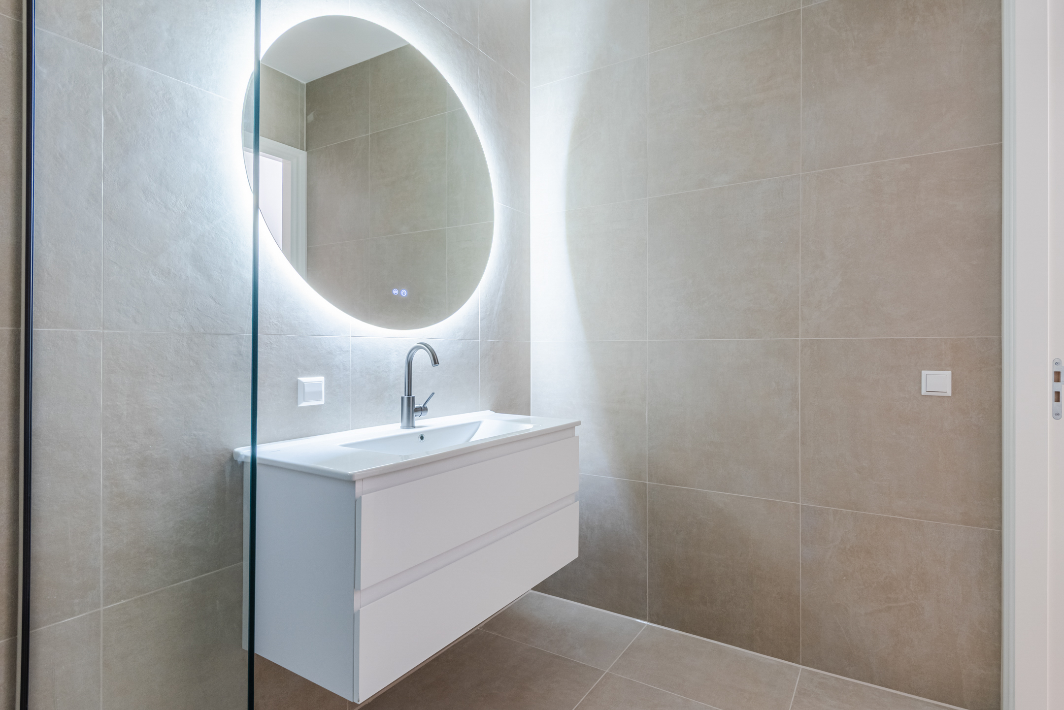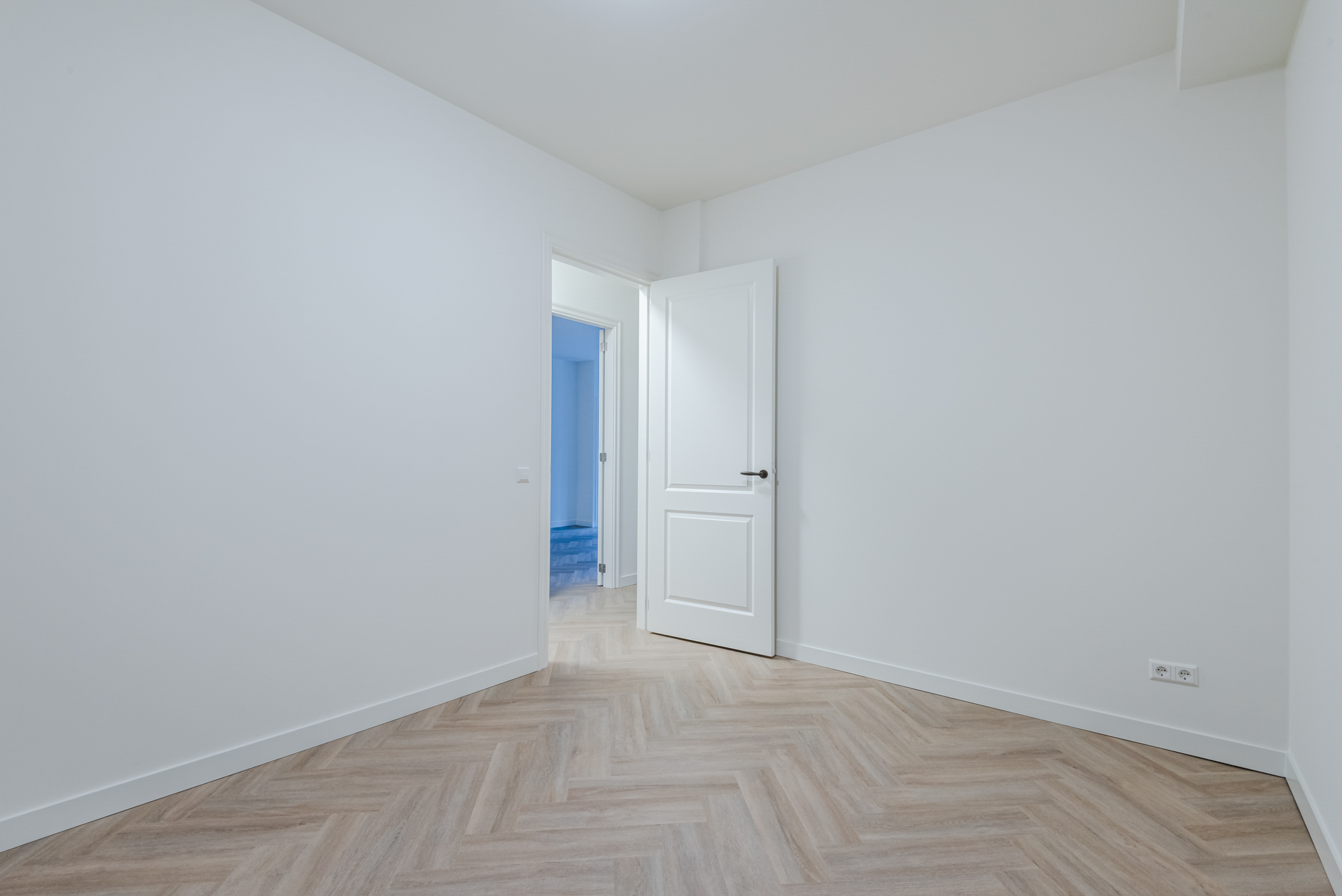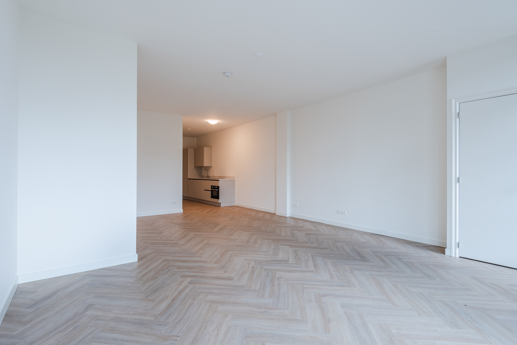 Het appartement beschikt over 1 slaapkamer van een goed formaat met grote raampartijen, zeer ruime berging, een aparte wasruimte, luxe badkamer met wastafel met meubel, verlichte spiegel en een inloopregendouche en het separate (gasten)toilet met fonteintje.