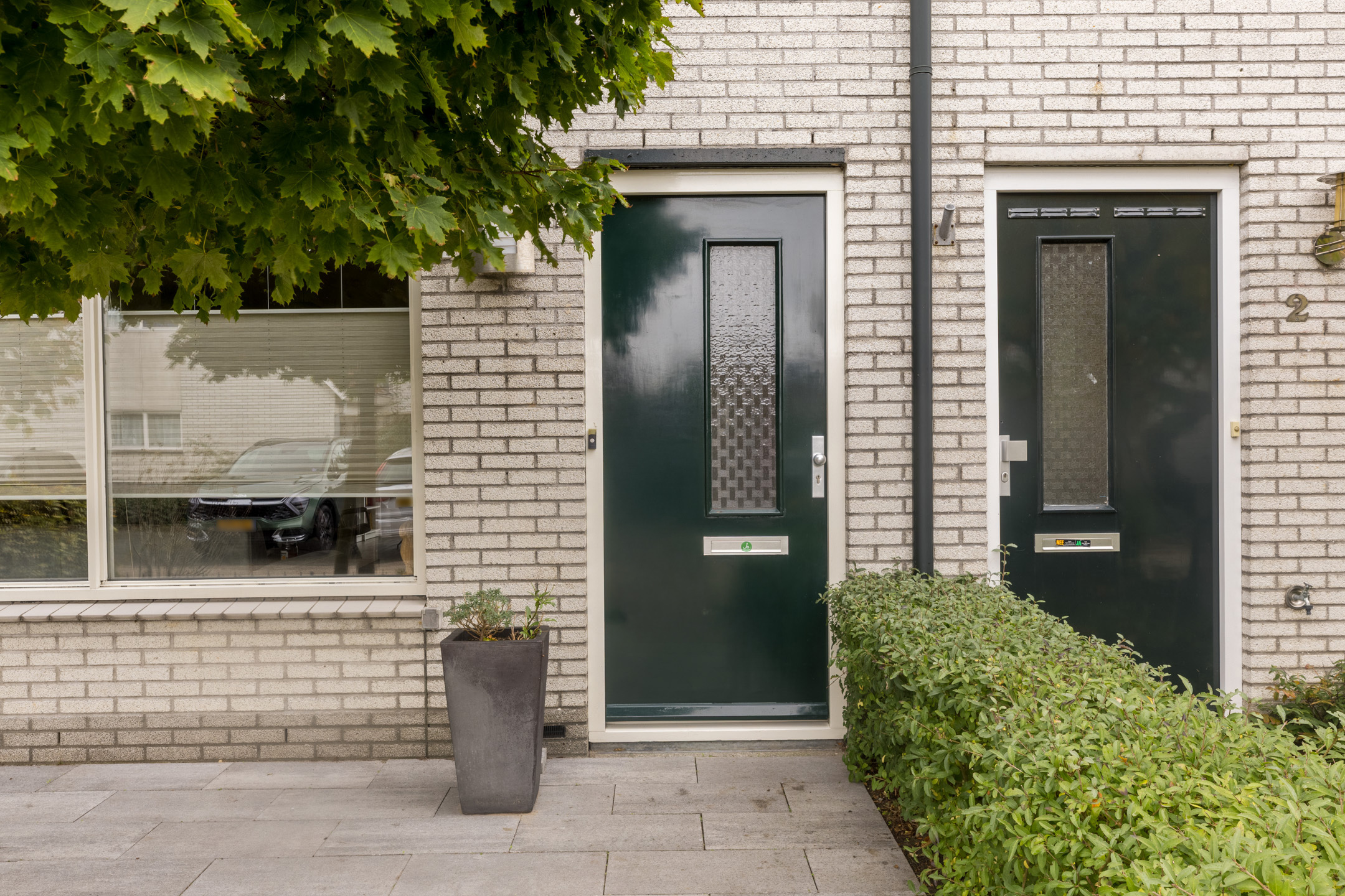 Via de ruime voortuin met groene borders en een betegeld pad bereiken we de voordeur van de woning.