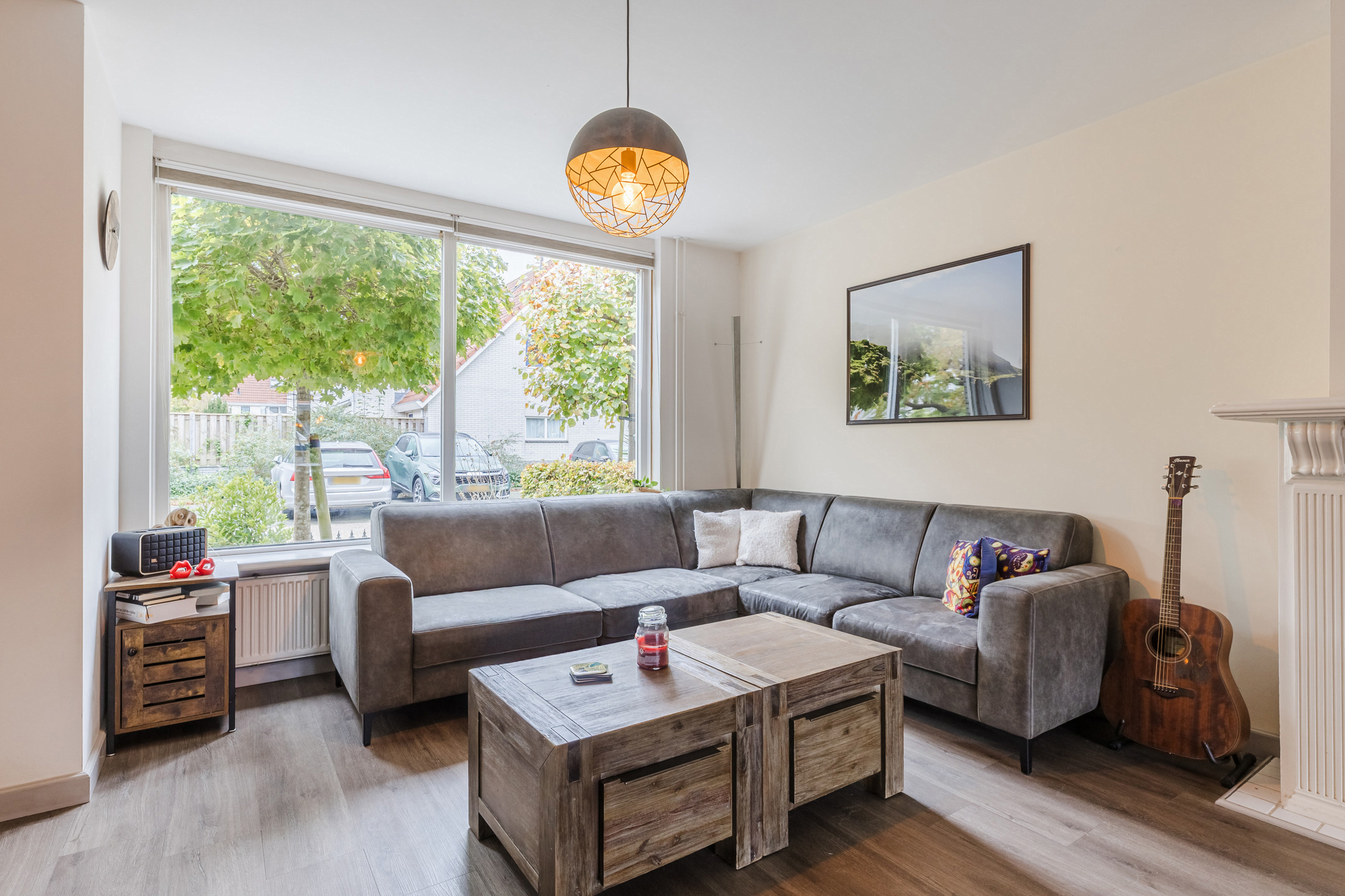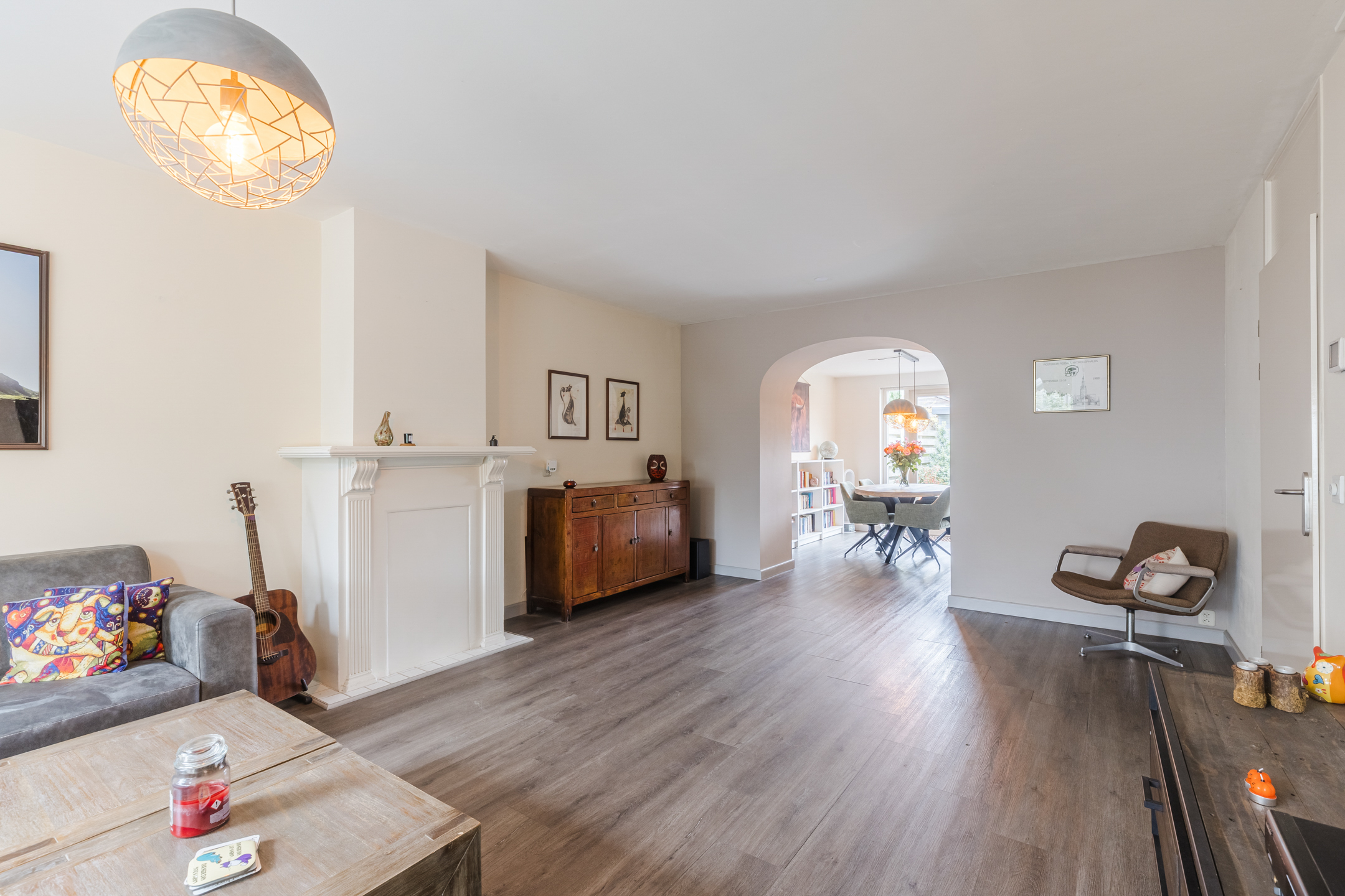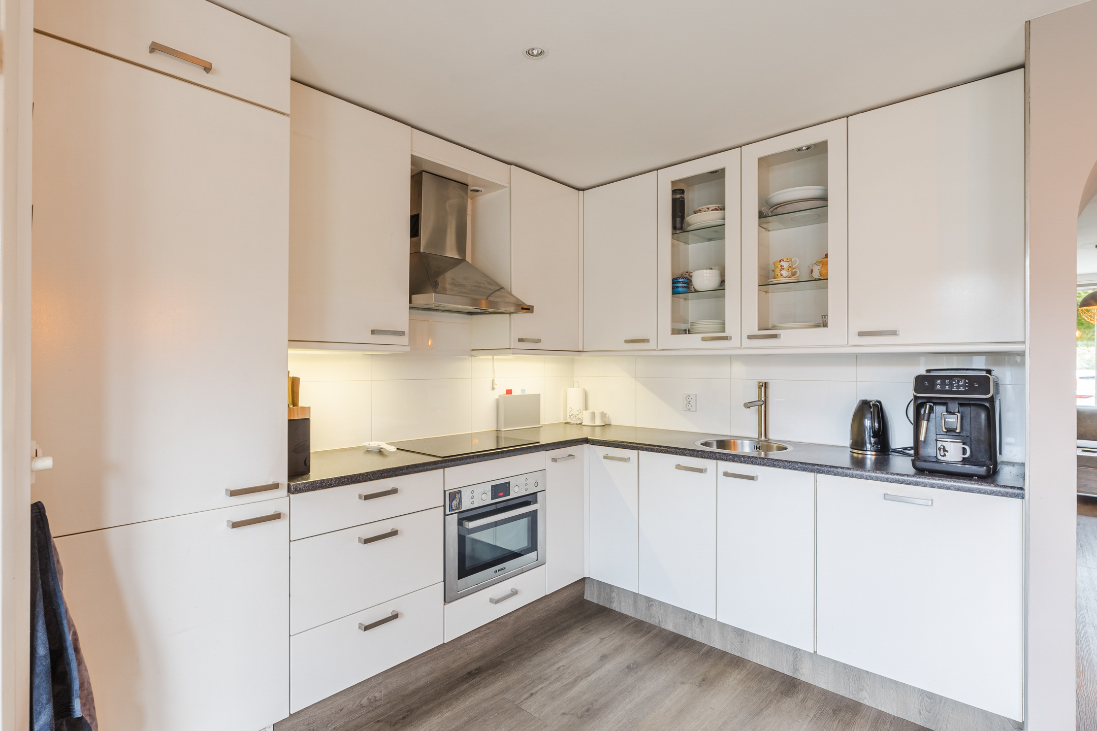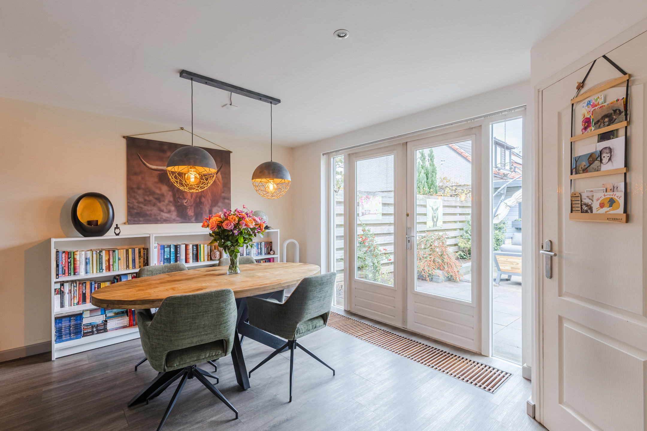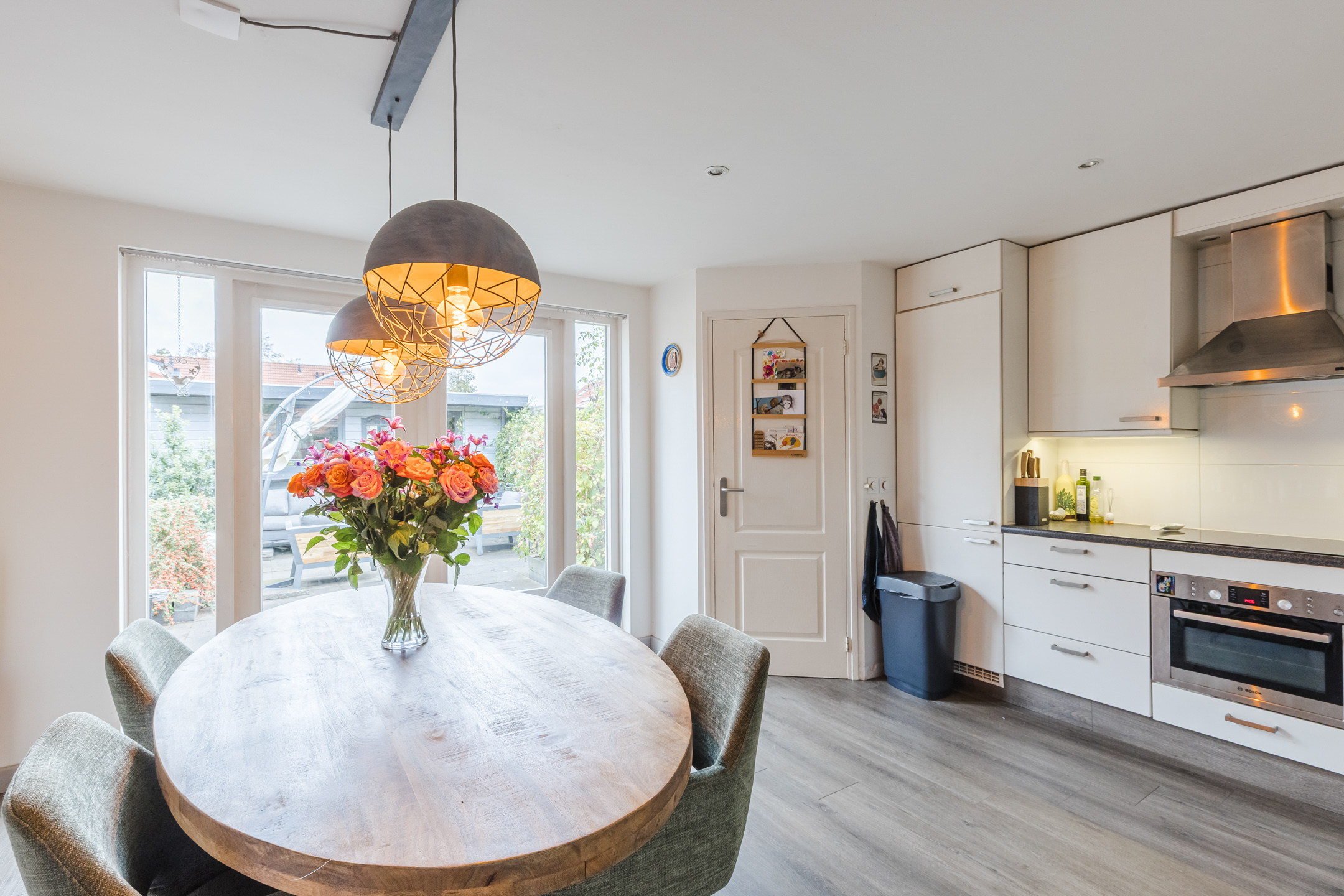 De sfeervolle woonkamer geniet van een prettige hoeveelheid lichtinval en biedt via een open toog toegang tot de keuken die zich aan de tuinzijde van de woning bevindt. De keuken is voorzien van een inductiekookplaat, oven (Bosch), koelkast, vriezer en een vaatwasser.
