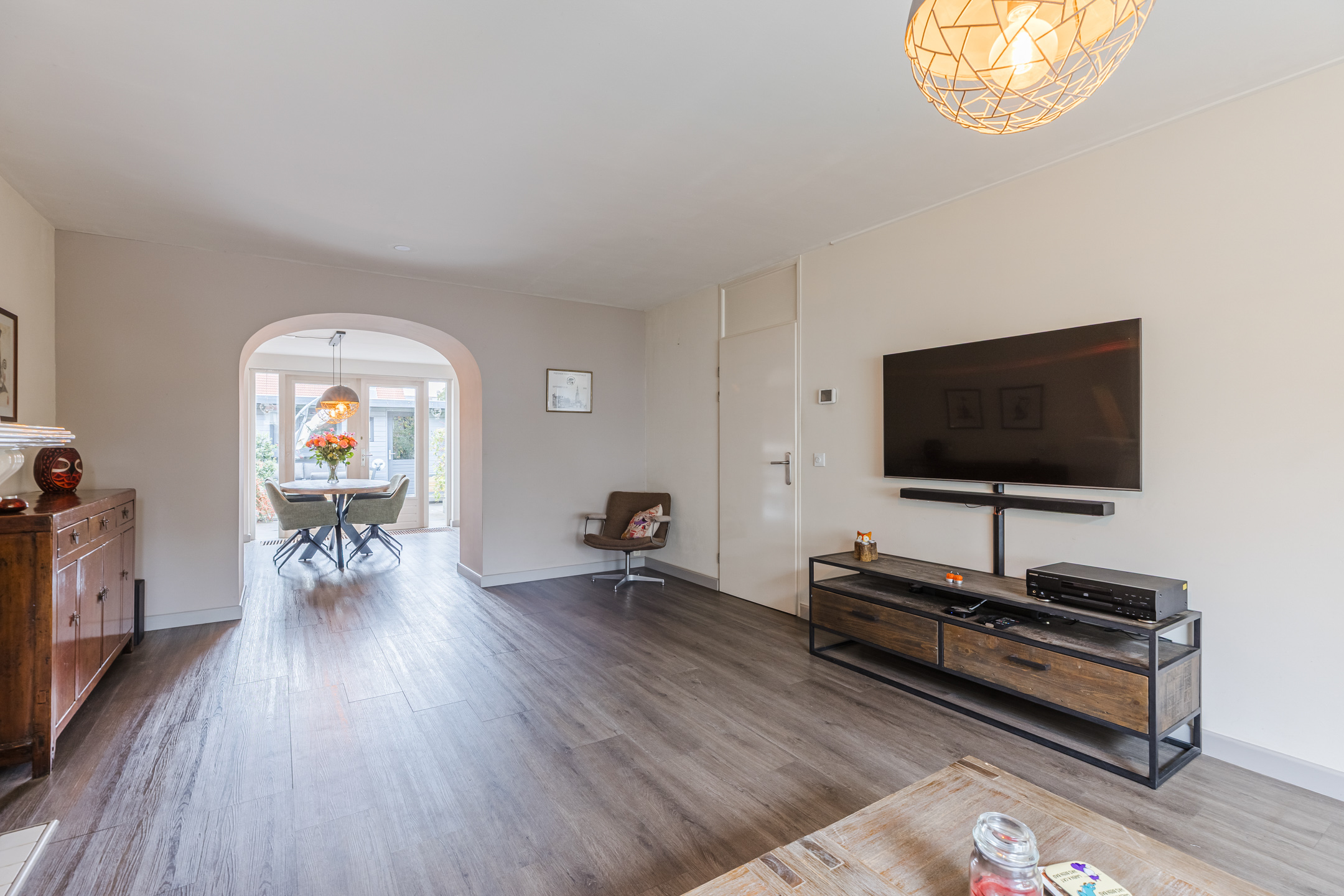 Openslaande deuren bieden toegang tot de tuin en de begane grond is fraai afgewerkt met een PVC-laminaatvloer met daaronder een houten vloer.