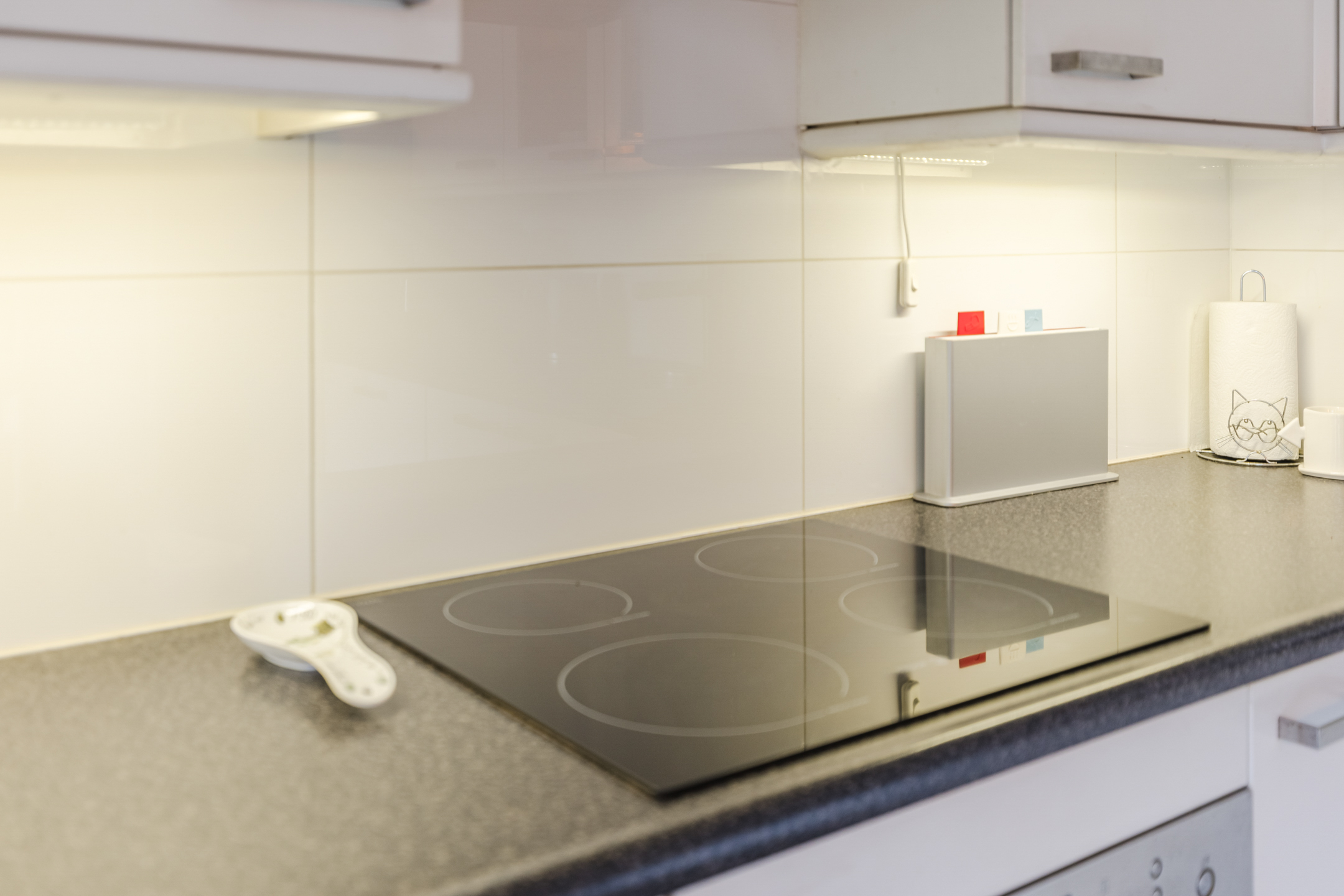 The cosy living room enjoys a pleasant amount of natural light and via an open arch there is access to the kitchen, which is located on the garden side of the house. The kitchen is equipped with an induction hob, oven (Bosch), fridge, freezer and a dishwasher.