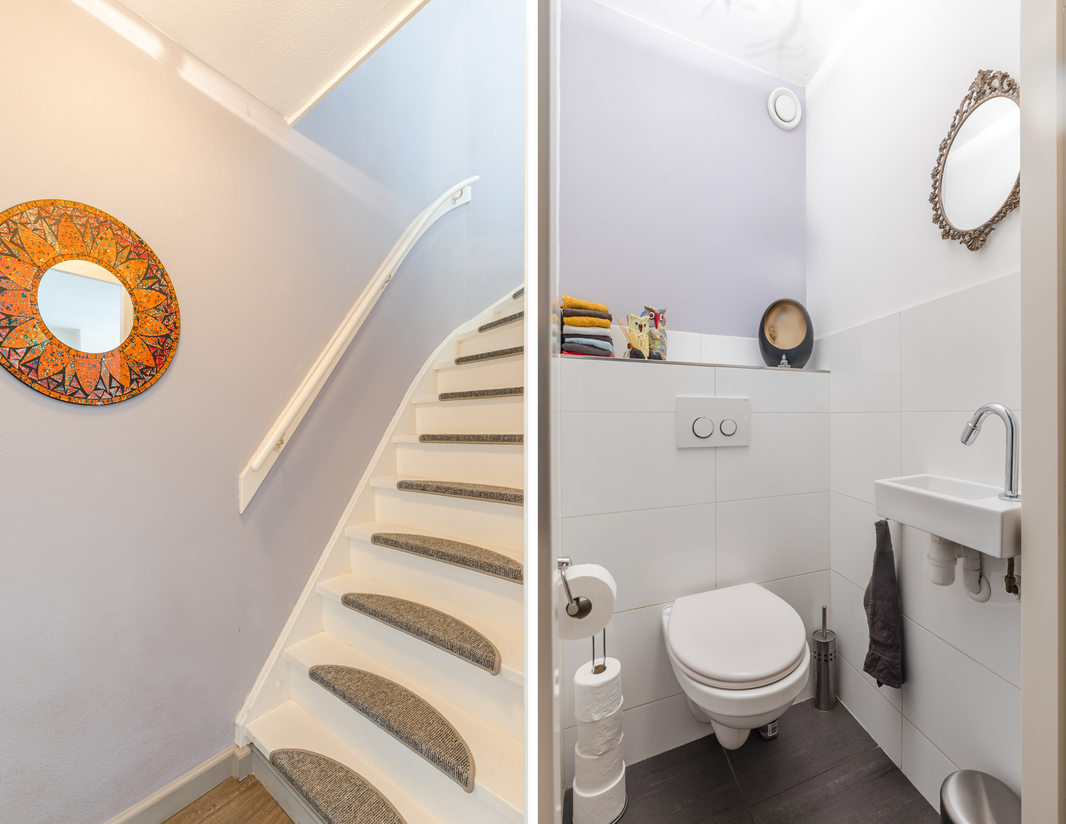 Vanuit de keuken is er toegang tot een aparte hal met extra achterdeur en vanuit de woonkamer is er toegang tot een hal met aldaar het gastentoilet met fonteintje en de trapopgang naar de eerste verdieping.