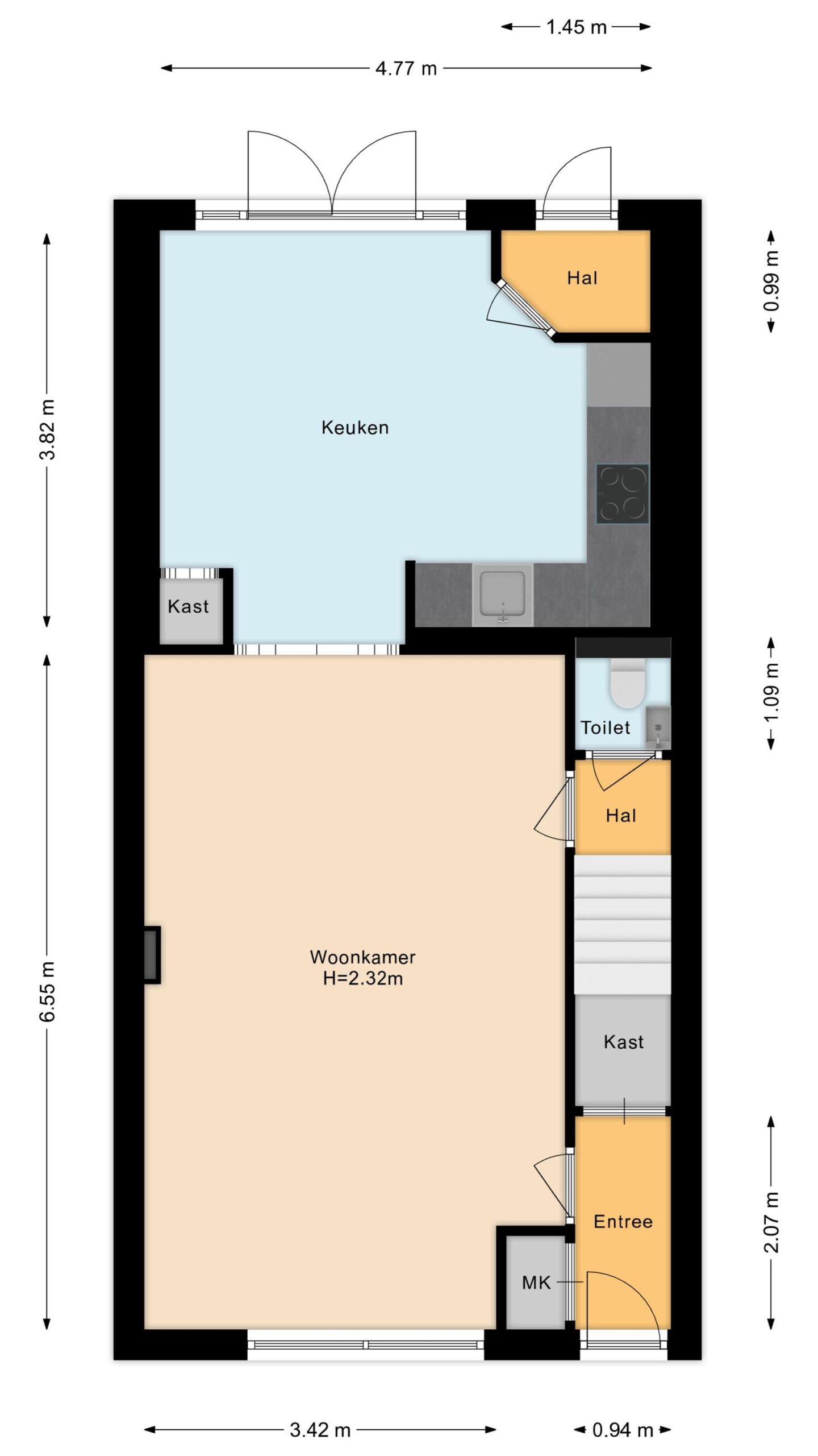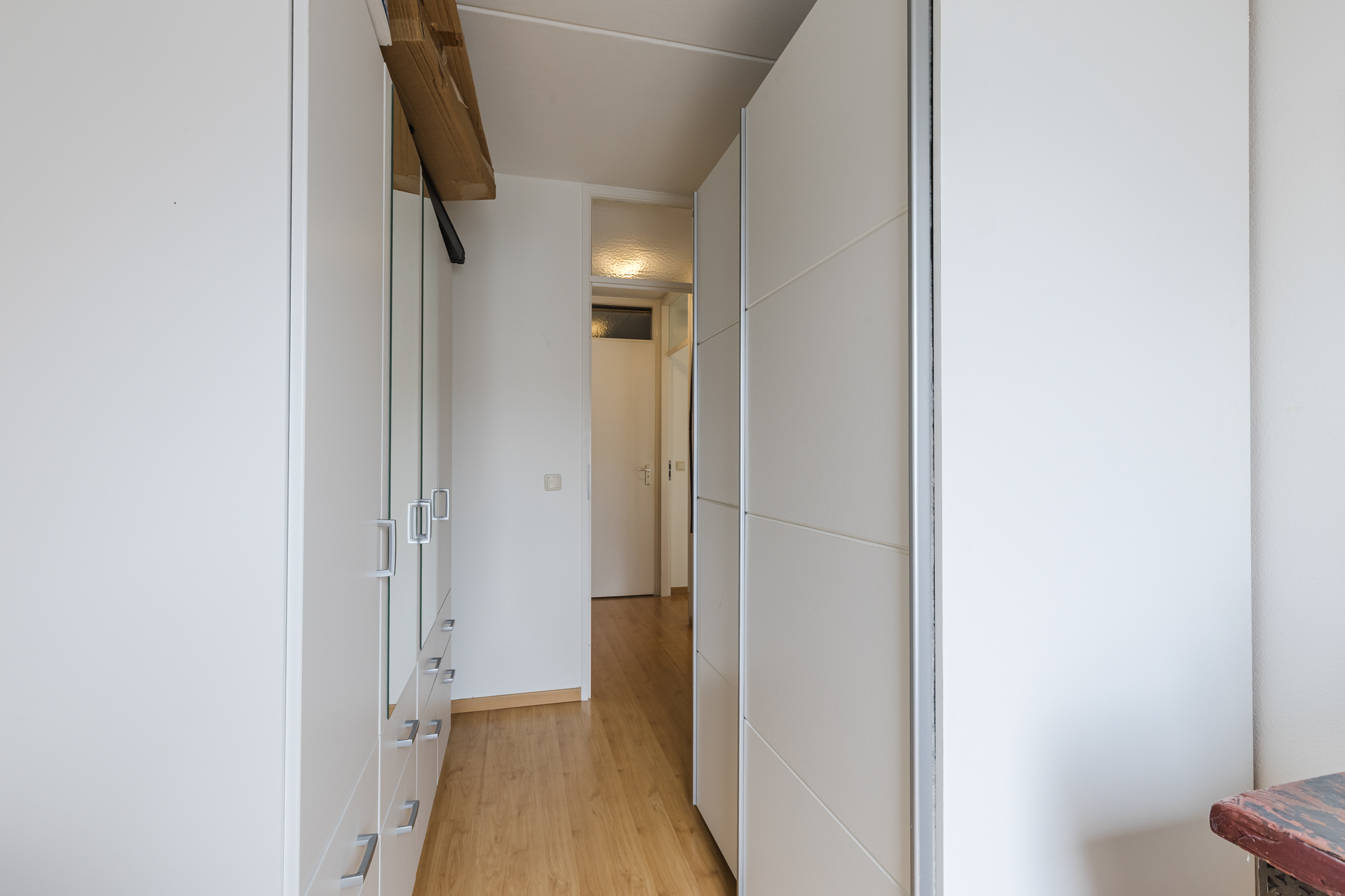 Achter de voordeur vinden we de compacte entreehal met trapkast en de meterkast, die toegang biedt tot de woonkamer.